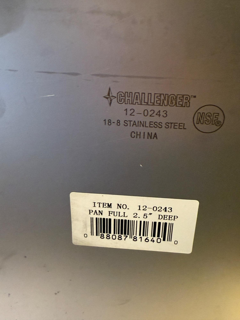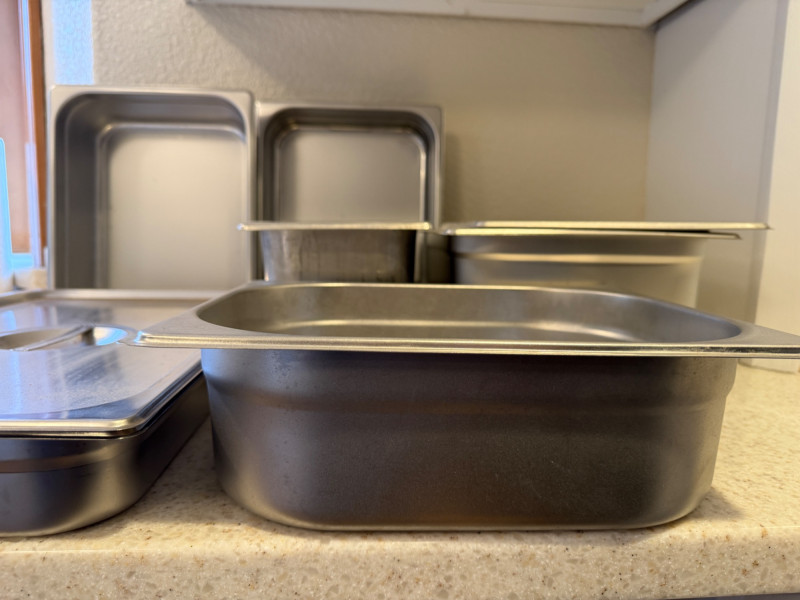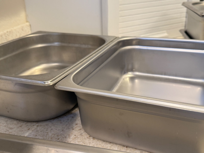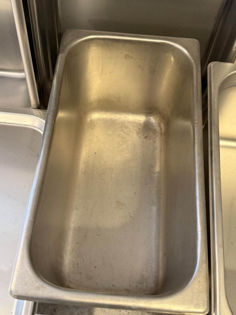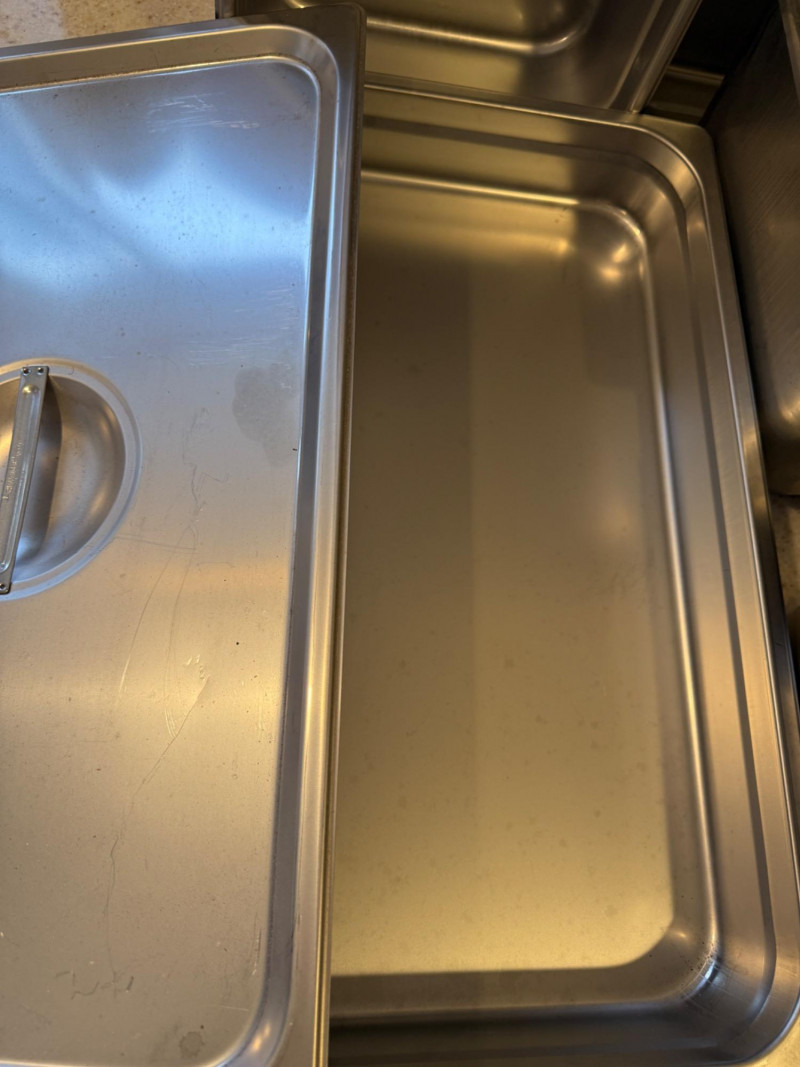 (6) Stainless Steel Steam Table Pans With 2 Lids 12.75”x21”x2.5” shallow pan with lid 10.5”x13” pans with 1 lid. 2.5”, 4”,4” & 6” deep. 6.75”x12.5”x6” deep