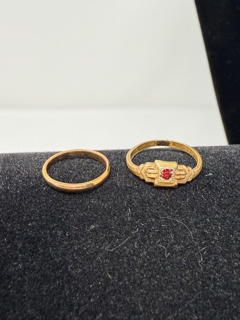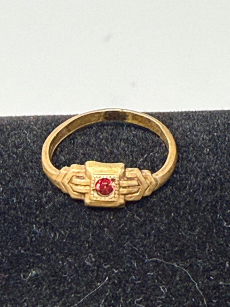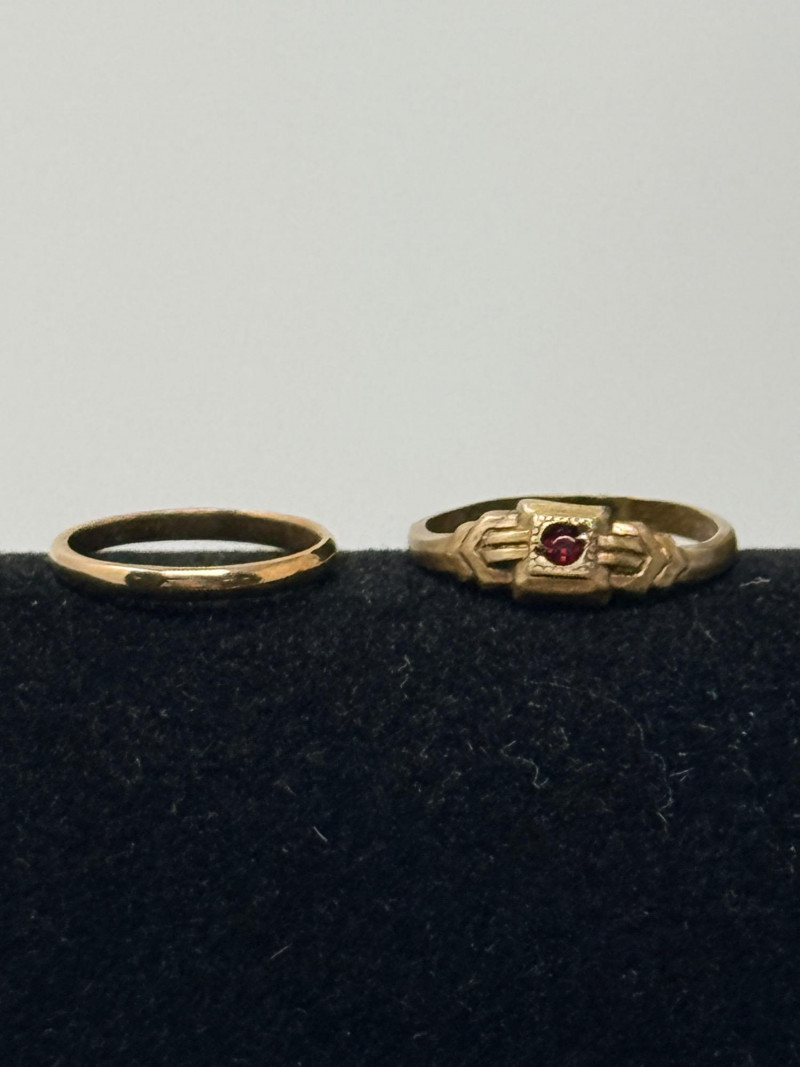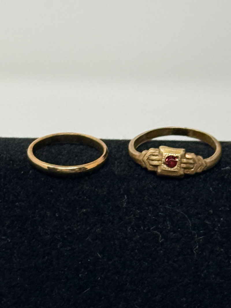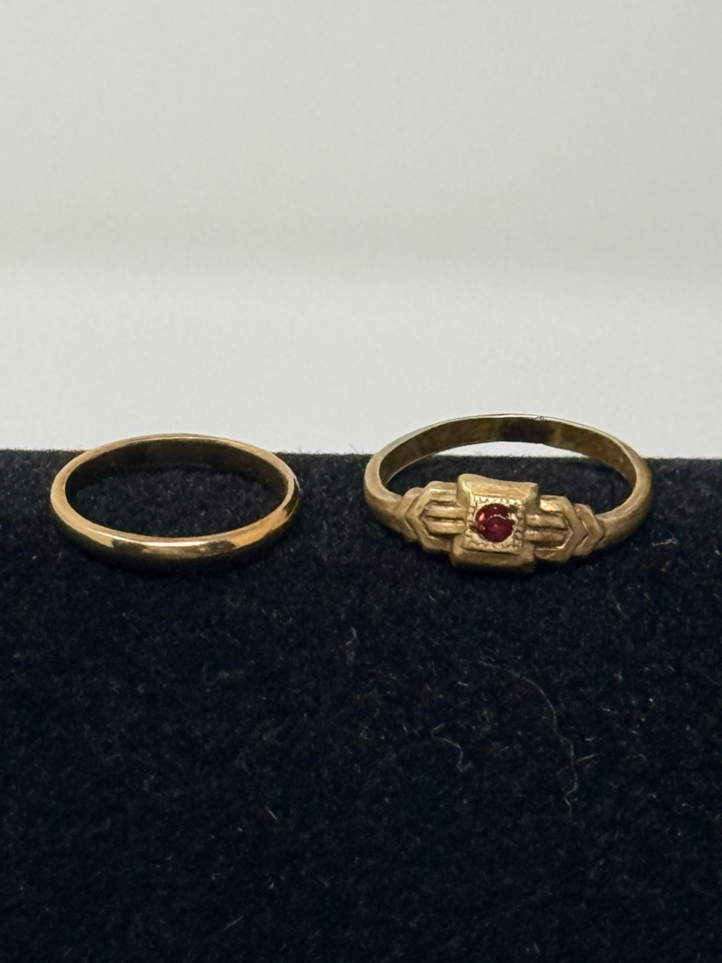 2 vintage or antique baby rings, one featuring a small red gemstone, possibly a ruby or garnet in copper, set in a geometric, Art Deco style. The specific design, with a square central setting and arrow-like detailing on the shoulders, is characteristic of early to mid-20th-century craftsmanship. 1.5mm band and 15mm diameter. The front tilts slightly forward. 10K Gold band is 1mm wide with 12mm diameter.