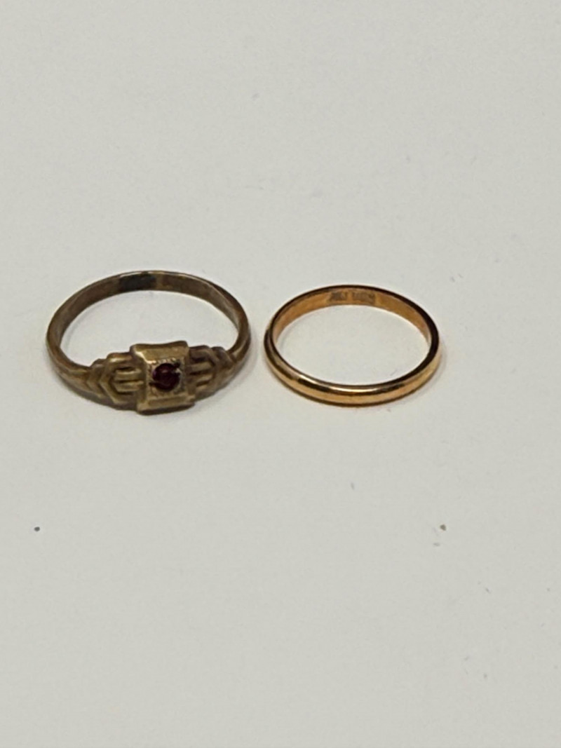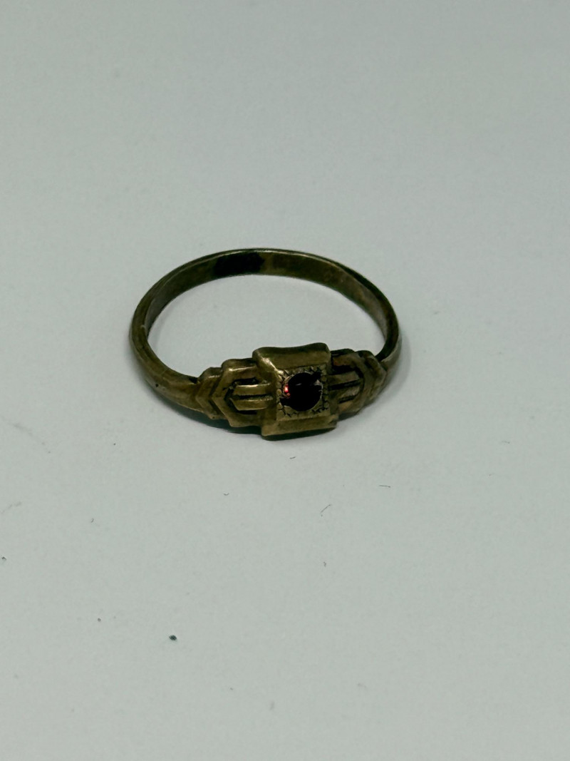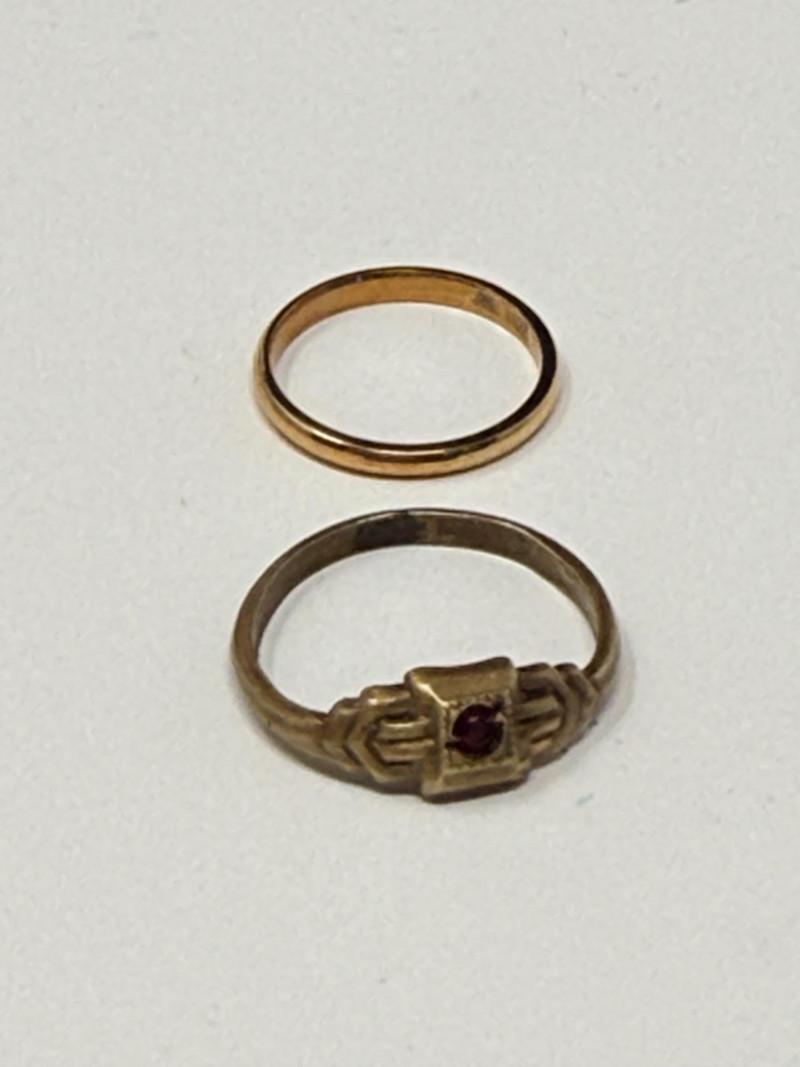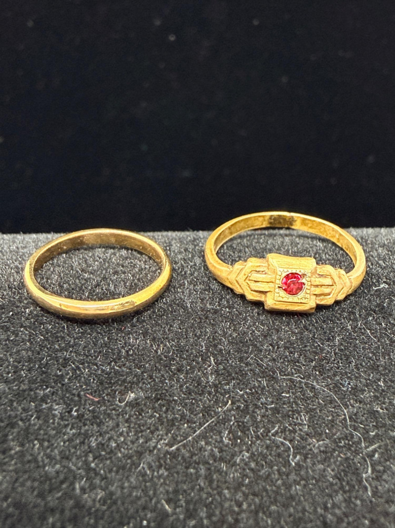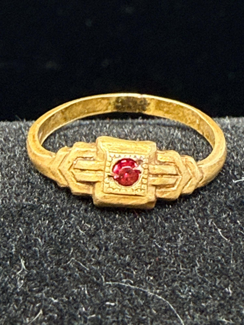 2 vintage or antique baby rings, one featuring a small red gemstone, possibly a ruby or garnet in copper, set in a geometric, Art Deco style. The specific design, with a square central setting and arrow-like detailing on the shoulders, is characteristic of early to mid-20th-century craftsmanship. 1.5mm band and 15mm diameter. The front tilts slightly forward. 10K Gold band is 1mm wide with 12mm diameter.