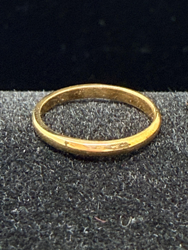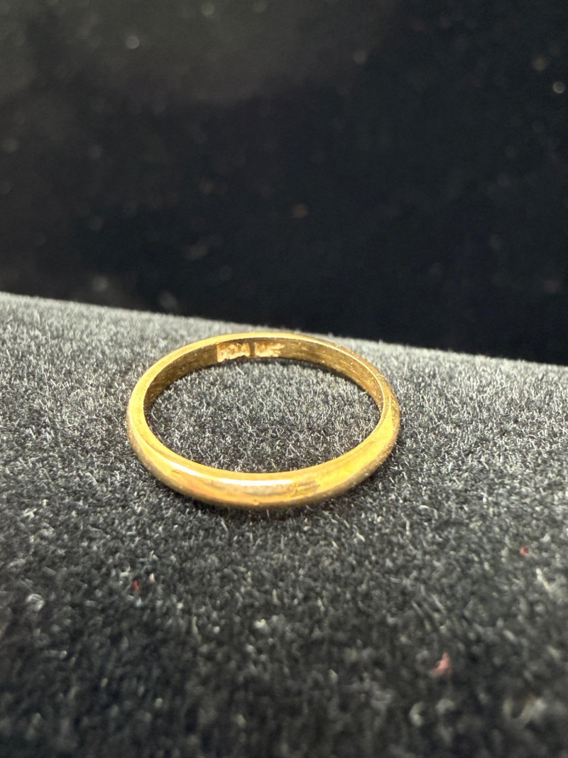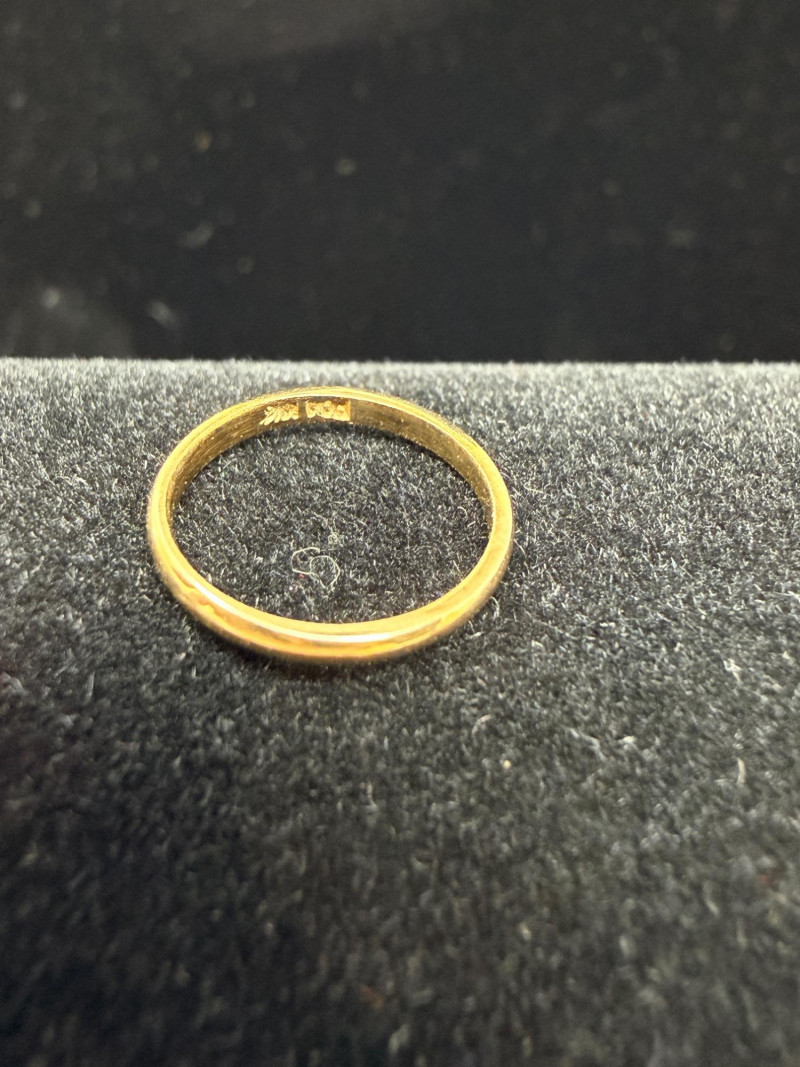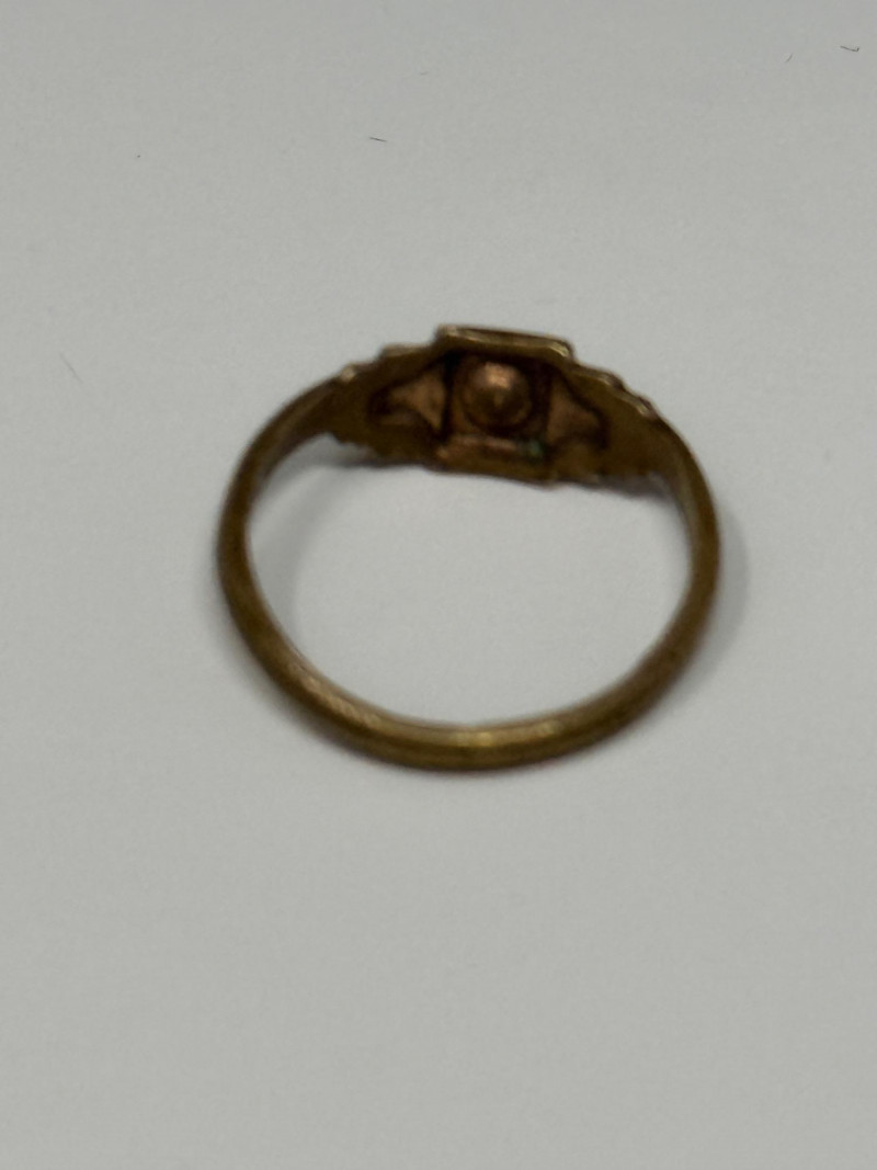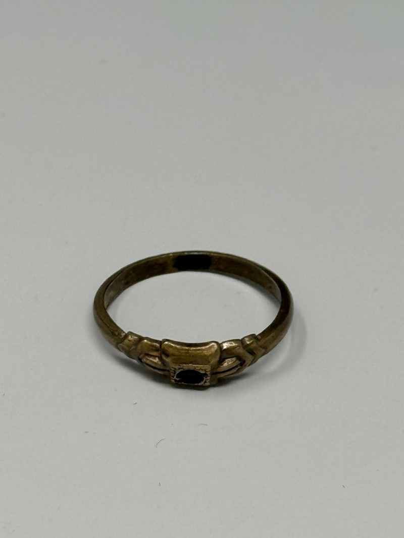 2 vintage or antique baby rings, one featuring a small red gemstone, possibly a ruby or garnet in copper, set in a geometric, Art Deco style. The specific design, with a square central setting and arrow-like detailing on the shoulders, is characteristic of early to mid-20th-century craftsmanship. 1.5mm band and 15mm diameter. The front tilts slightly forward. 10K Gold band is 1mm wide with 12mm diameter.