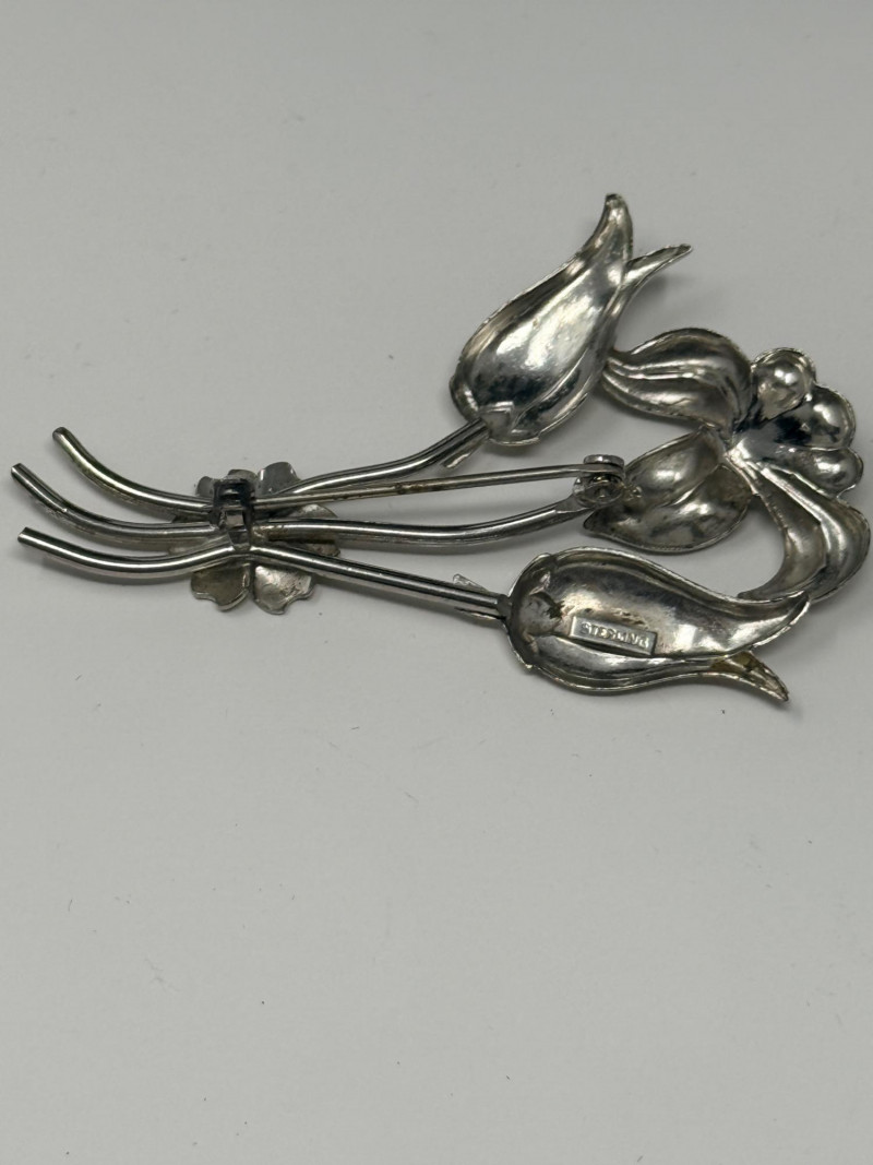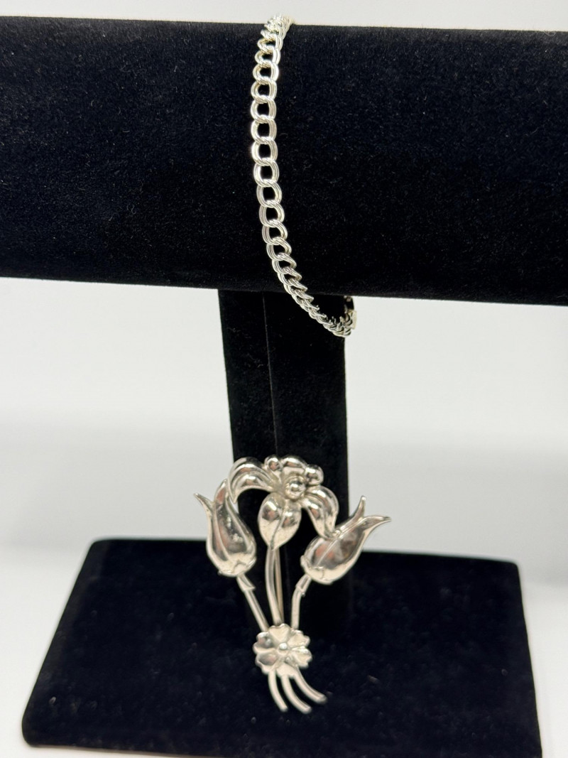 Sterling Silver Double Chain Bracelet & Mexican Flower Bouquet Brooch
