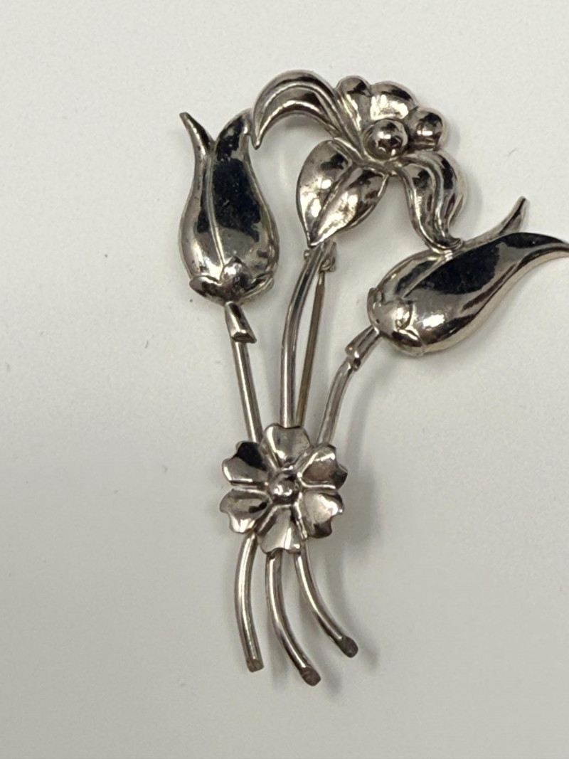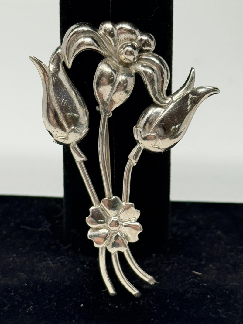 Vintage sterling silver flower brooch, potentially from a Mexican silversmith like Hector Aguilar or Damasco Gallegos. 2.5”x1.75”