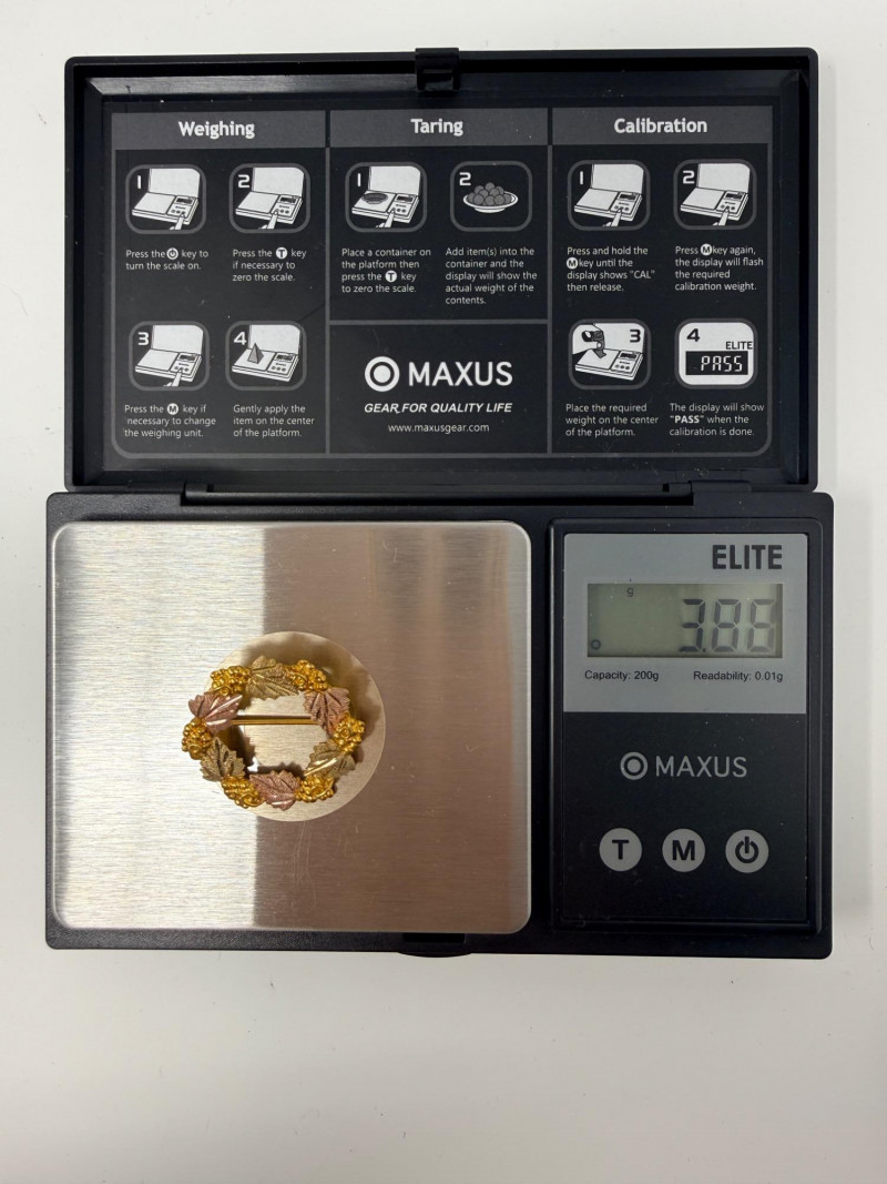 Vintage Landstrom’s Black Hills Gold brooch featuring a grape-leaf wreath design. It is made of 10-karat yellow gold for the base and grape clusters, with hand-carved 12-karat rose (pink) and green gold leaves. This brooch measures 27mm and weighs 3.86 grams.