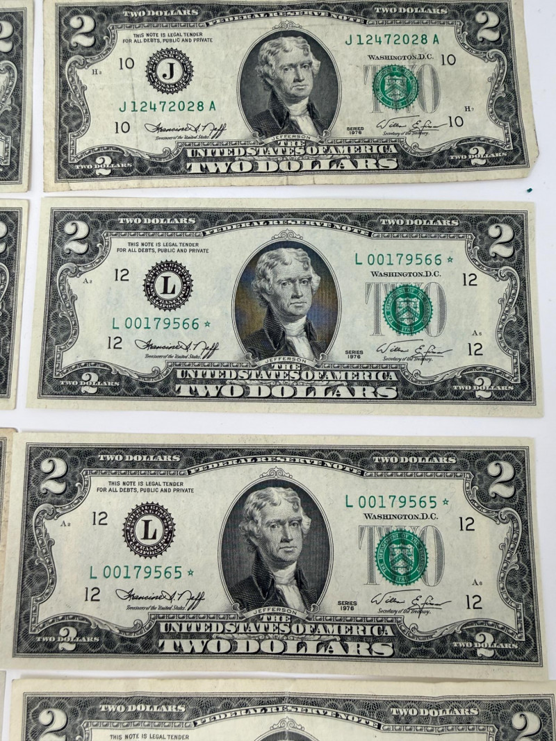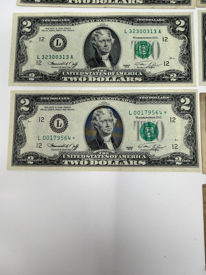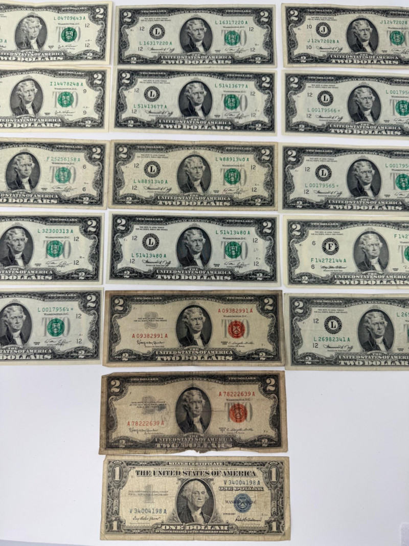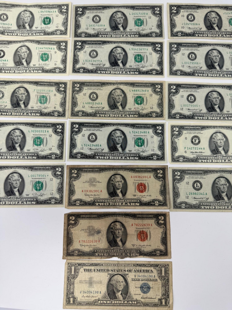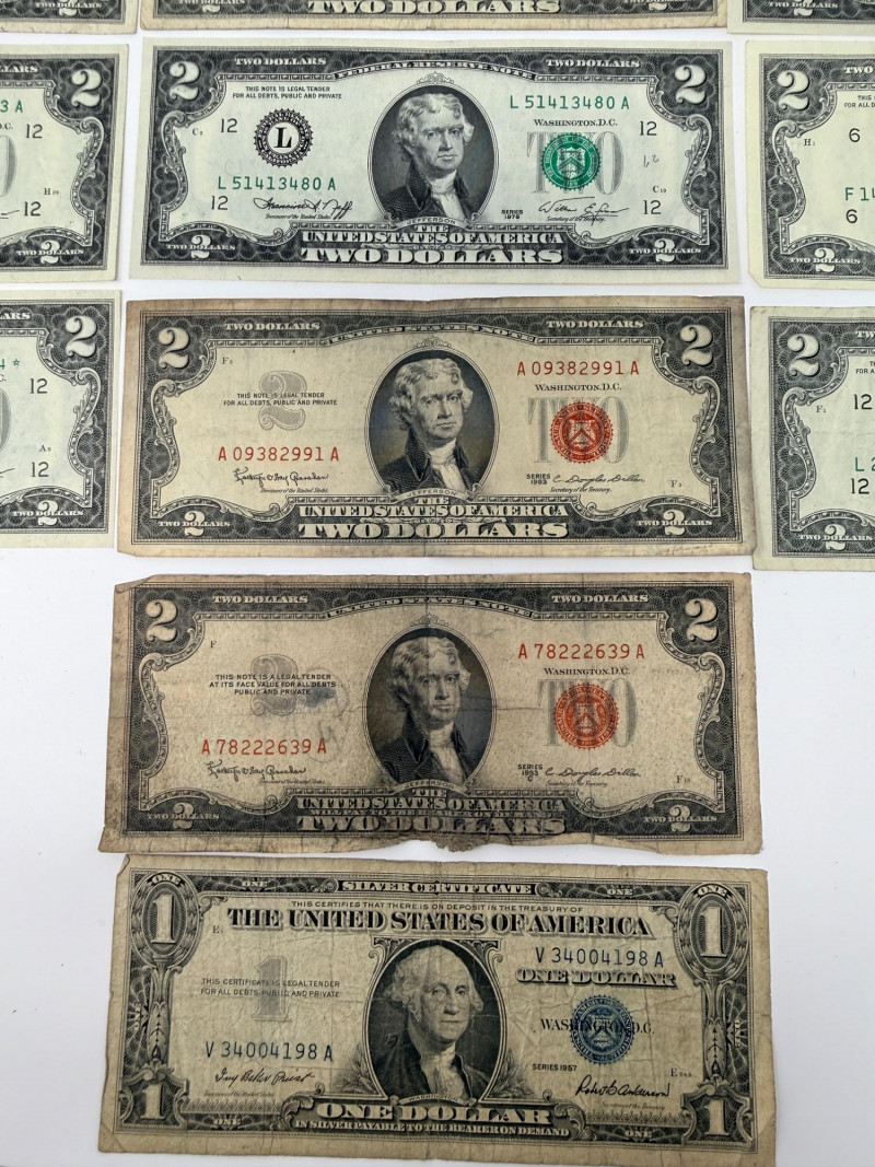 (11) Two dollar bills 1976, 1995, 2003 (3) Sequential 1976 Centennial Series $2 Star Notes (1) 1953c Two dollar bill with red ink (1) 1963 Two dollar bill with red ink (1) 1957 One Dollar Silver Certificate