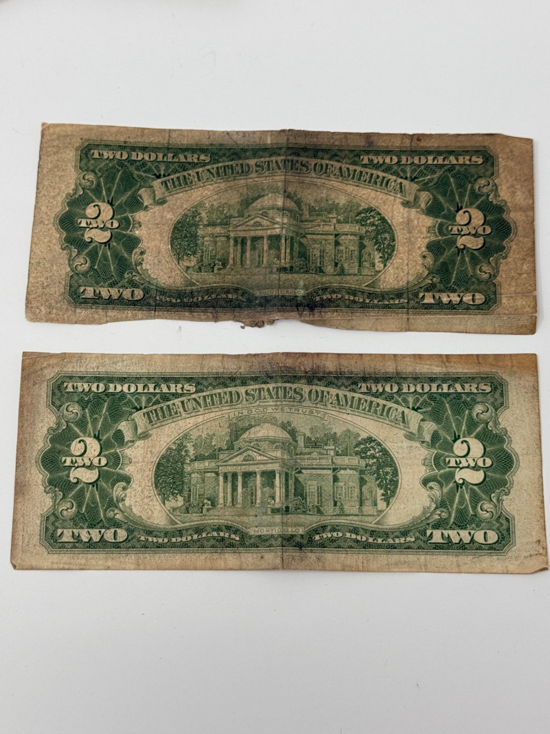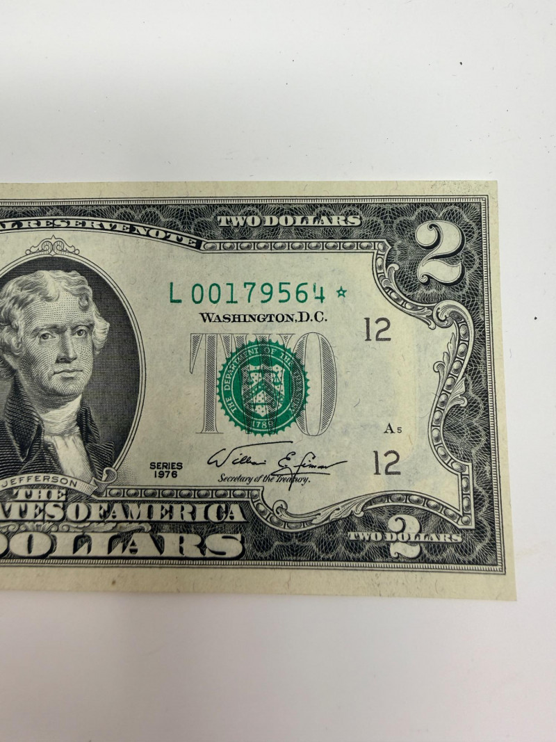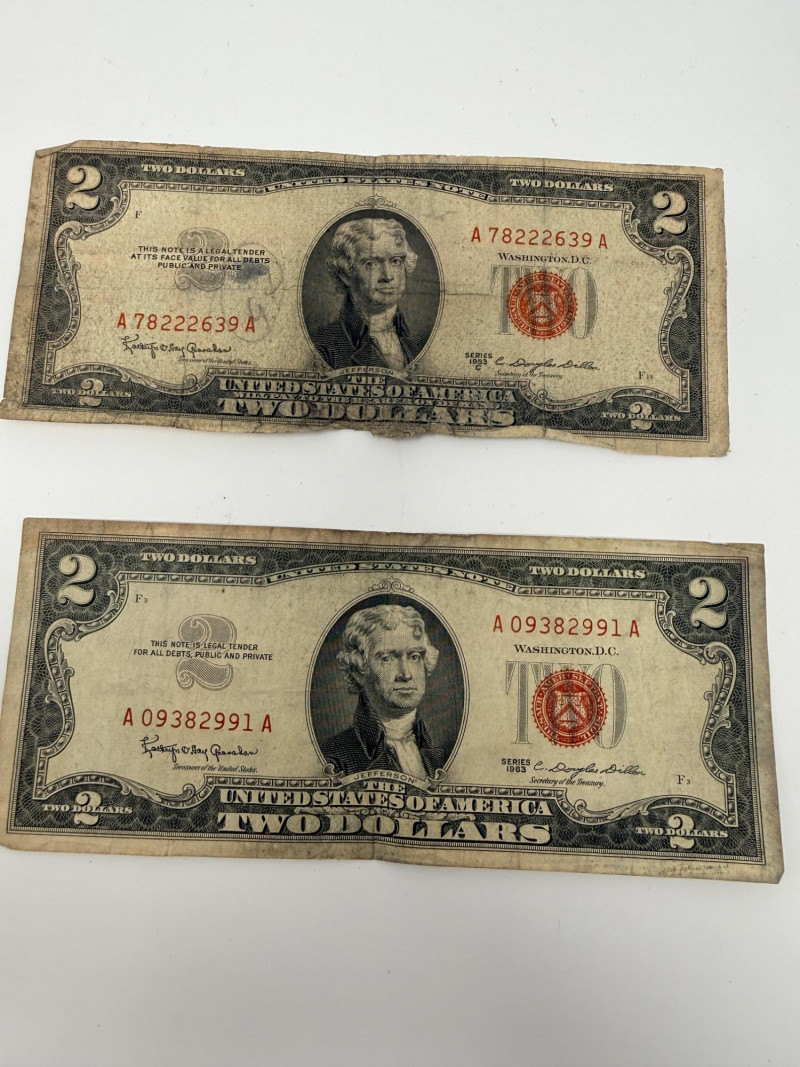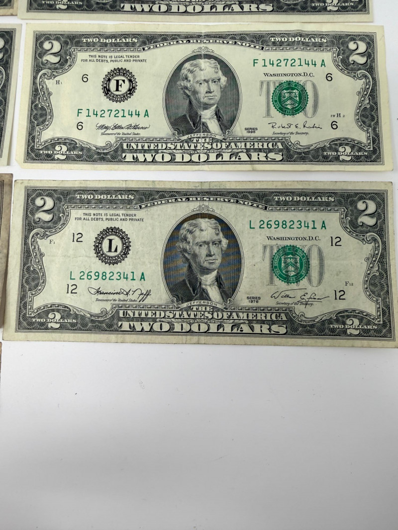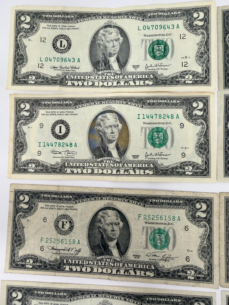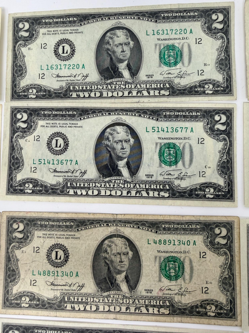 (11) Two dollar bills 1976, 1995, 2003 (3) Sequential 1976 Centennial Series $2 Star Notes (1) 1953c Two dollar bill with red ink (1) 1963 Two dollar bill with red ink (1) 1957 One Dollar Silver Certificate