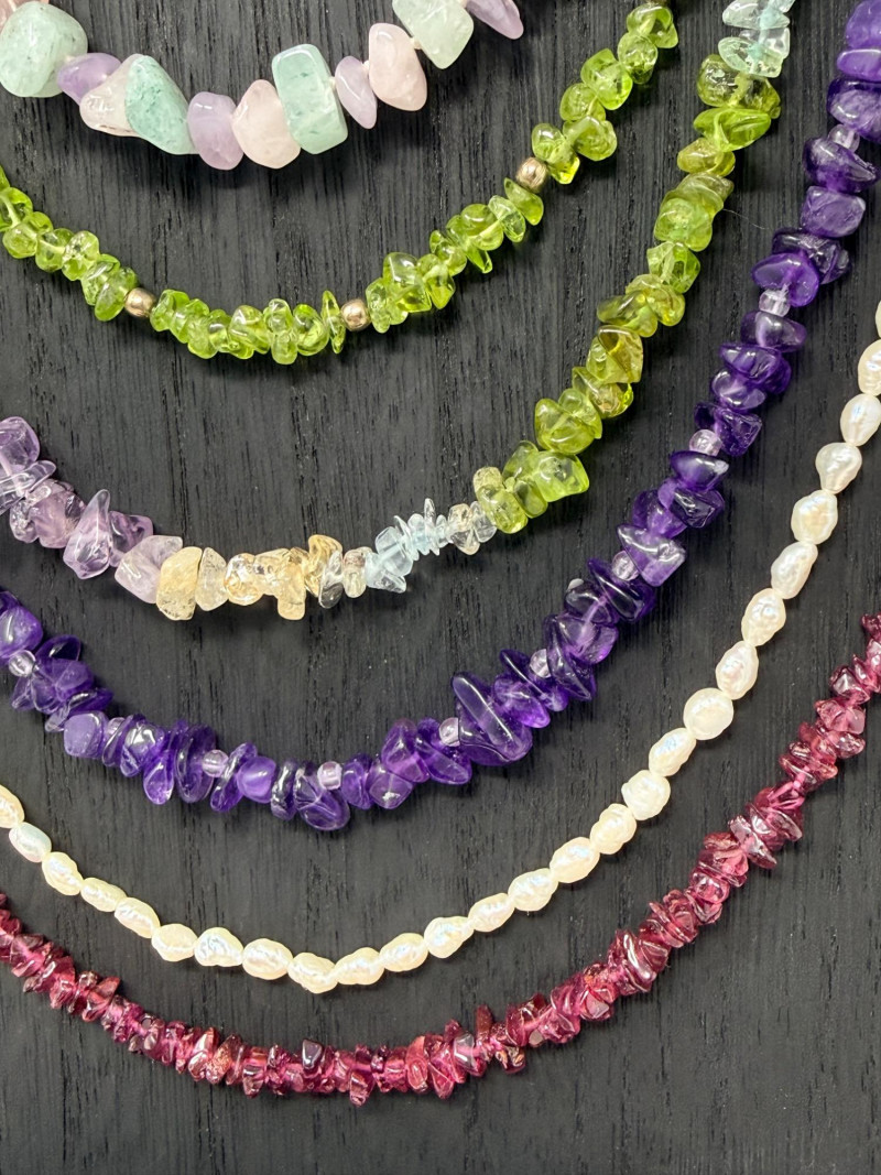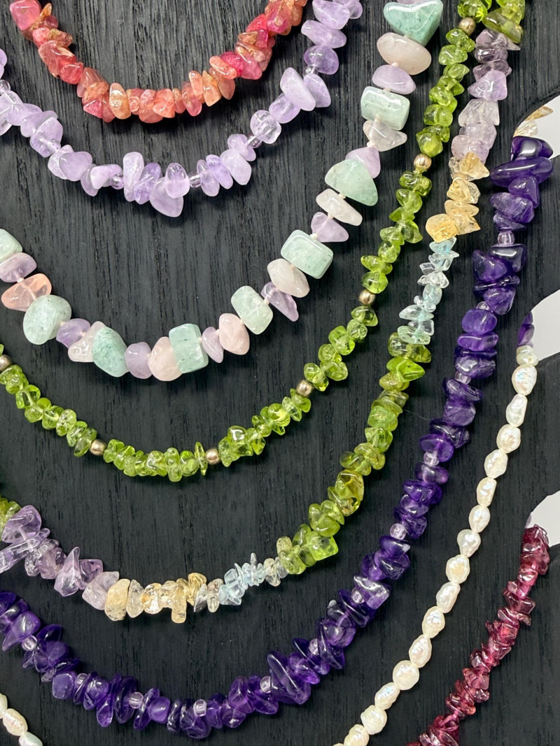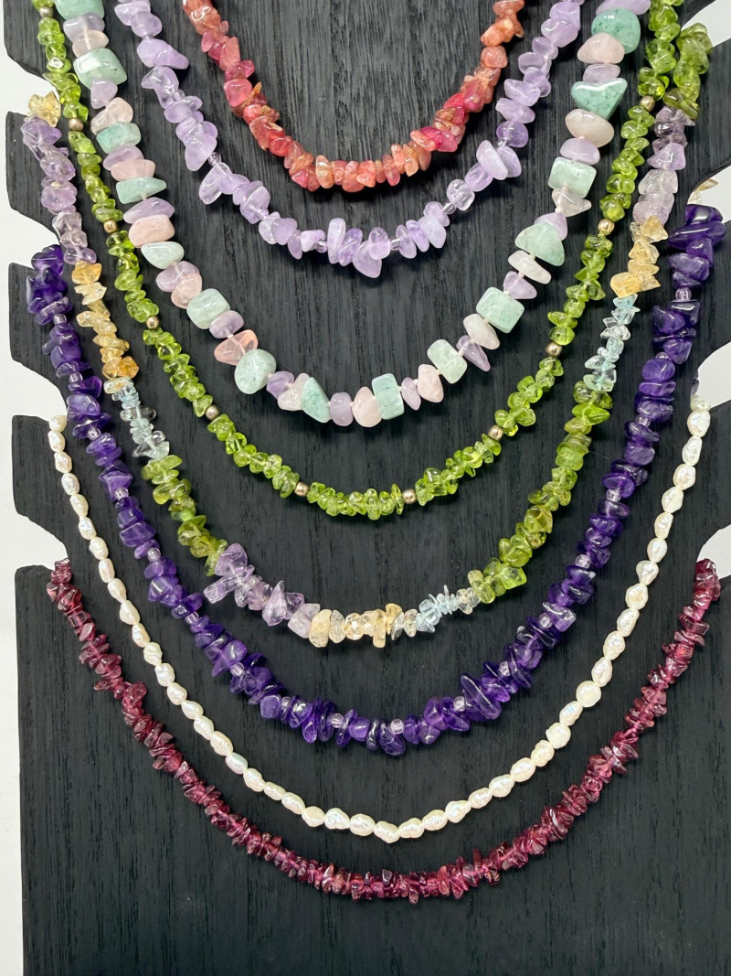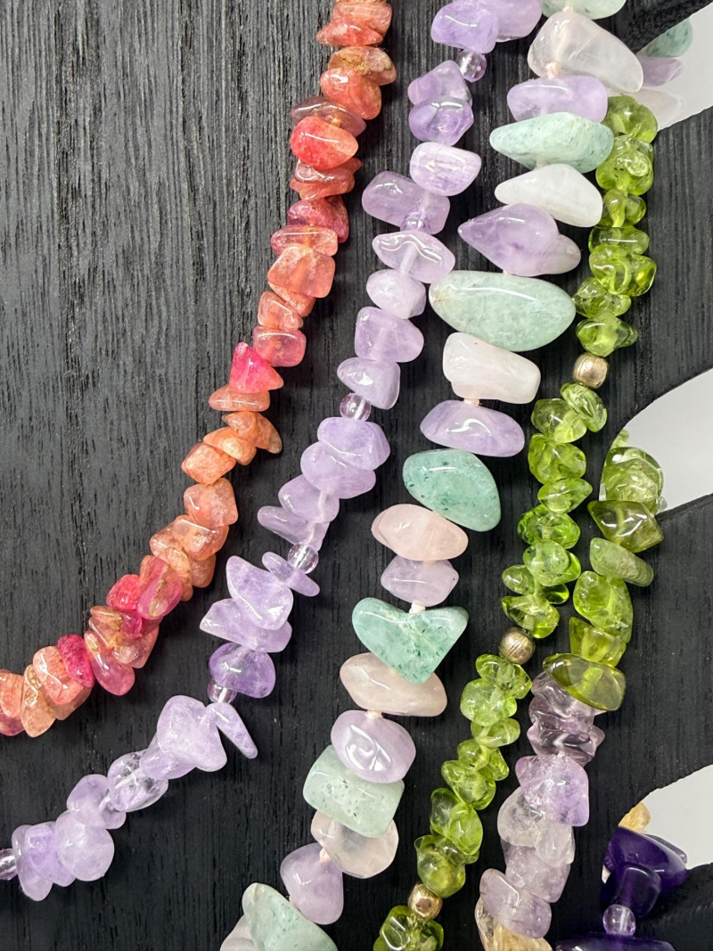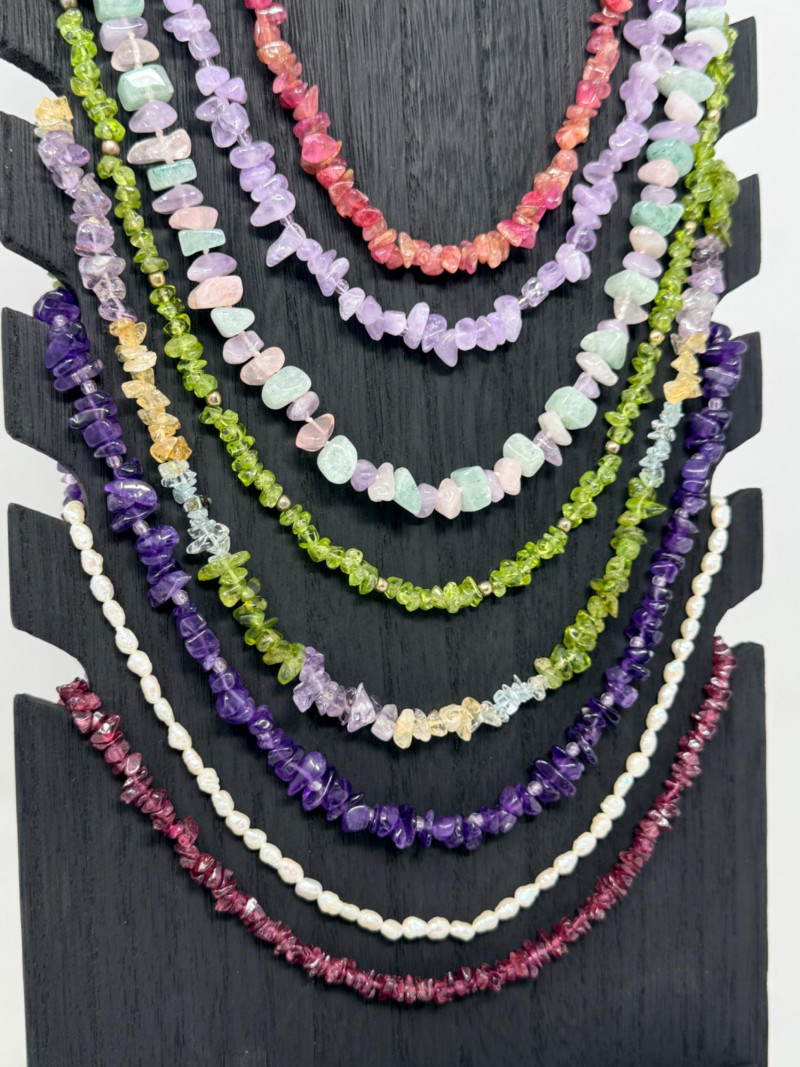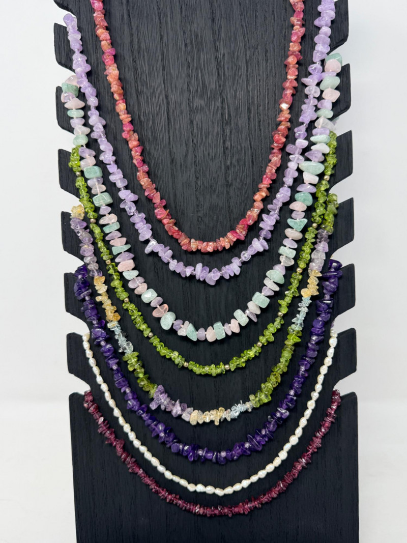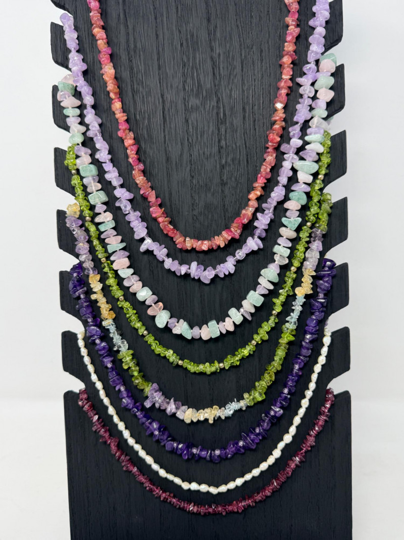 (8) Natural irregular freeform-shaped gemstone chip necklaces. 24”-36” lengths.