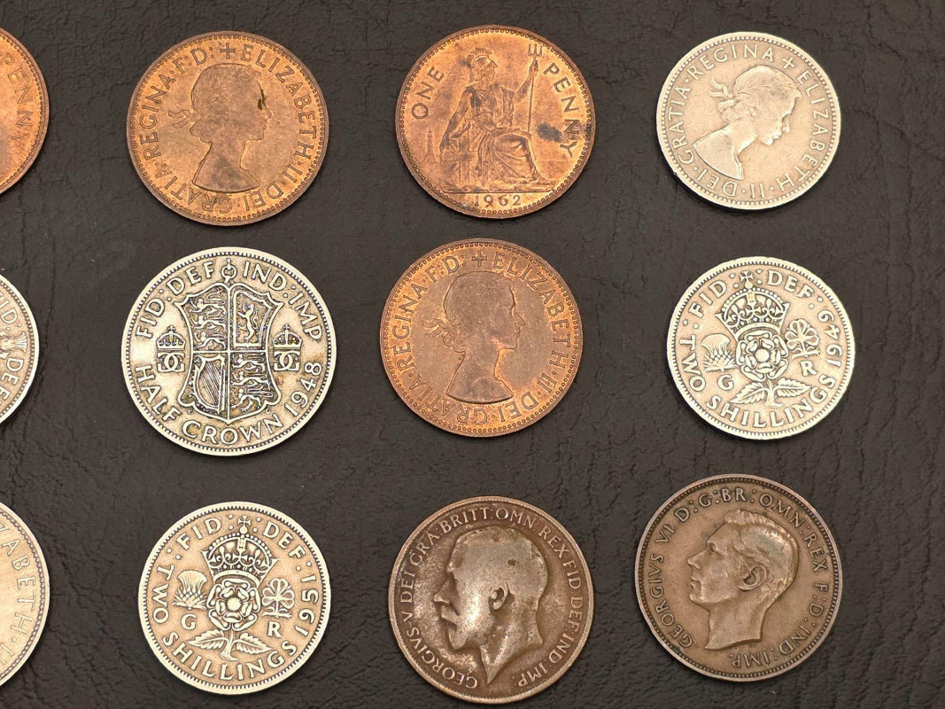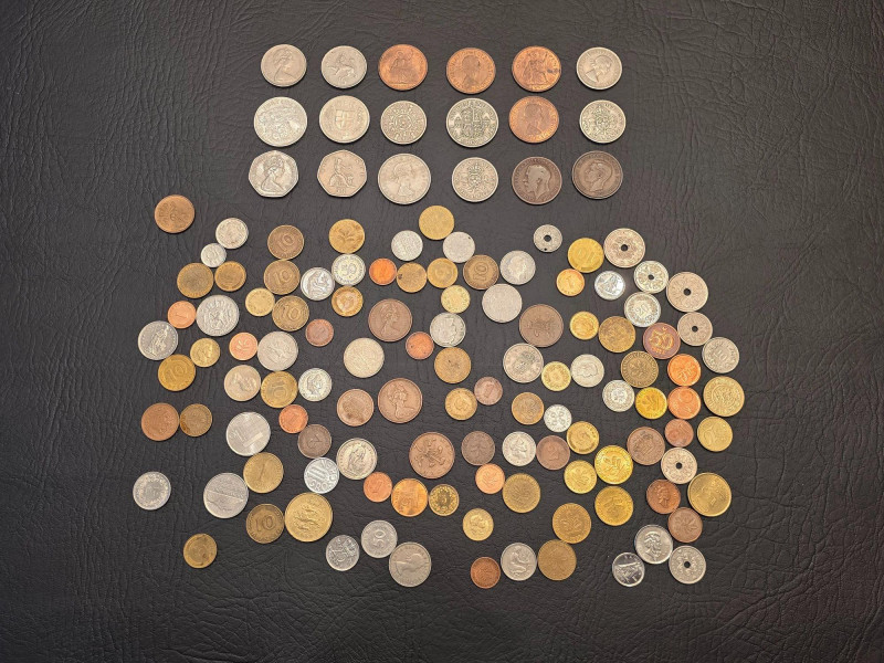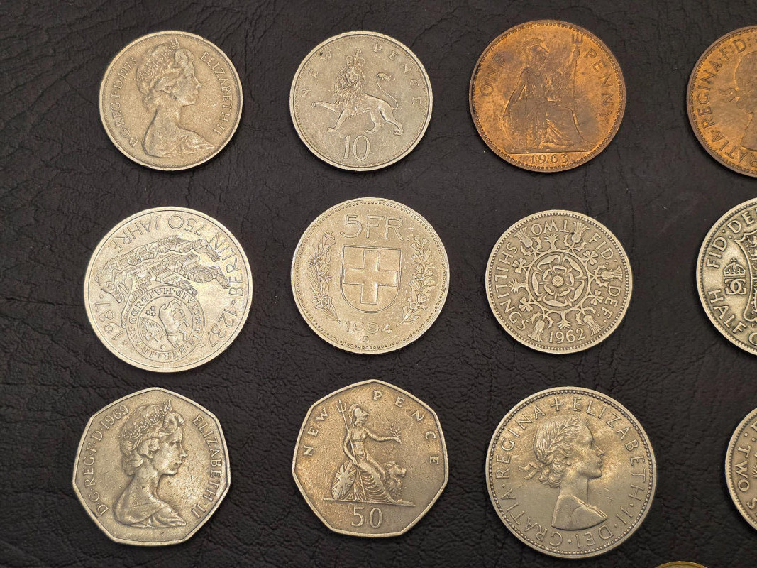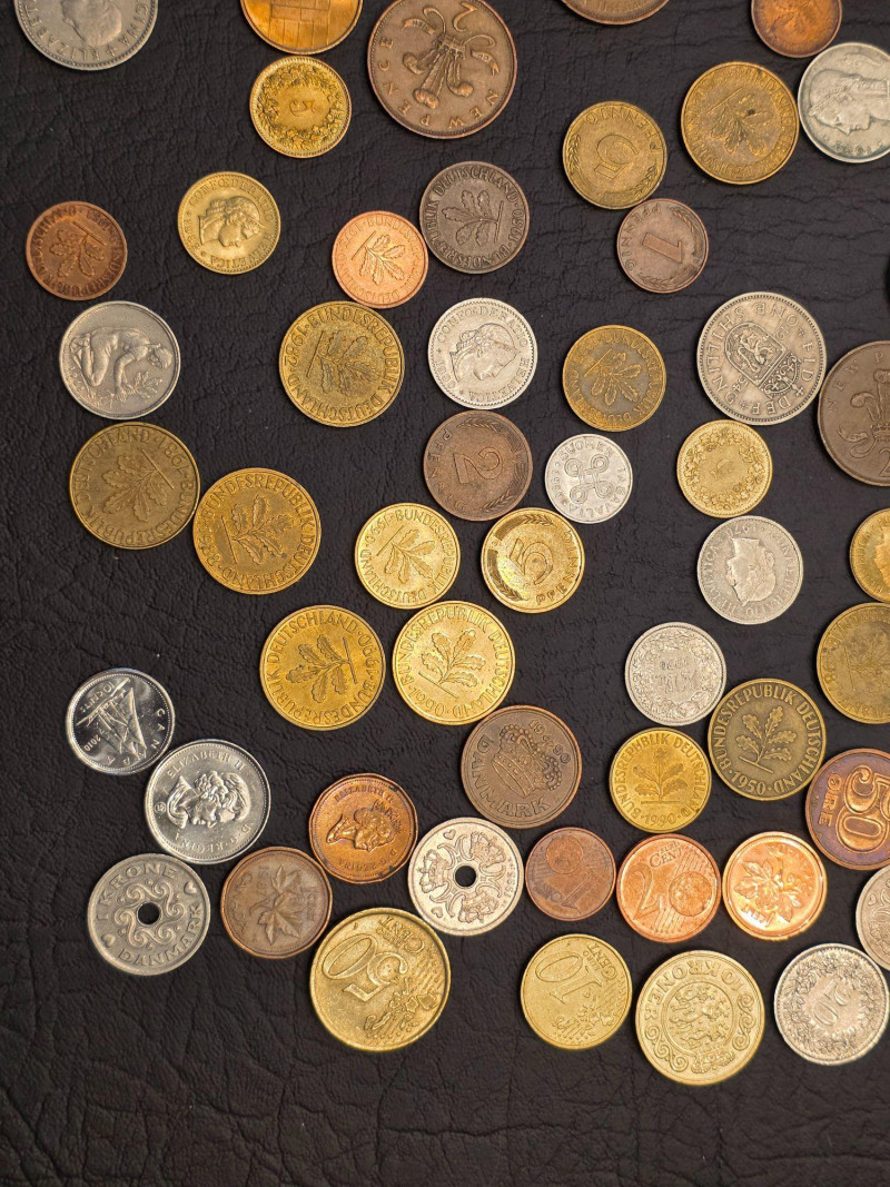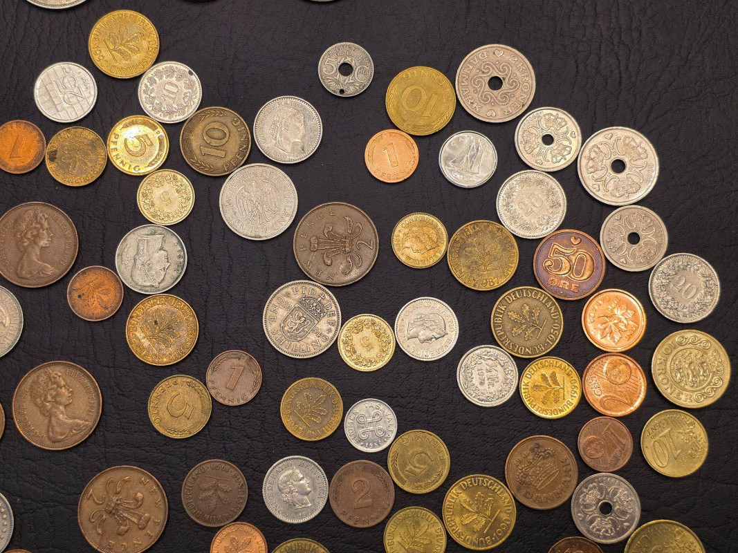 Small Wooden Box Of Foreign Coins 1919-2000s Foreign coins from Denmark, Germany, Great Britain, Canada and more Included in a small wood box Box is 4.5"T x 5.75"W x 4.25"D Nice little collection!