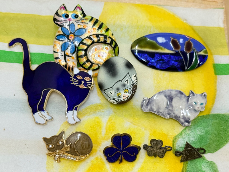 Tiny Clover Leaf & Cloisonné Cat Brooches & Others
