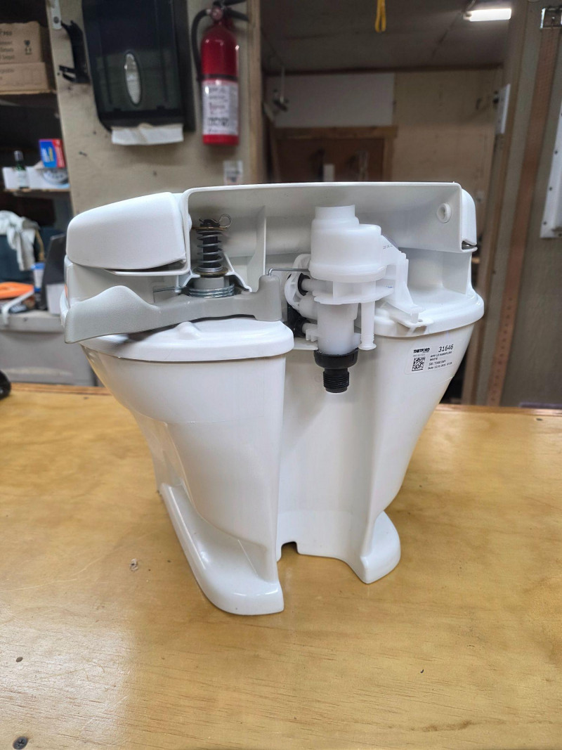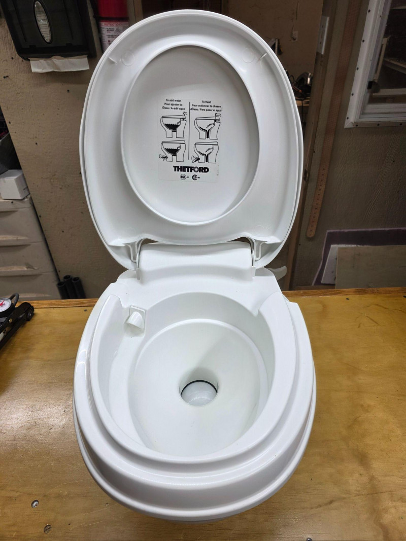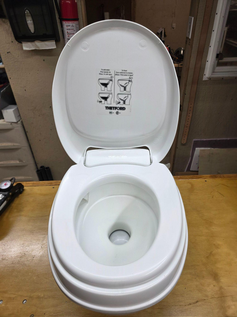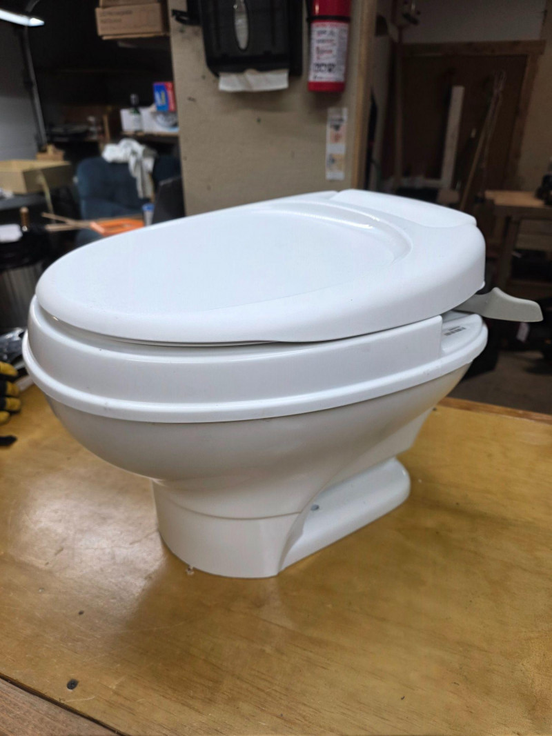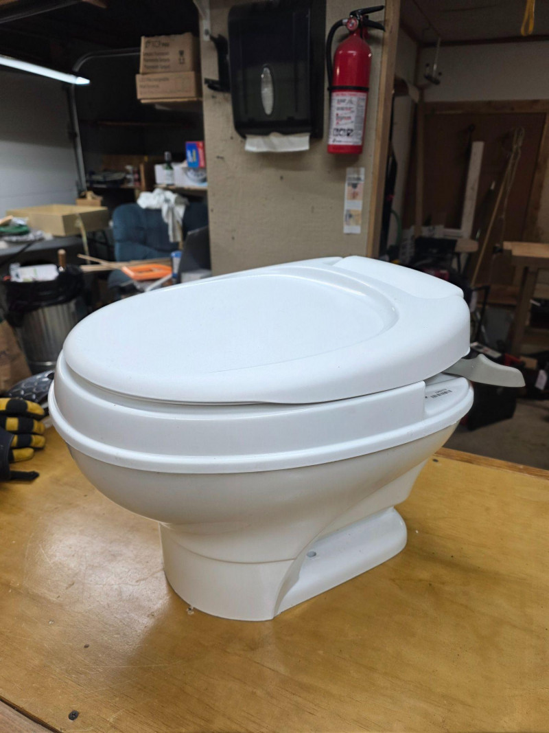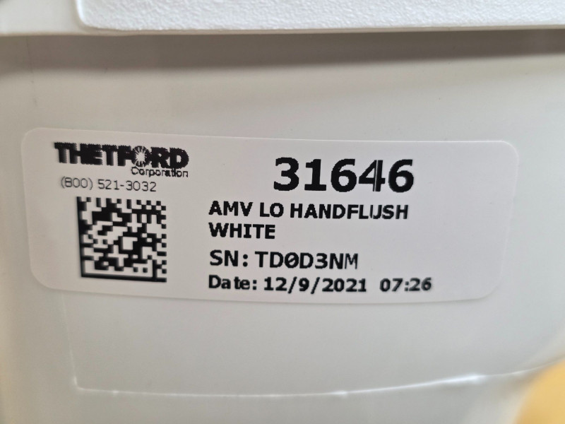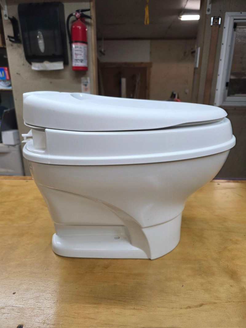 Thetford Aqua-Magic V Low Profile RV Toilet With Hand Flush Thetford Model #31646 Manufactured 2021 Permanent, lightweight polypropylene toilet designed for recreational vehicles Features a handle flush mechanism Pressing the handle halfway adds water to the bowl, while pressing it all the way flushes the toilet completely Looks brand new and never used 14"T x 14"W x 16"D