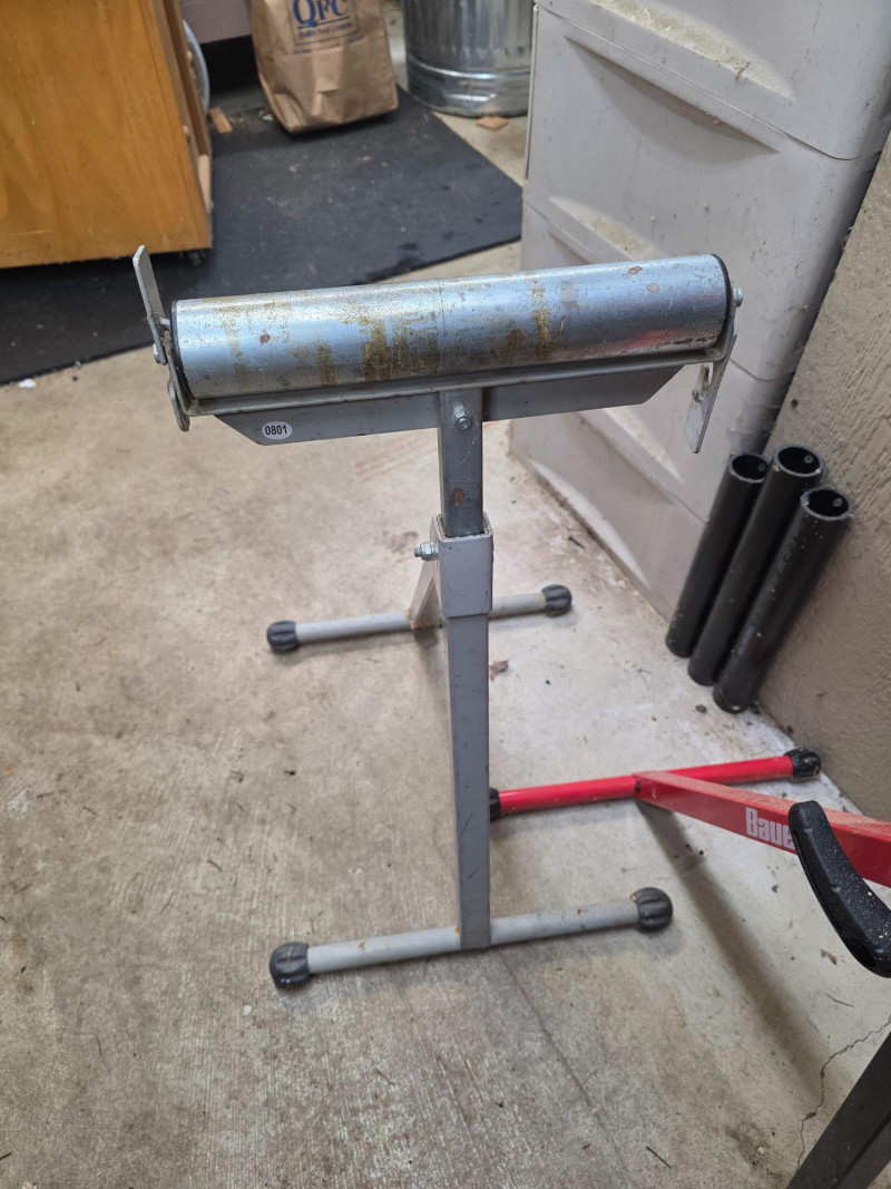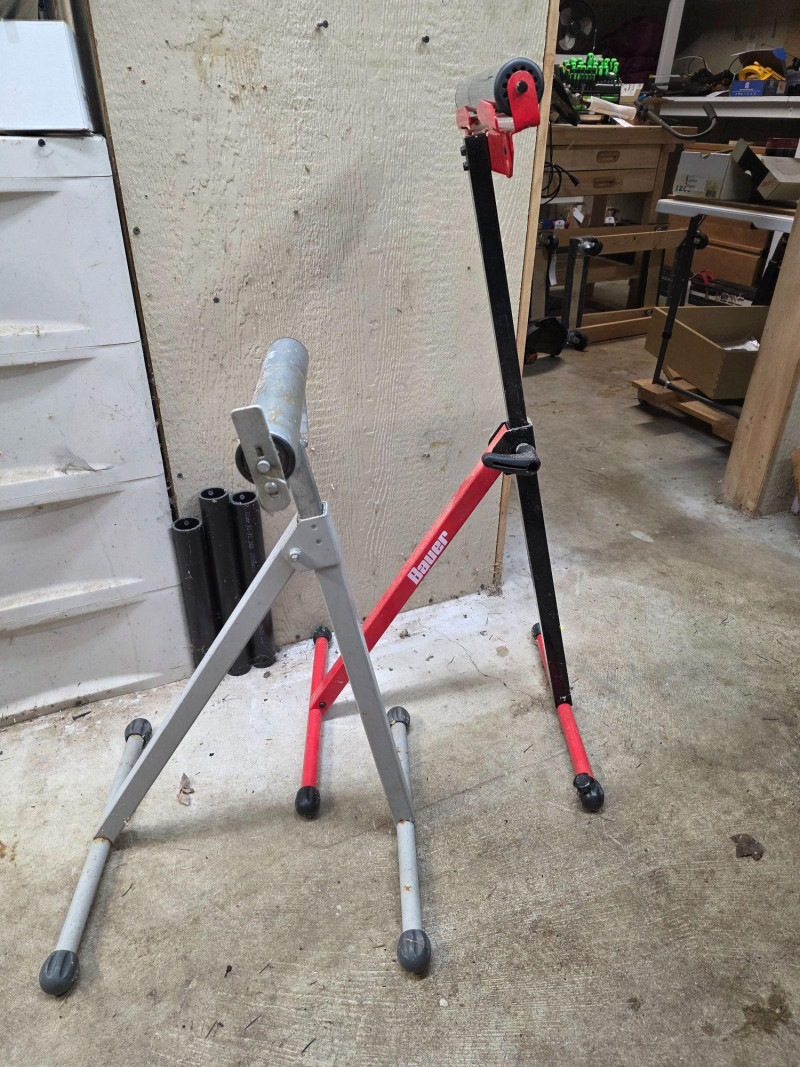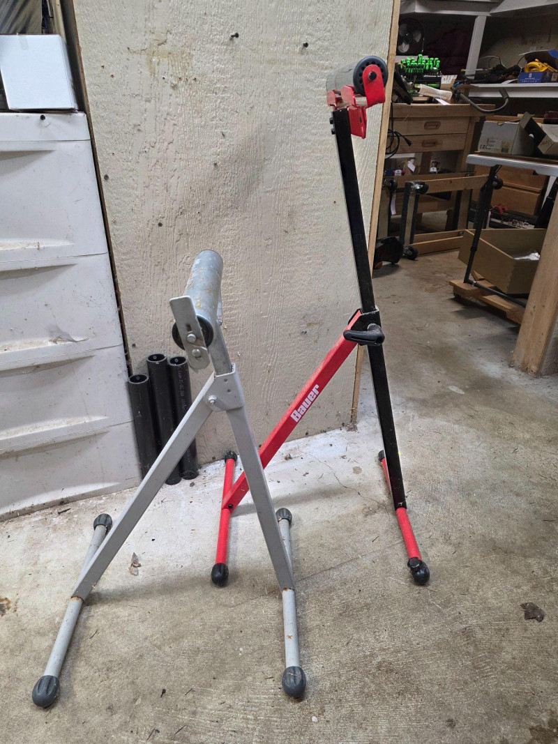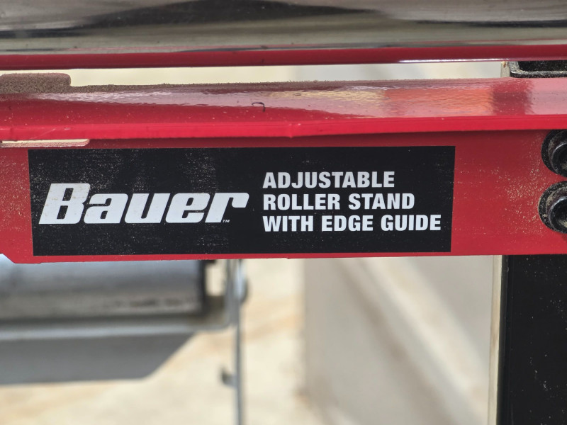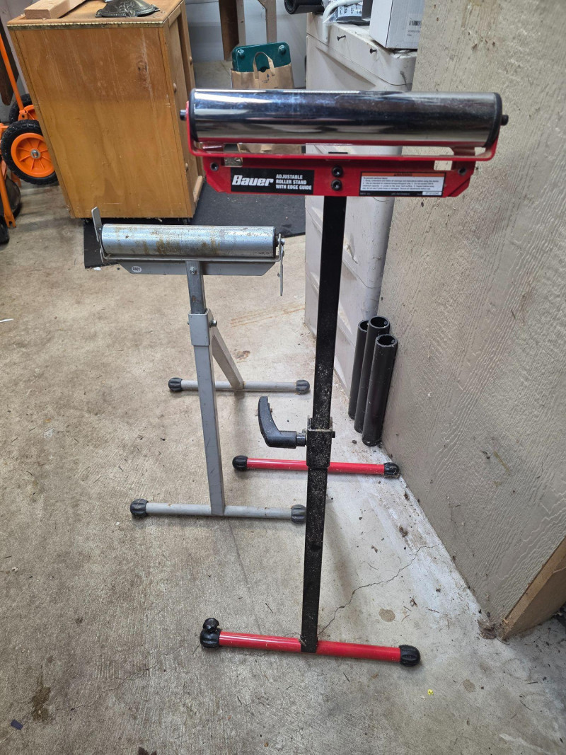 Bauer 250 lb Capacity Adjustable Roller Stand + Generic Roller Stand Used to support long workpieces on tools like table saws, miter saws, or planers Includes a built-in edge guide to assist in aligning materials for precise cuts Features a foldable design for compact storage and easy transport 2 roller stands in all!