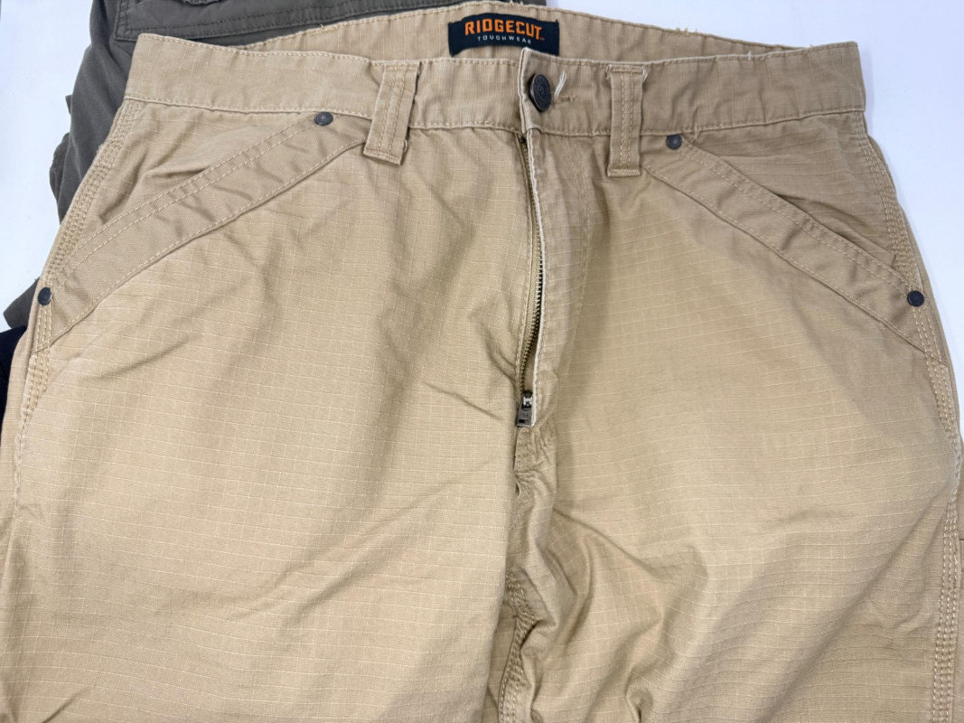 (3) Men’s Pants - Zip Off, Lined and Rip Stop - Size 36x32 Gerry lined black pants. Roughcut light orange/brown heavy rip stop carpenter pants. BC Clothing brown cotton convertible cargo shorts/pants with zip off legs.