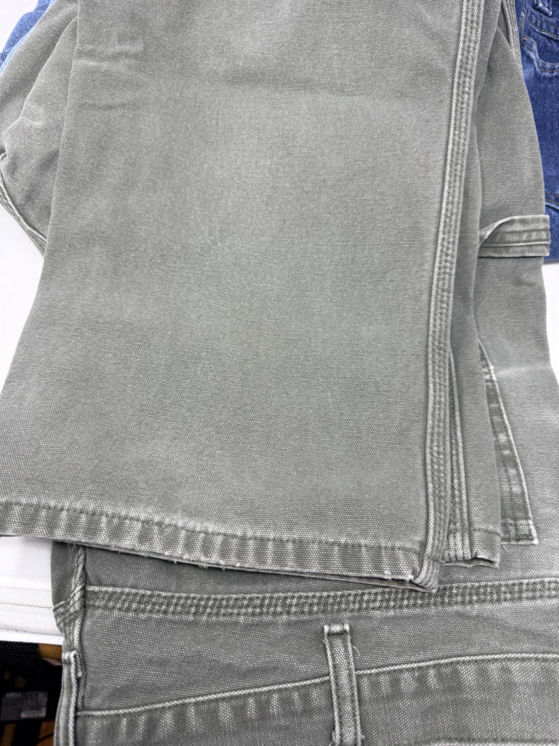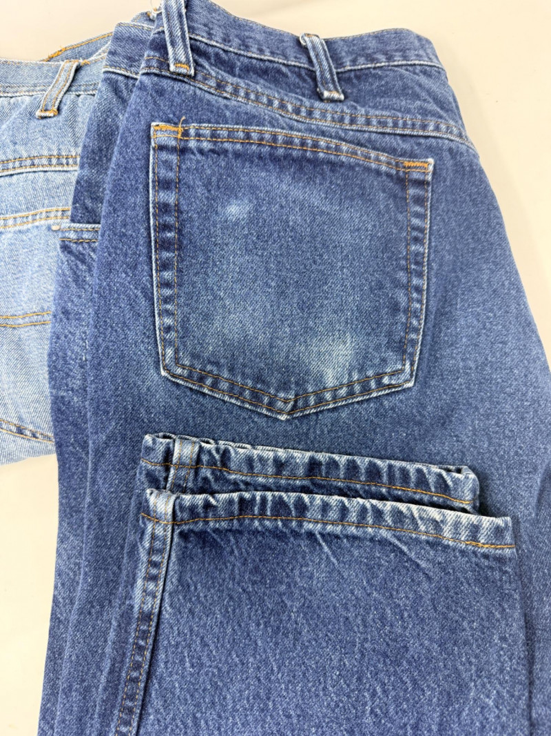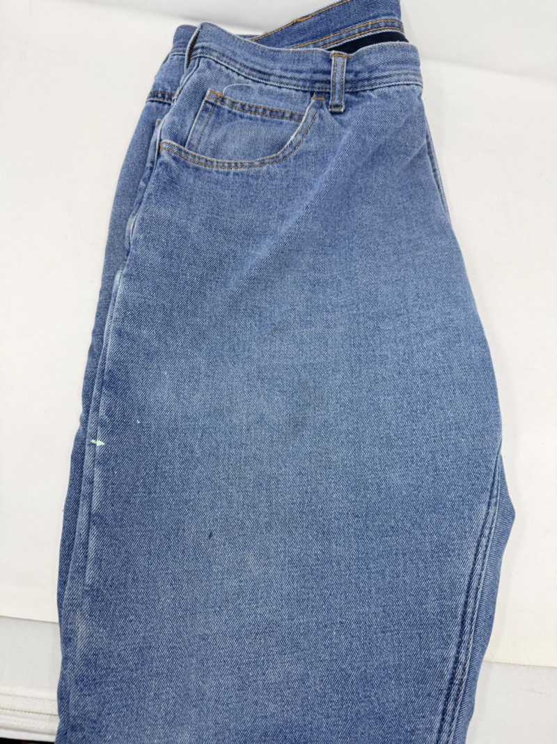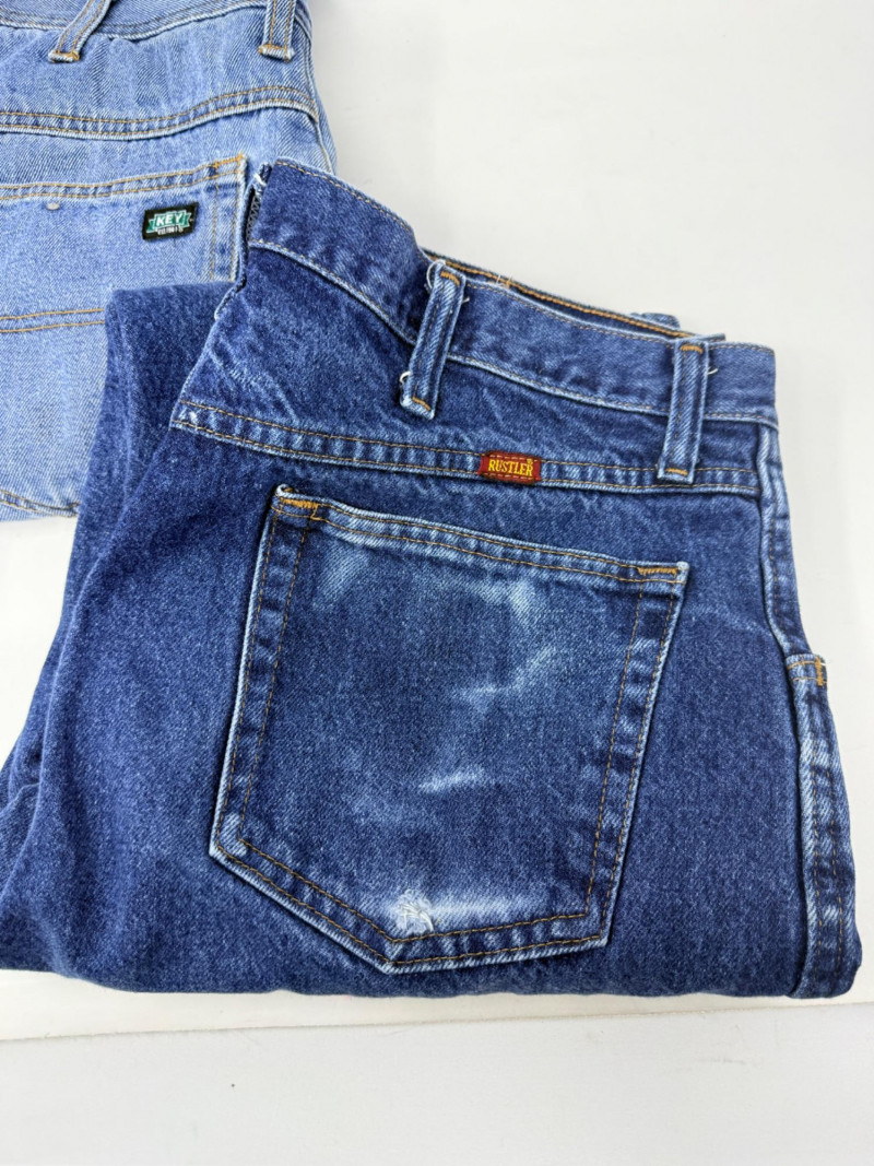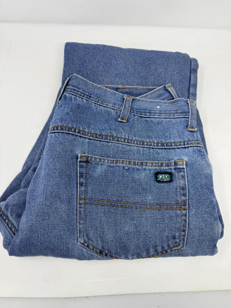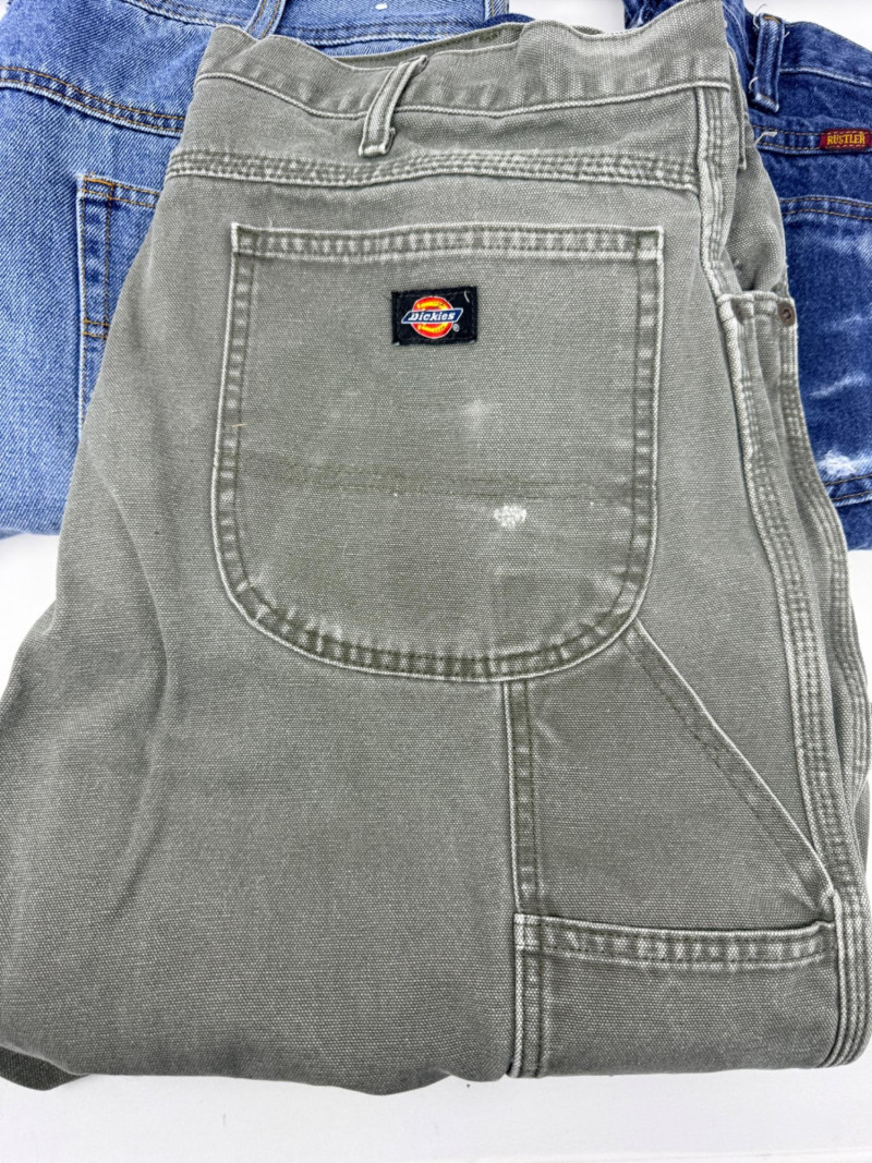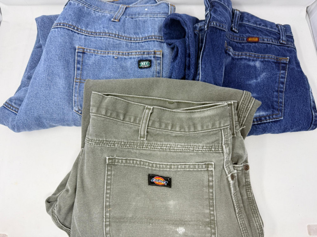 (3) Men’s Unsized Denim - Dickies, Rustler, Key Dickies gray denim carpenter pants Rustler heavy blue denim pants Key fleece lined pants. Some spots. See pics Based on the entire wardrobe, these pants could be 36-38 waist and 30-32 inseam.