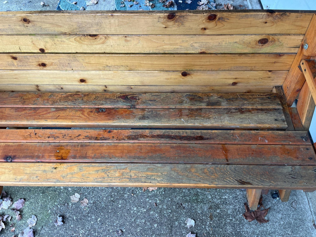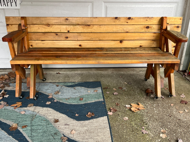 Convertible folding picnic table A space-saving outdoor furniture piece that can transform from a single garden bench with a backrest into a full picnic table with seating on both sides. Stored outside, undercover. Needs refinished. See pictures for conditions. Bench is 34”x84”x24”. Seat height is 20.5”.