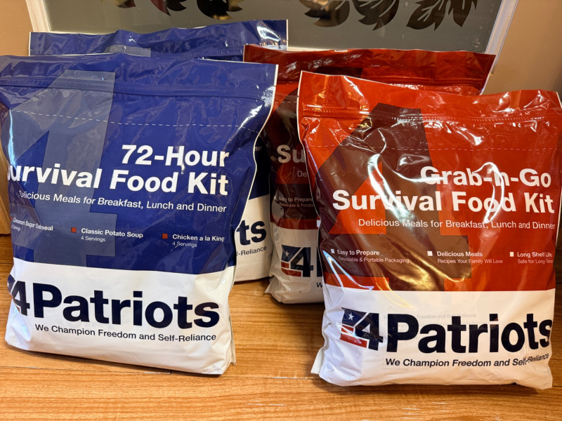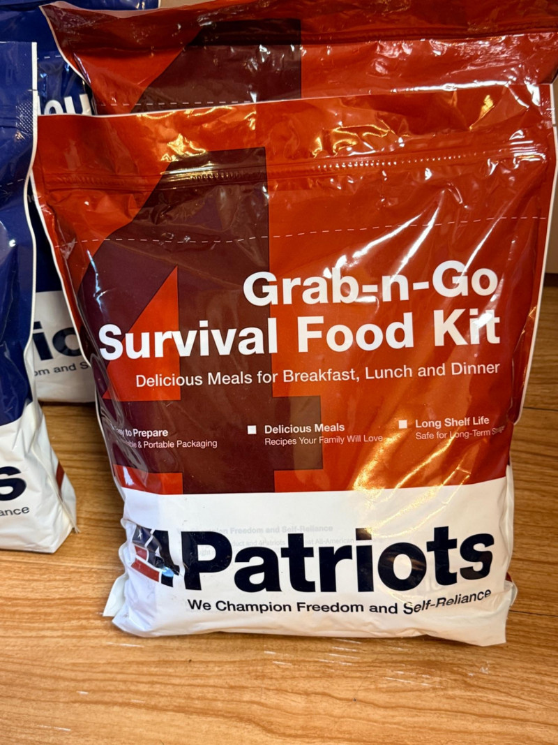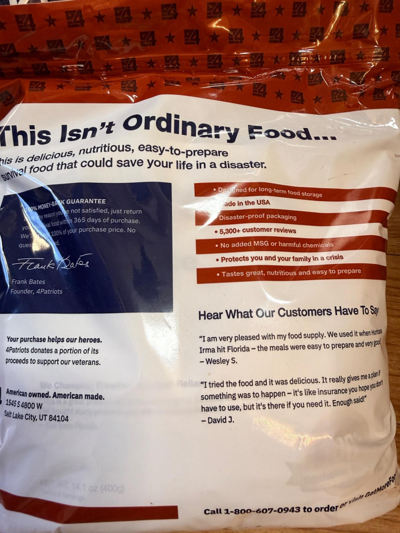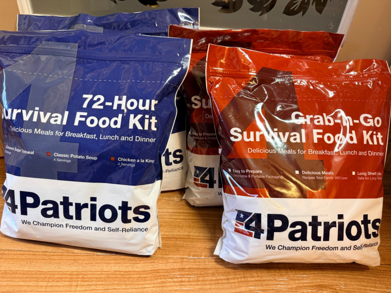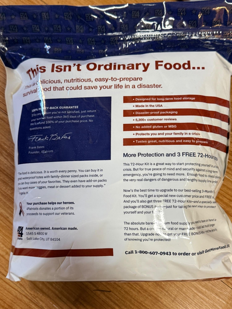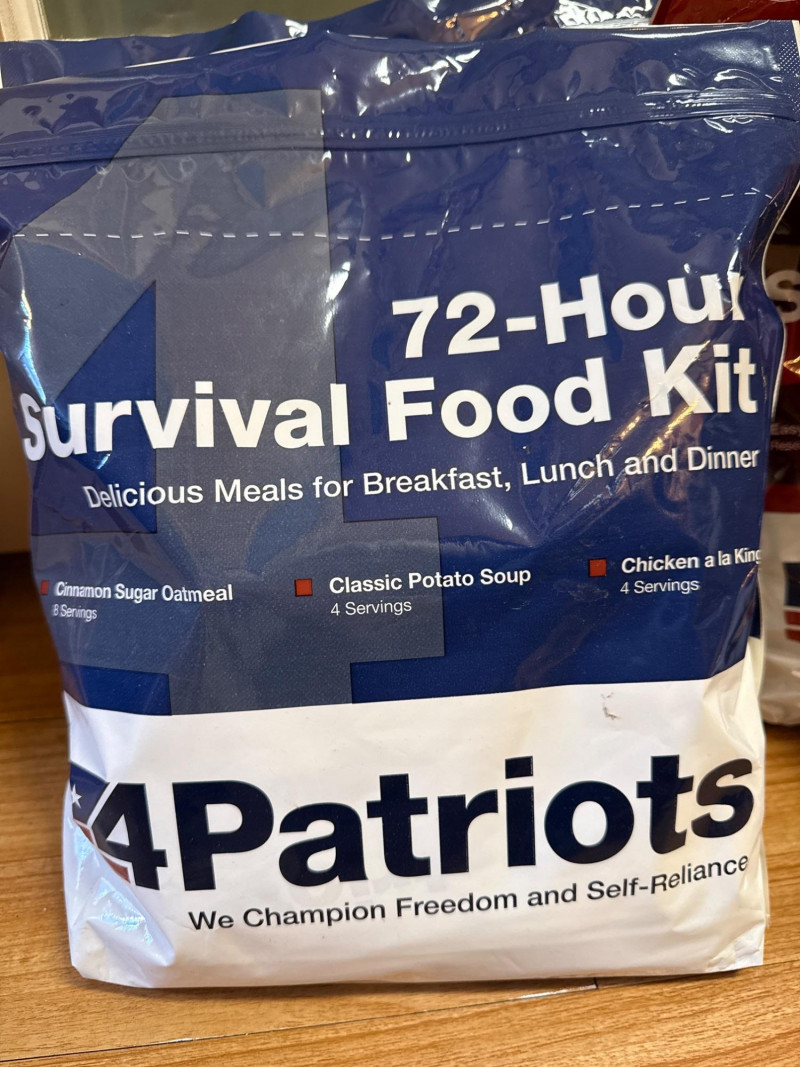 (4) 4 Patriots Freeze Dried Emergency Meals (2) 72 hour survival food kits includes cinnamon, sugar, oatmeal, classic potato soup and chicken à la king.