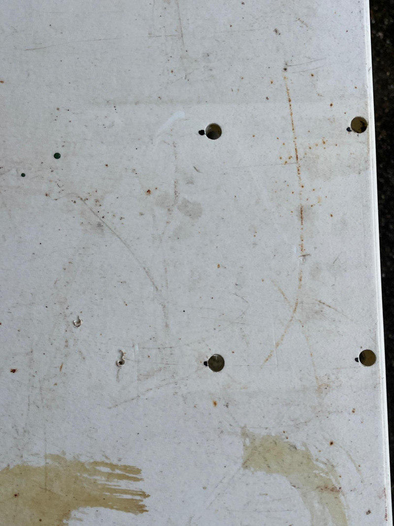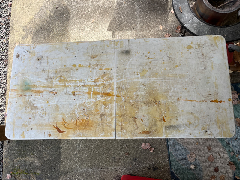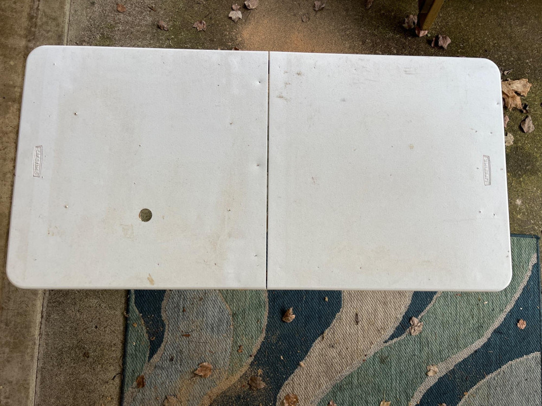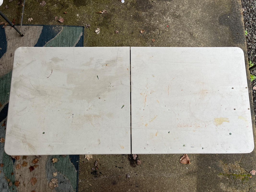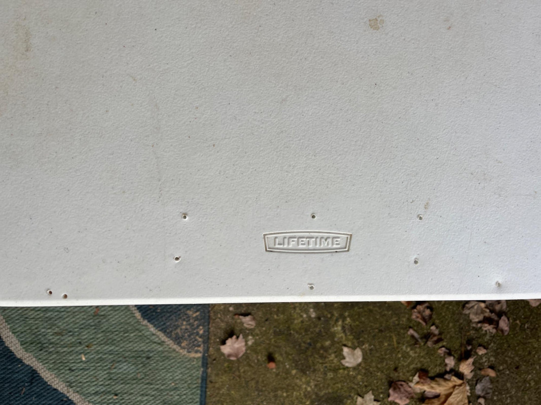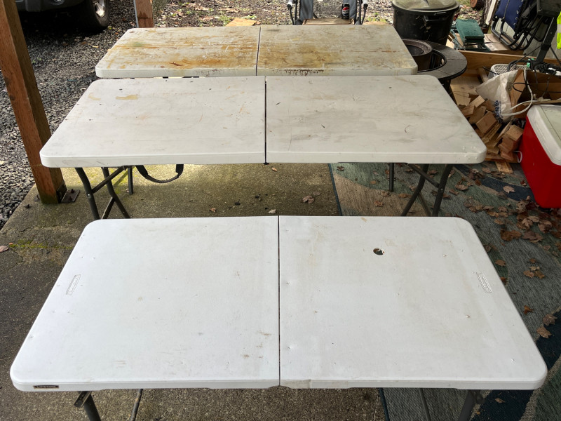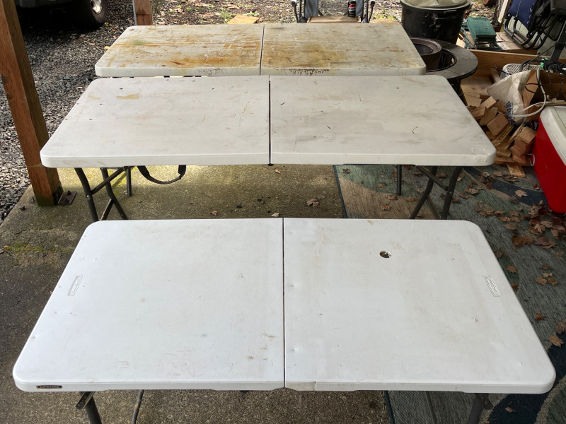 (3) Lifetime Folding Tables Two bigger tables 29”x60”x27” One smaller table with adjustable height 24”x47.5”x23.5” Tables have screw holes in the tops. Smaller table had a hole on top. Tables have stains. See pictures for details.