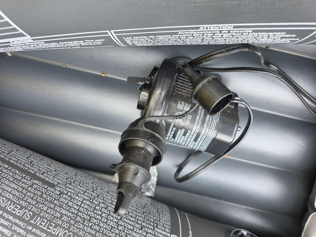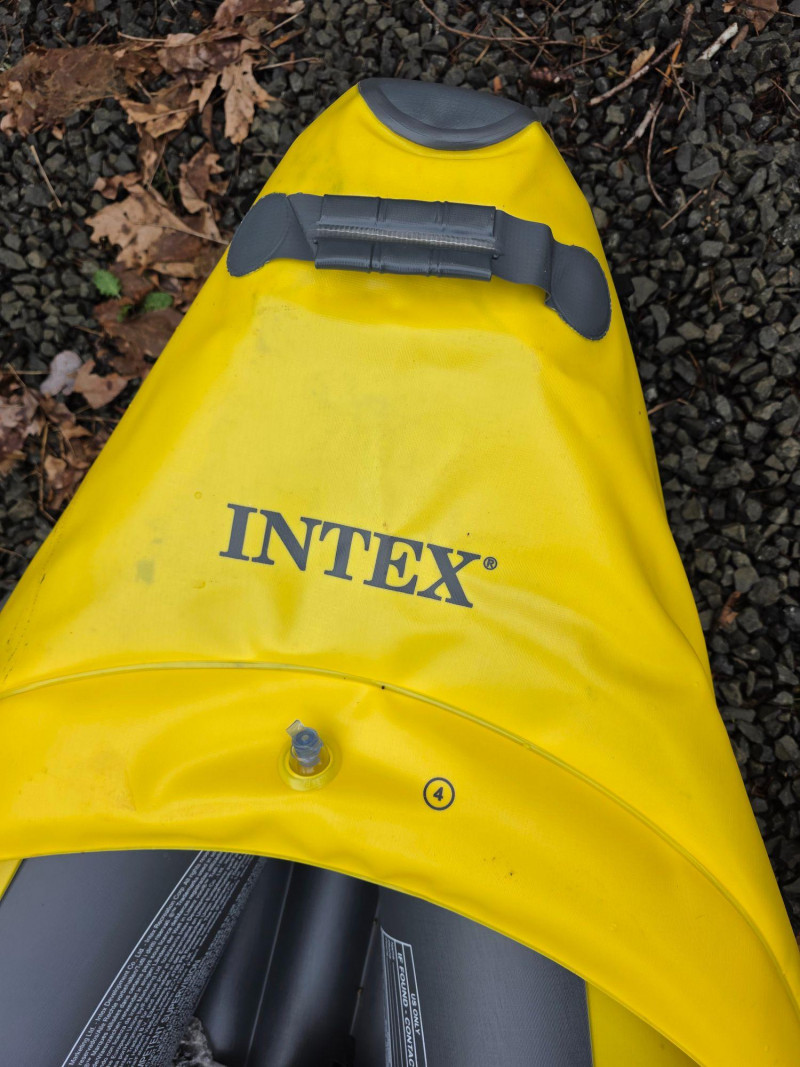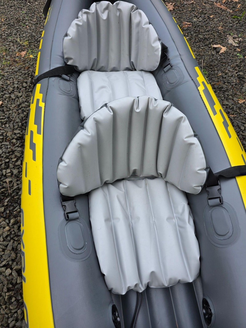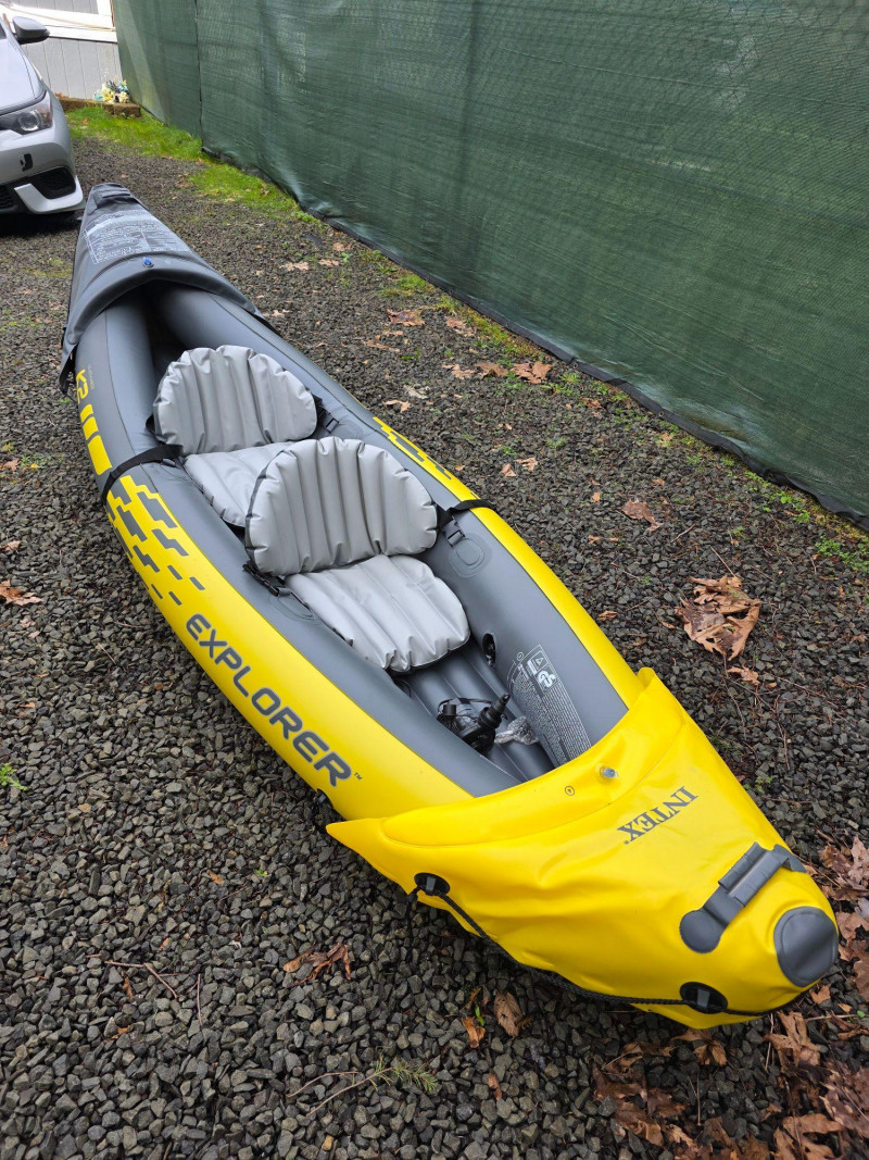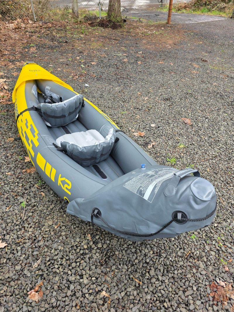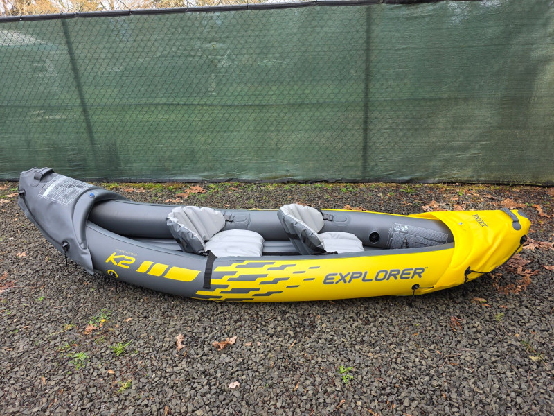 Intex Explorer K2 2-Person Inflatable Kayak With 2 Seats Designed for two people with a weight limit of approximately 400 lbs Includes adjustable inflatable seats and high-visibility yellow design for safety. Made of rugged vinyl construction with an I-beam floor for added stability. Includes an electric air pump No leaks that I can tell, holds air just fine Could use a wash & wipe down. Smells a bit funky. Stored in a shed on the loft No oars or paddles included 20"T x 126"L x 35"W