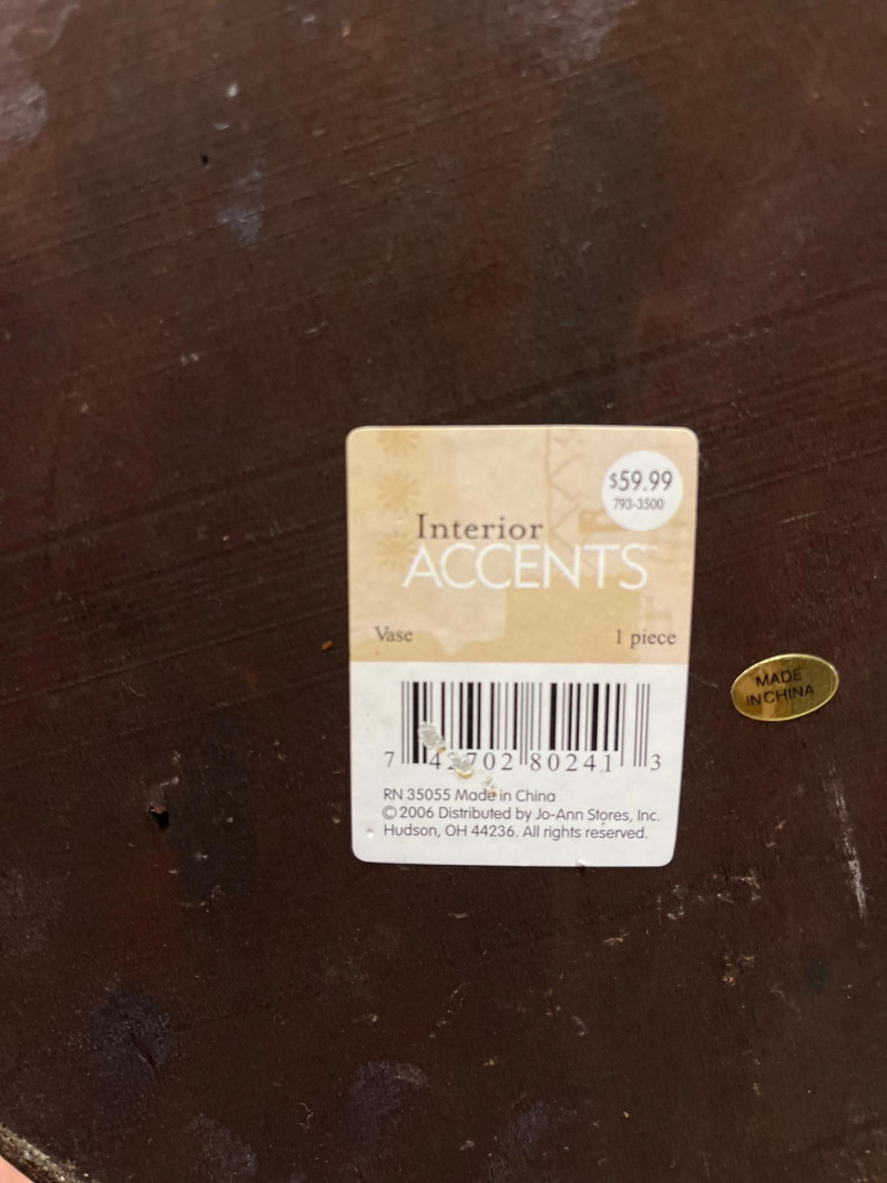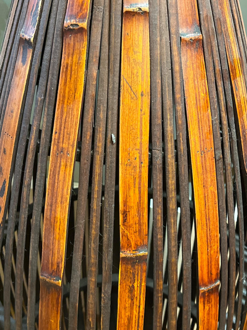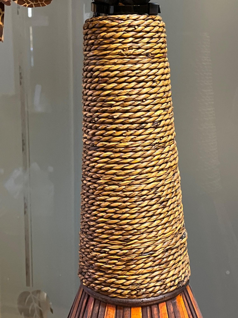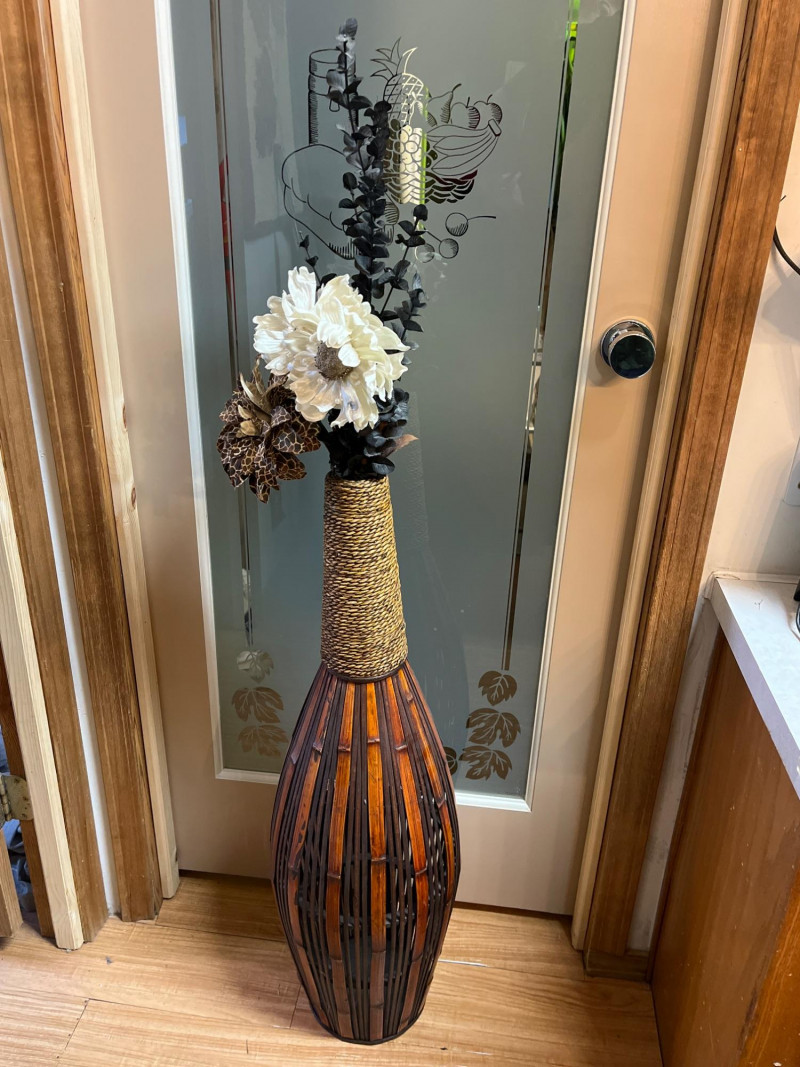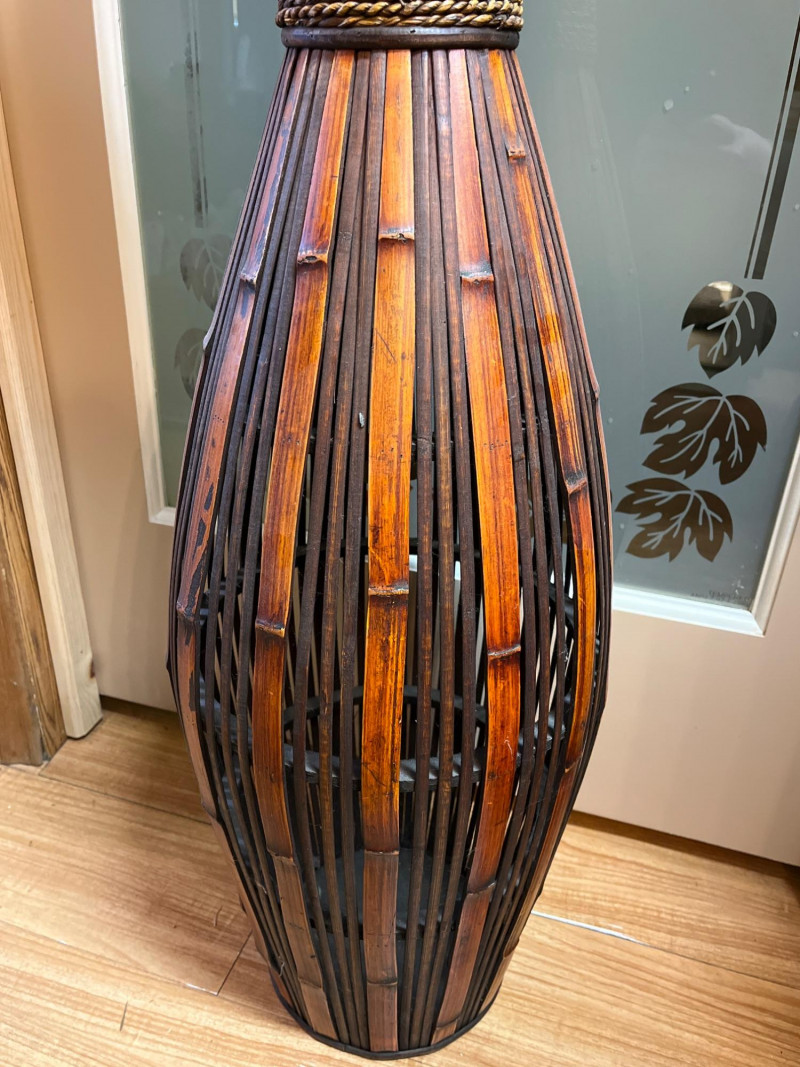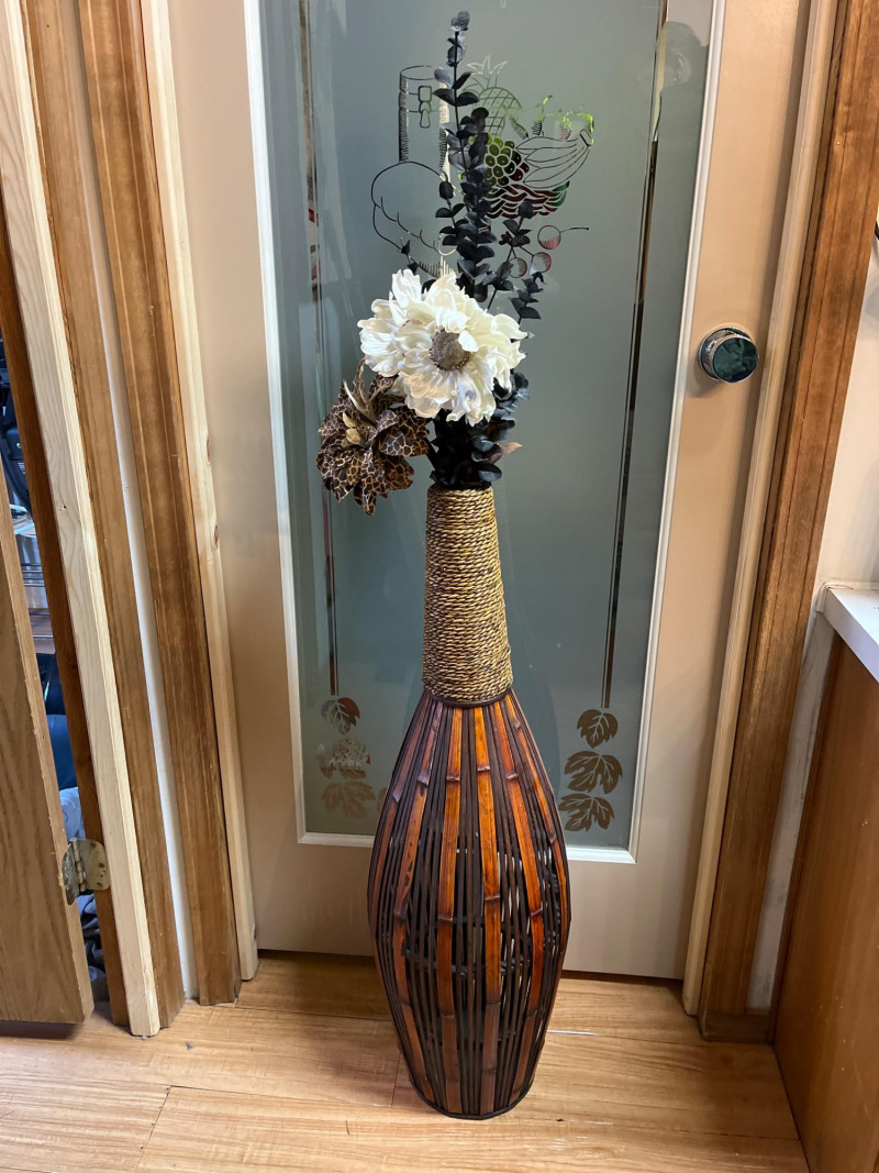 Interior Accents Trumpet-Style Floor Vase with Decorative Flowers Vertical metal pieces designed to look like strips of bamboo. Two-tone effect with a woven, rope neck and a slatted, vertical-ribbed body. Neutral-tone fake flowers. 36”x11.5”