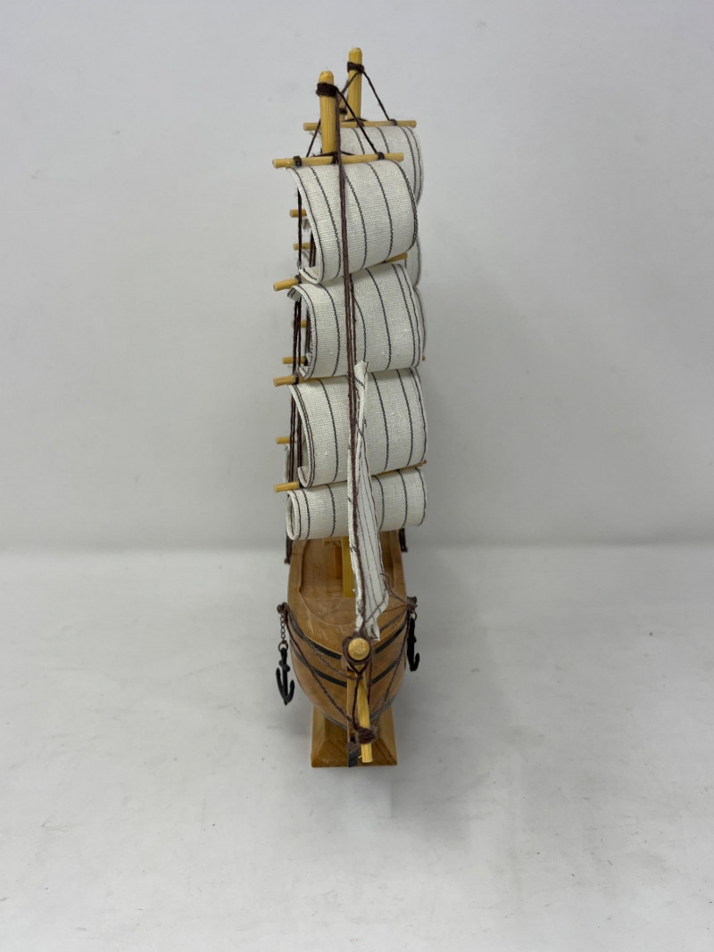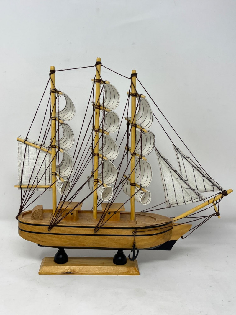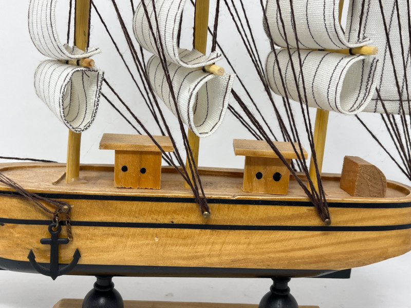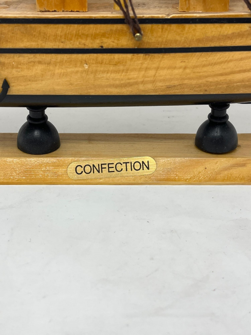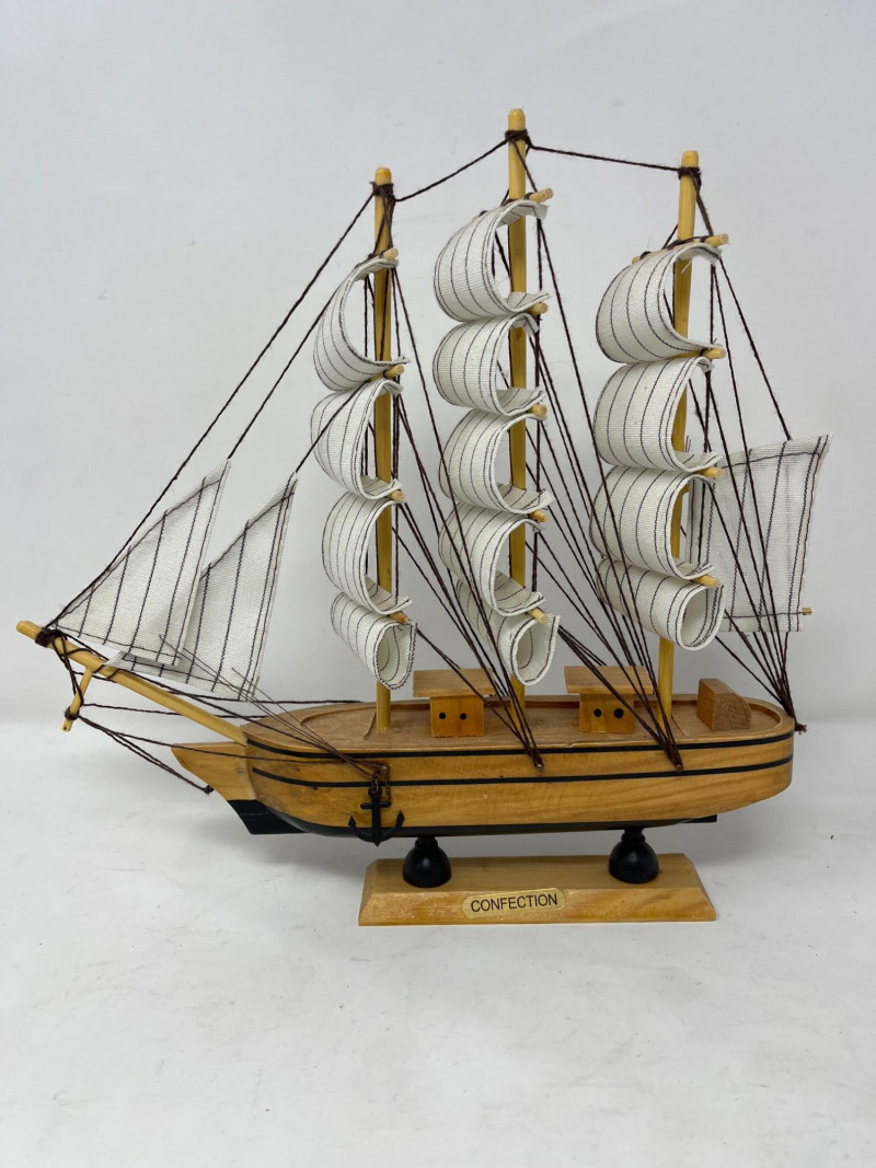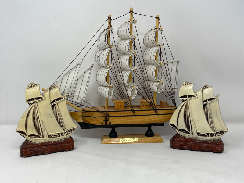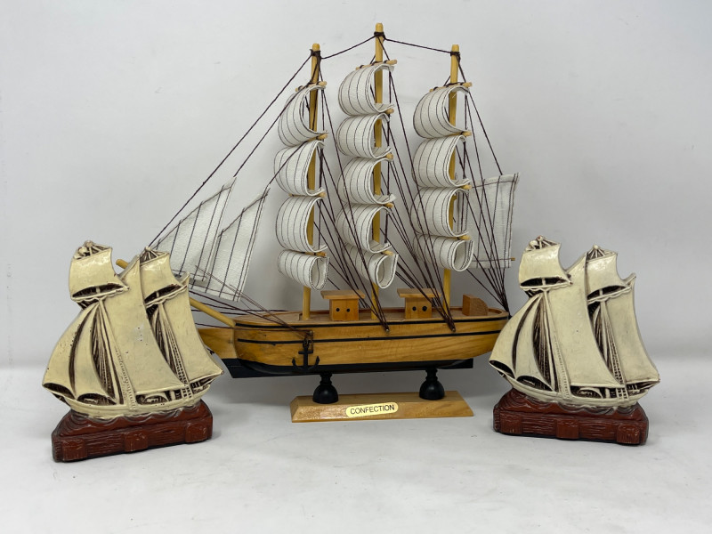 Beginners Boat Collection! Wooden hull with dark vertical lines. Three masted ship with white cloth with dark vertical line sails and intricate riggings. Wooden base with a “Confection” tag. 11.5”x12”x3” Pair of resin sail boat book ends. 6”x4.5”x3”