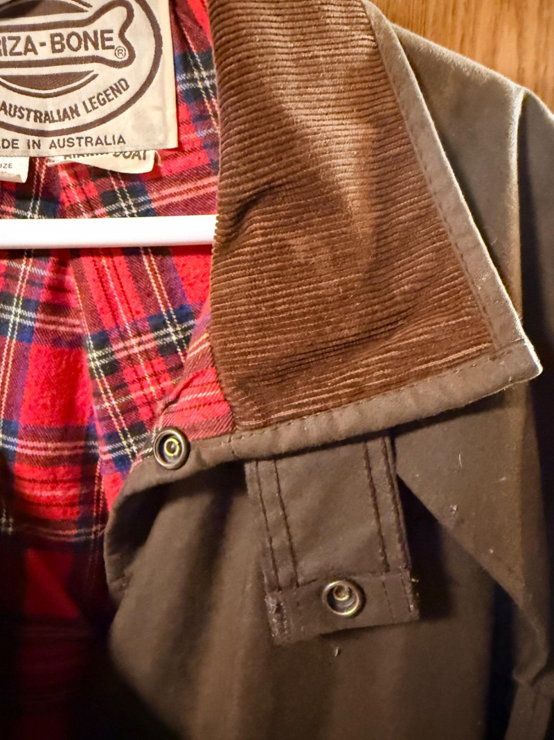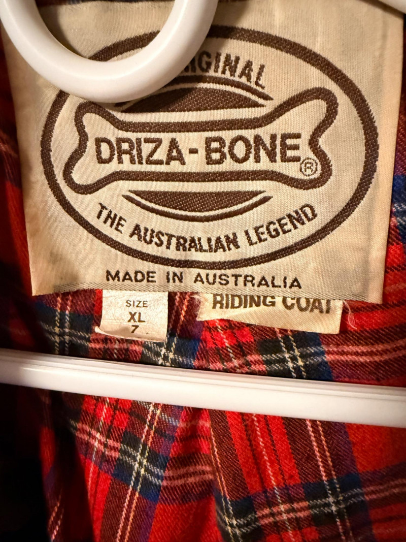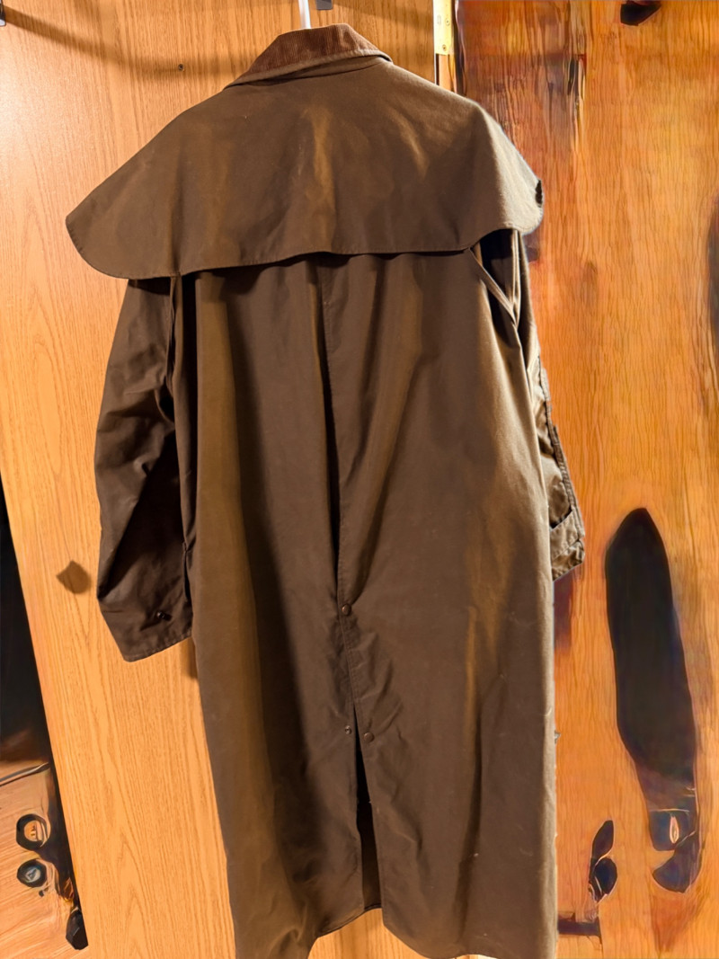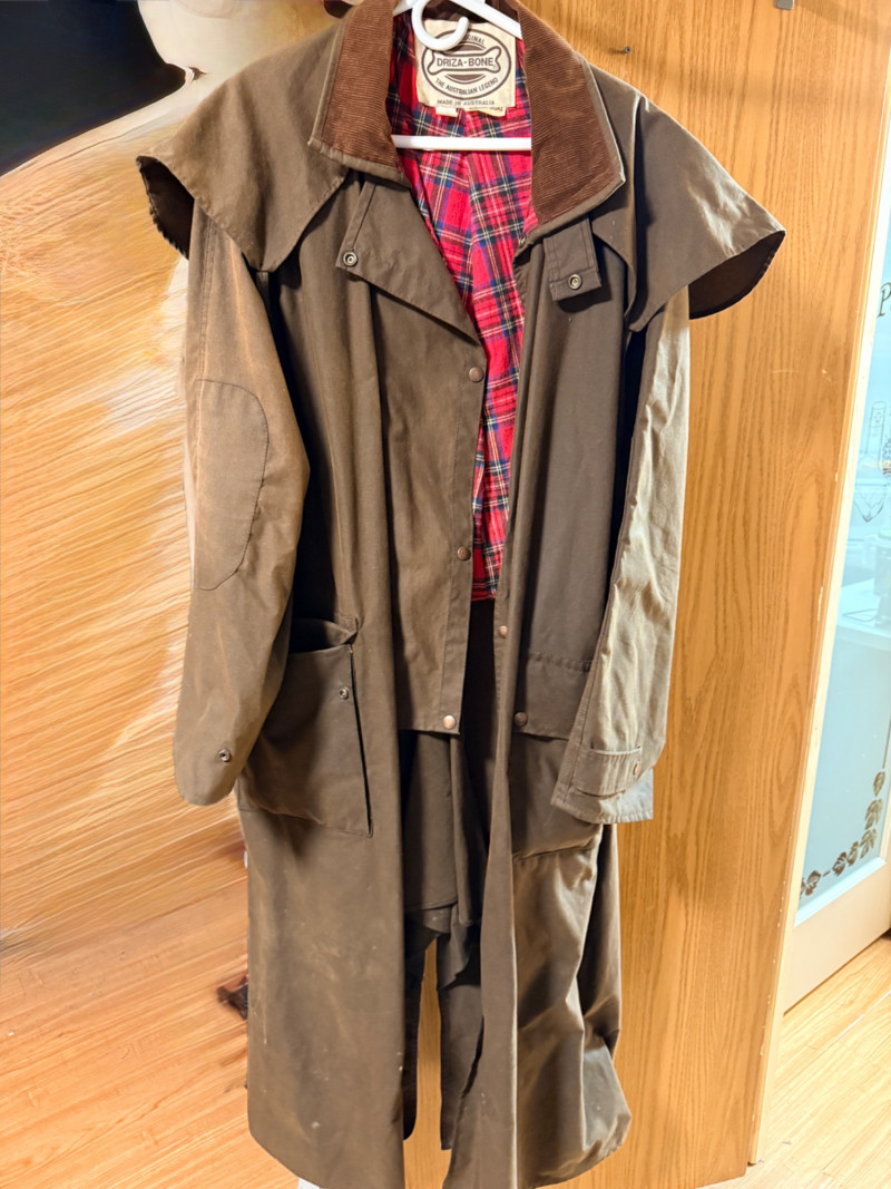Driza-Bone Rider Heritage Australian Oilskin Riding Coat. Men’s XL It is a classic full-length duster designed for durability and weather protection, traditionally used for horseback riding in the Australian outback. Made from heavy-duty waxed cotton oilskin which provides water and wind resistance. Features a distinctive detachable shoulder cape designed to shed rain, a corduroy-lined collar, and reinforced elbow patches. Includes a cotton lining, with a traditional plaid or "Legend" pattern. Includes a rear saddle gusset for freedom of movement and dual-entry hip pockets.