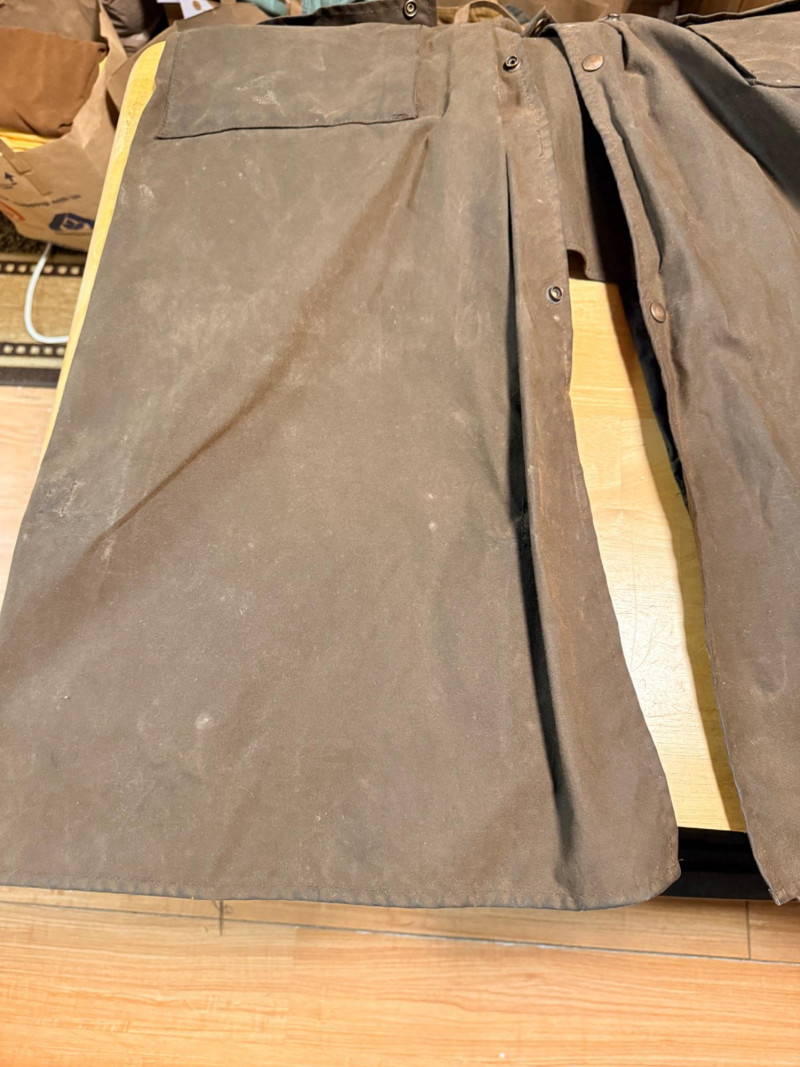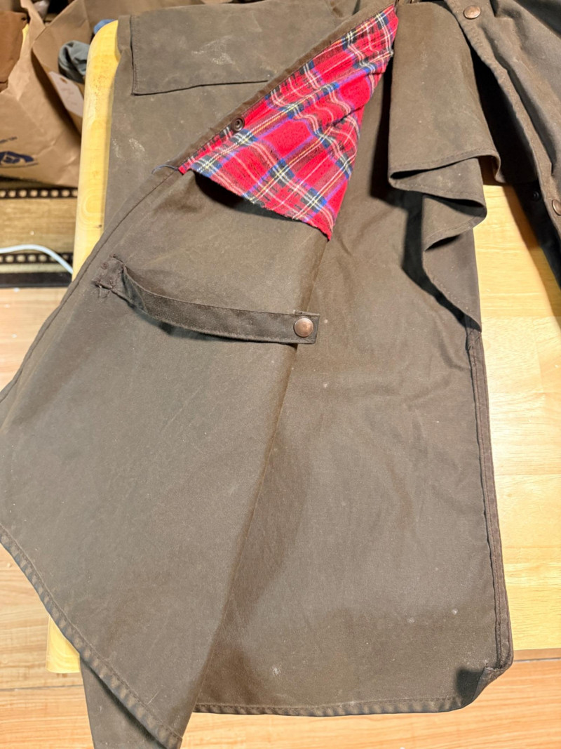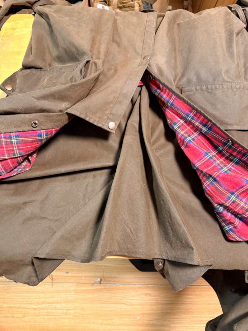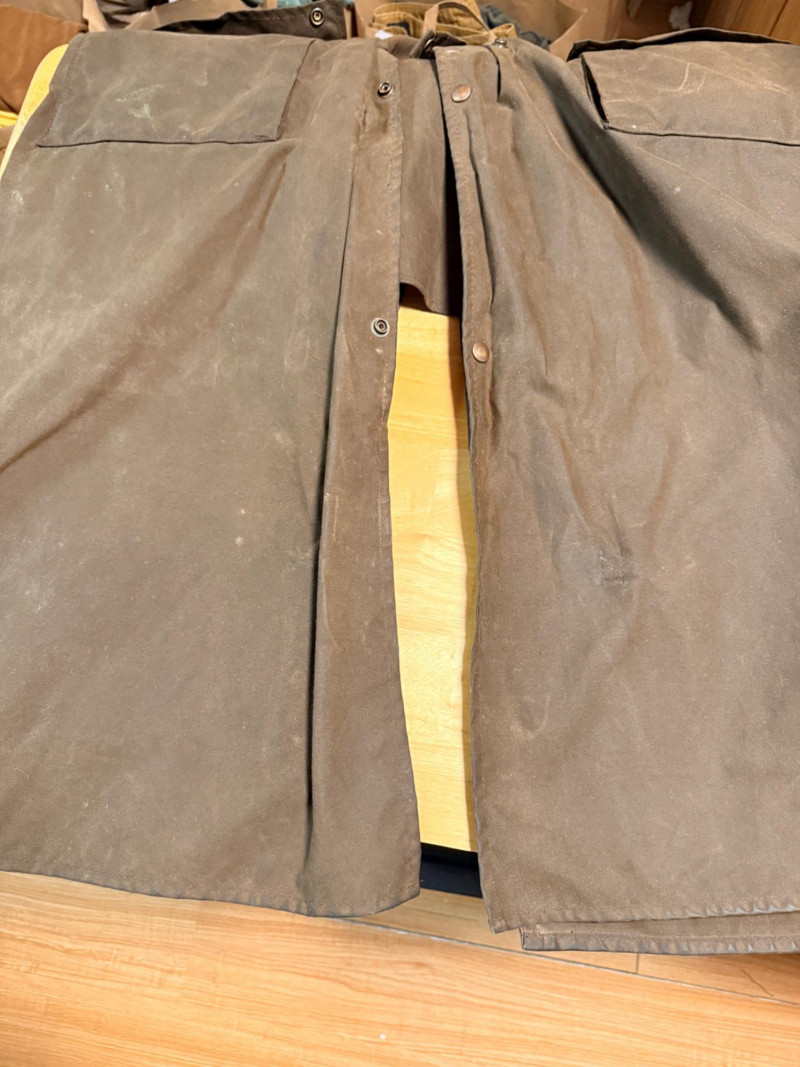 Driza-Bone Rider Heritage Australian Oilskin Riding Coat. Men’s XL It is a classic full-length duster designed for durability and weather protection, traditionally used for horseback riding in the Australian outback. Made from heavy-duty waxed cotton oilskin which provides water and wind resistance. Features a distinctive detachable shoulder cape designed to shed rain, a corduroy-lined collar, and reinforced elbow patches. Includes a cotton lining, with a traditional plaid or "Legend" pattern. Includes a rear saddle gusset for freedom of movement and dual-entry hip pockets.
