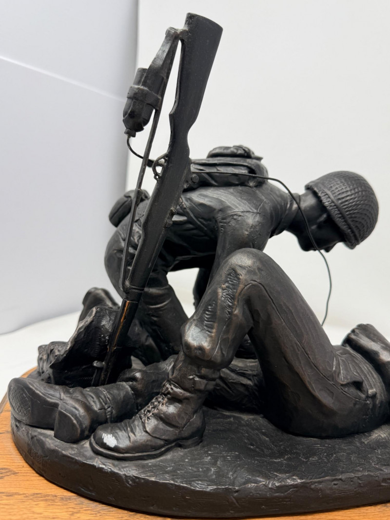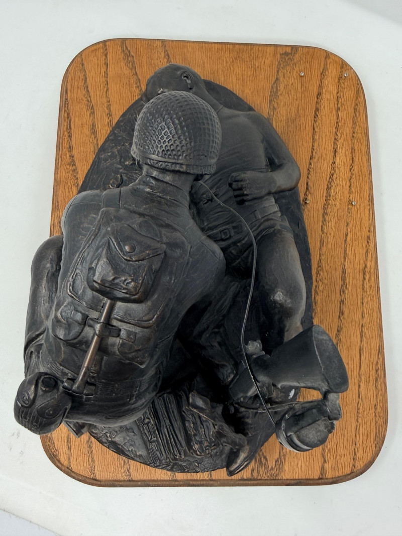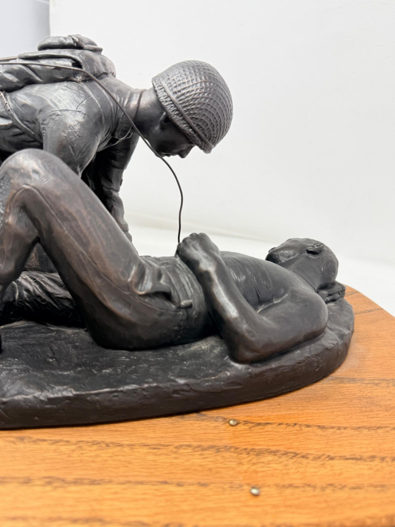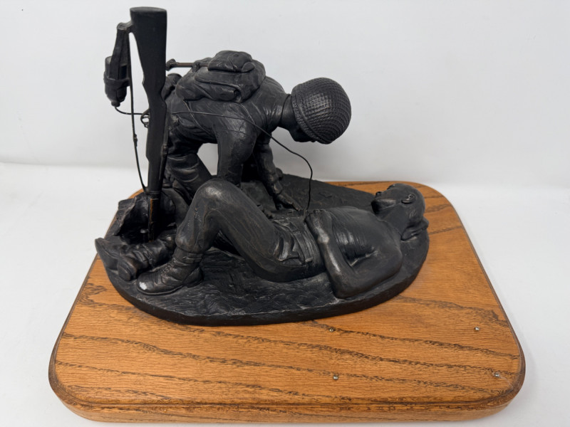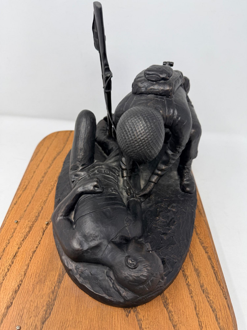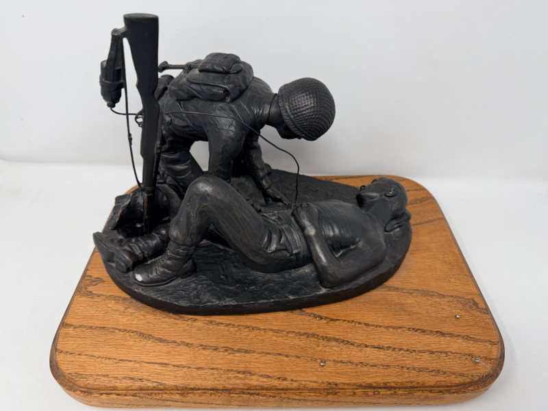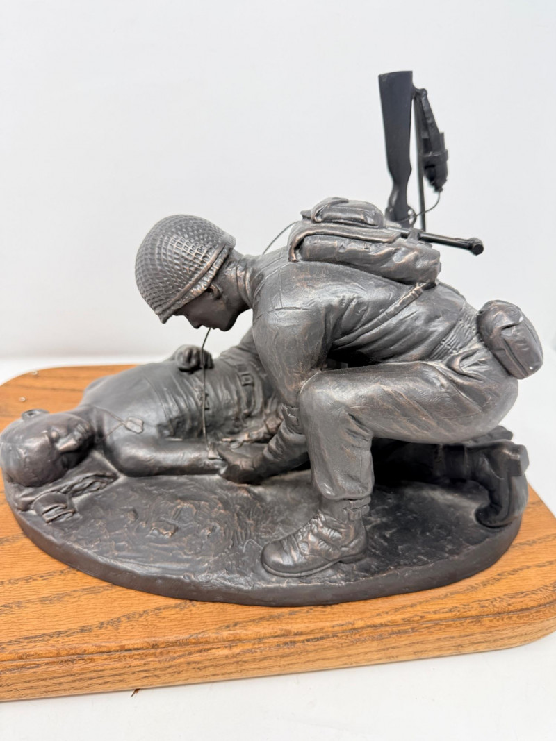 Reproduction of the Combat Medic Memorial Statue. The original life-size monument, created by artist Katherine Speed Ettl, is located at the Army Medical Department (AMEDD) Museum at Fort Sam Houston, Texas. Cast statue with a bronze-tone finish. This statue sits on an oak base with 4 tiny screws that held a plaque and is heavy. Mounted on an oak plinth measuring 15”x11”x 8.5”. The piece depicts a medic tending to a fallen soldier, symbolizing the dedication and sacrifice of medical personnel in combat. The rifle has become detached from the base. Needs repair.