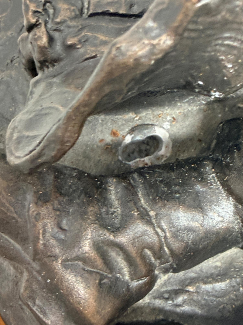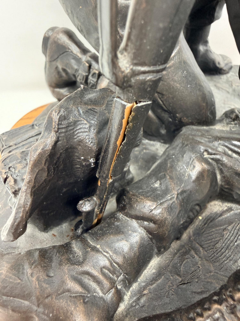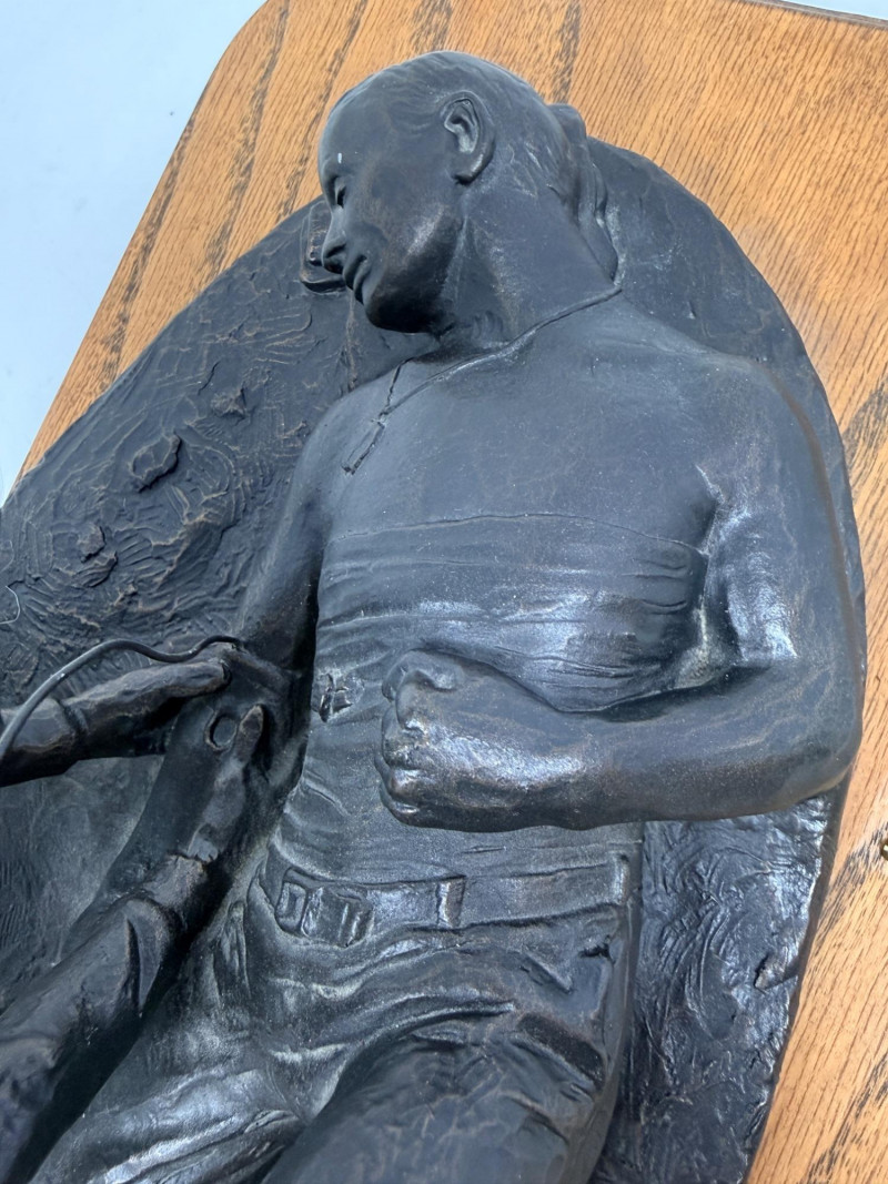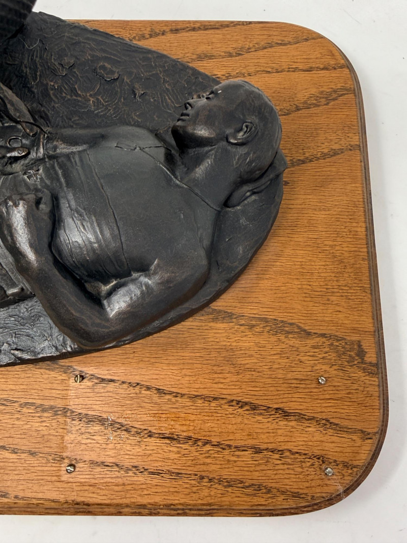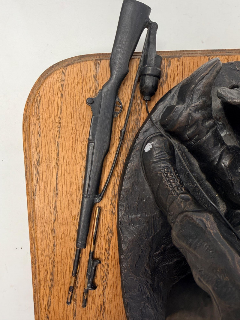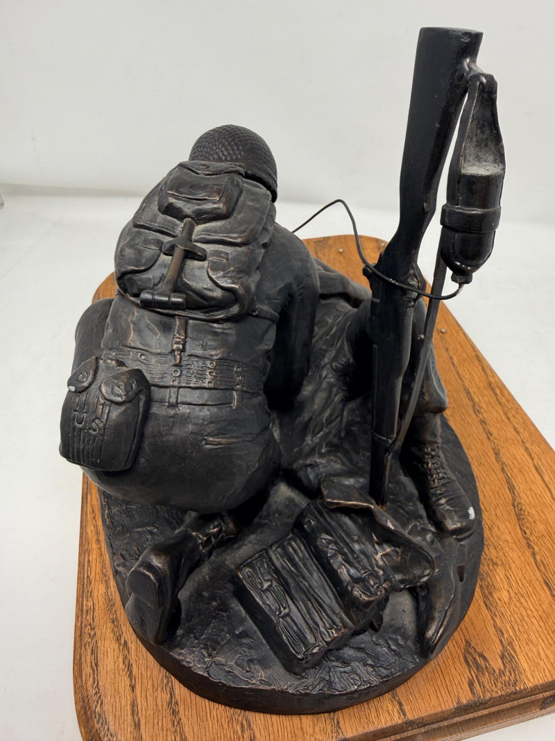 Reproduction of the Combat Medic Memorial Statue. The original life-size monument, created by artist Katherine Speed Ettl, is located at the Army Medical Department (AMEDD) Museum at Fort Sam Houston, Texas. Cast statue with a bronze-tone finish. This statue sits on an oak base with 4 tiny screws that held a plaque and is heavy. Mounted on an oak plinth measuring 15”x11”x 8.5”. The piece depicts a medic tending to a fallen soldier, symbolizing the dedication and sacrifice of medical personnel in combat. The rifle has become detached from the base. Needs repair.