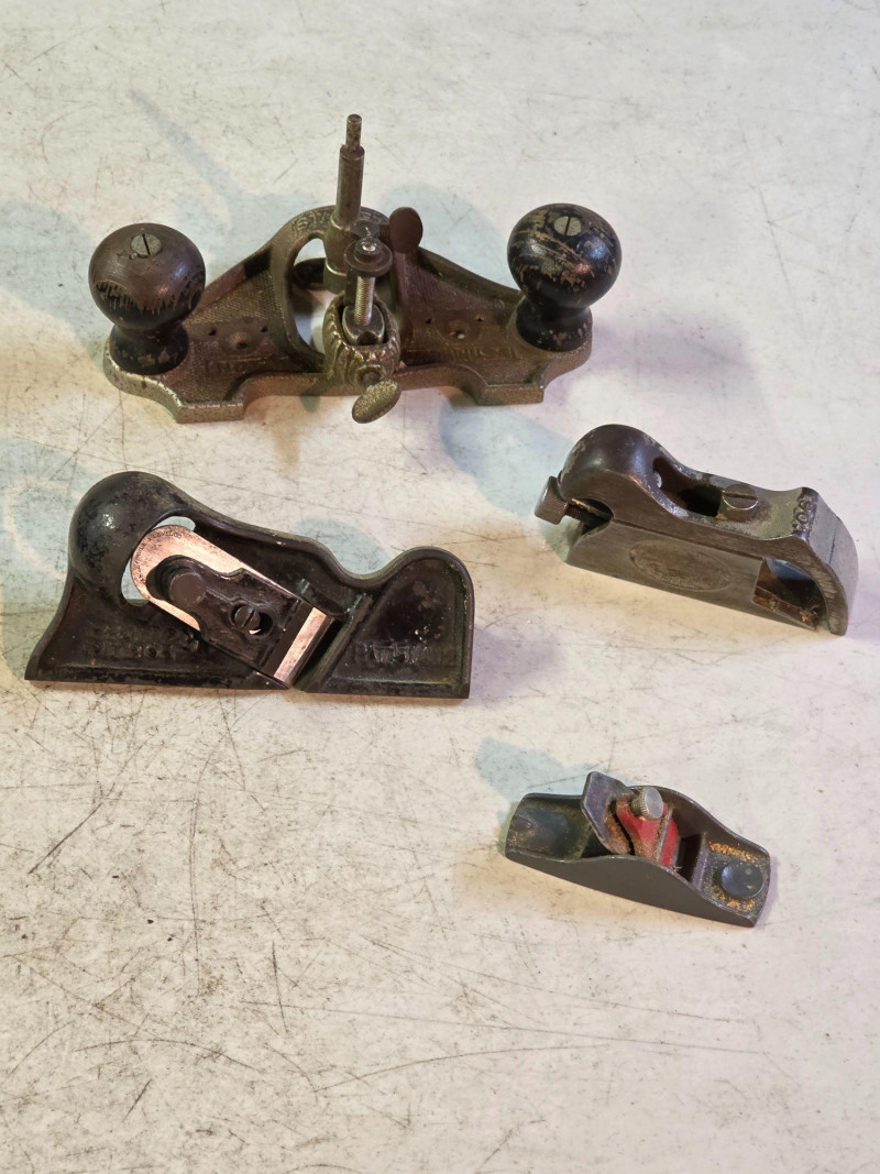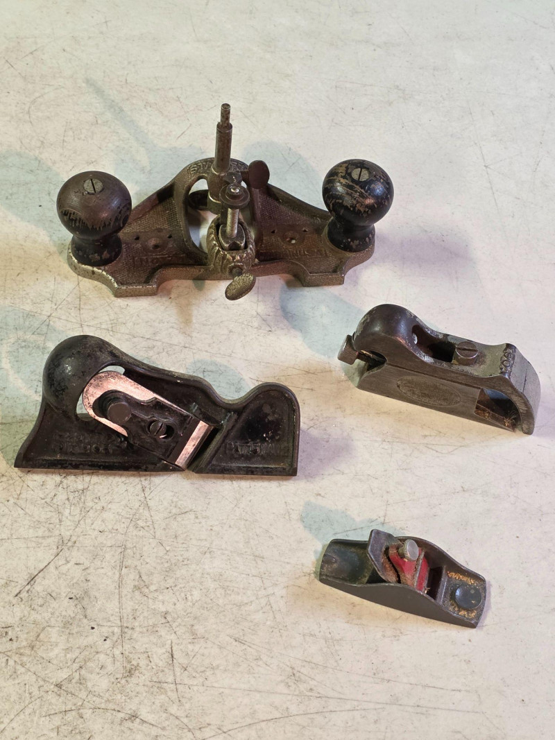 (4) Vintage Stanley Hand Planes (1) Stanley No. 71 1/2 "Hen's Tooth" Router Plane designed for cleaning out the bottom of grooves, dadoes, and background carvings (1) Stanley No. 95 Edge Trimming Block Plane designed specifically for trimming the edges of boards at a precise 90-degree angle (1911-1921) (1) Stanley No. 90 Bullnose Rabbet Plane designed for trimming and cleaning up joints, particularly in areas where a standard plane cannot reach (1) Stanley No. 101 Thumb Plane is a small block plane designed for light woodworking, modeling, or household use All tools were from a woodworker's shop and used, quite a cool collection!