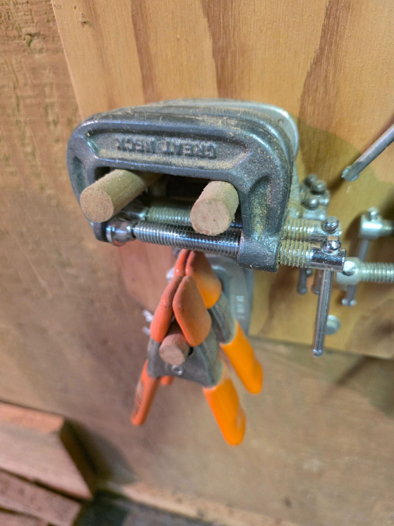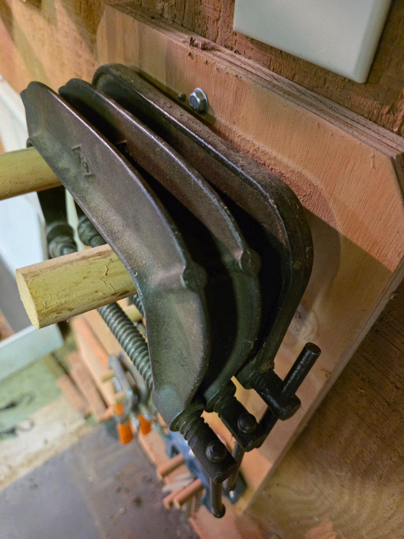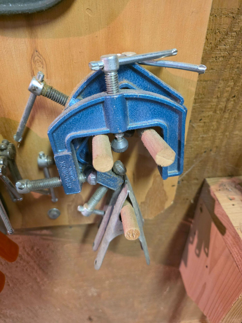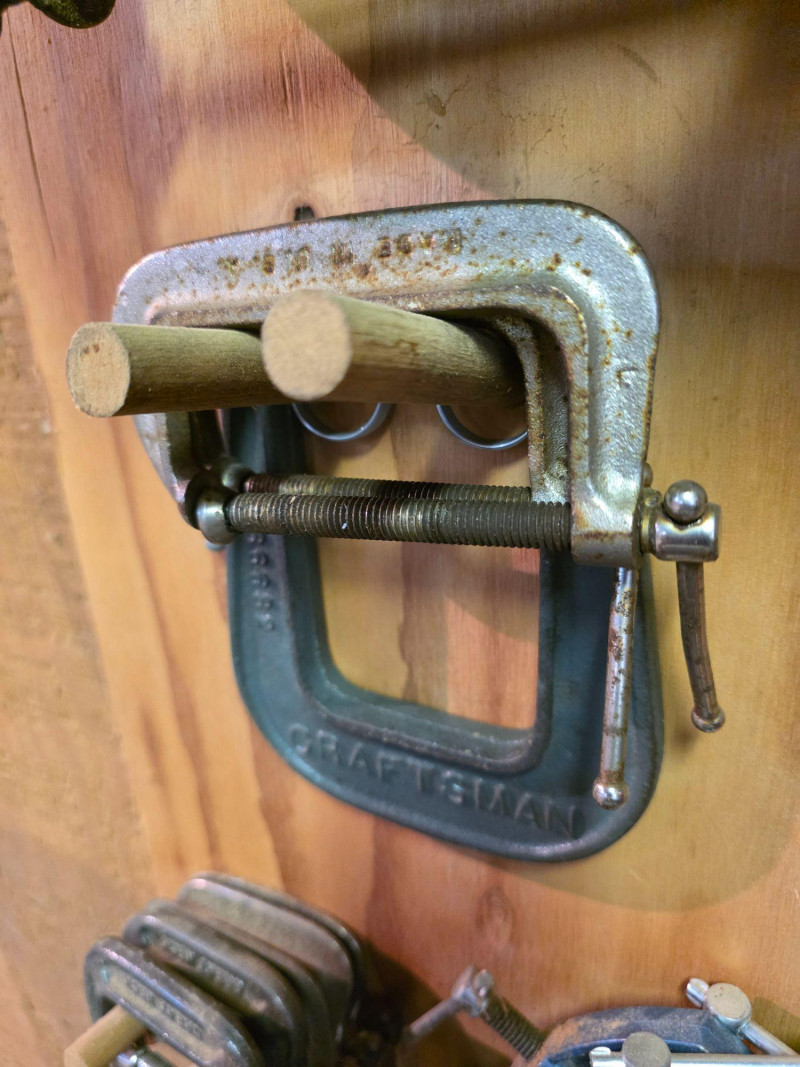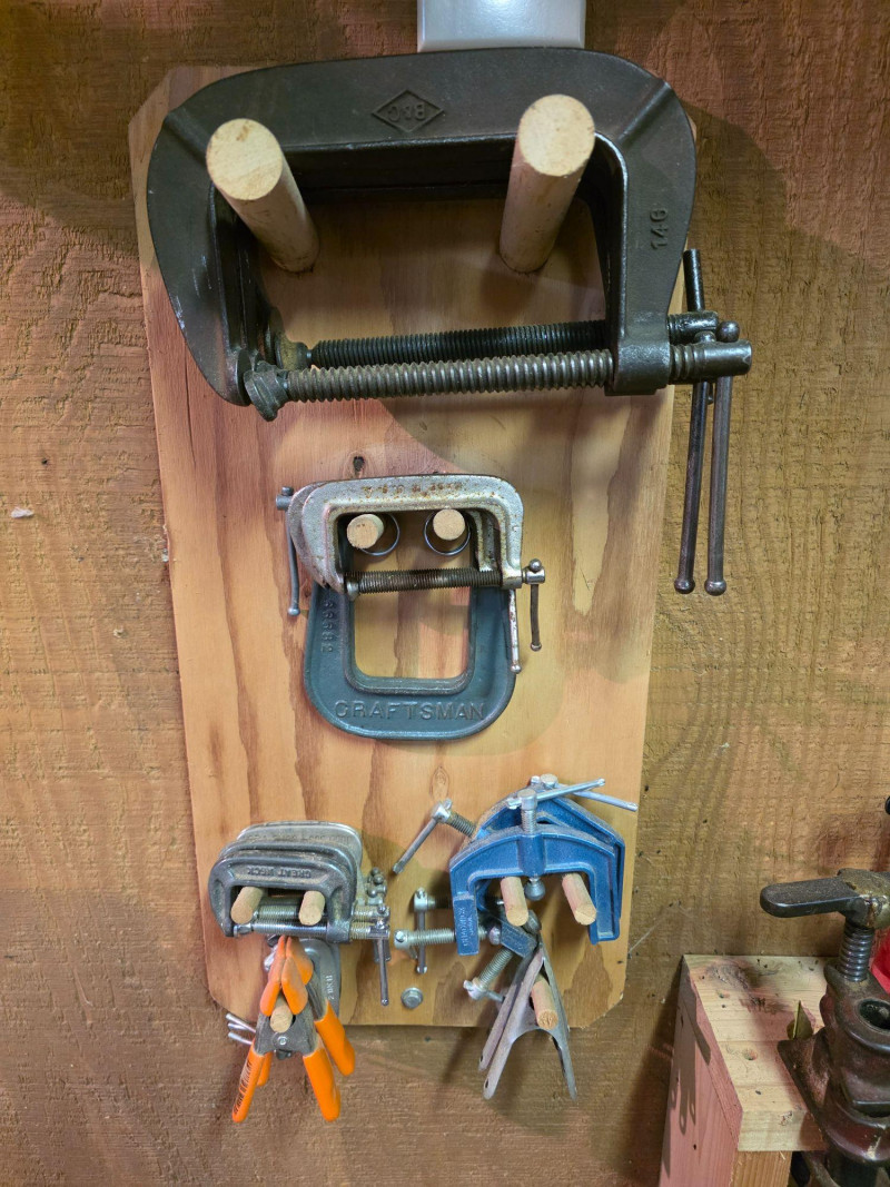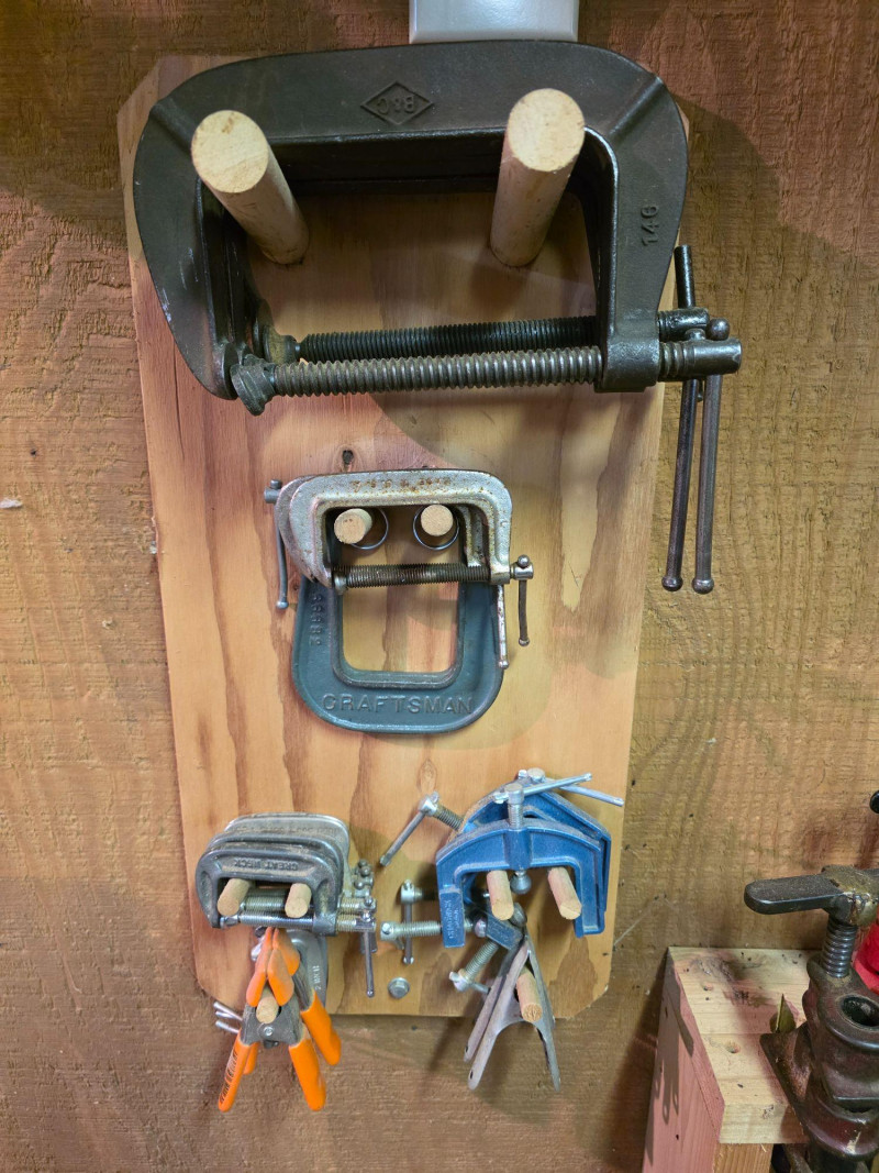 (22) C-Clamps With Wall Storage Rack (3) 6" C-clamps (2) 3.5" C-clamps (1) 2.5" C-clamp (8) 2" C-clamps (3) Chadwick 2-way clamp (5) Pressure clamps Hand-made wall rack for storage is pretty neat! Wall Rack is 24"T x 13"W x 6"D