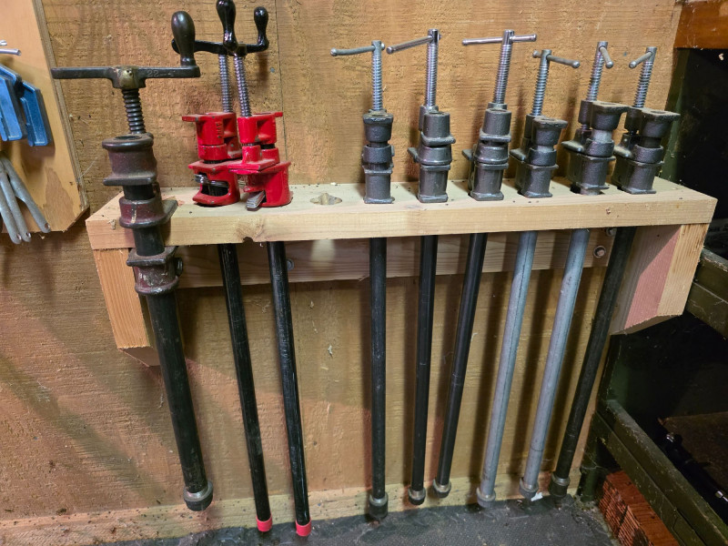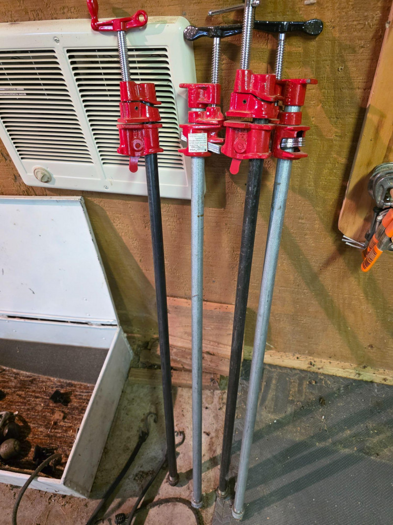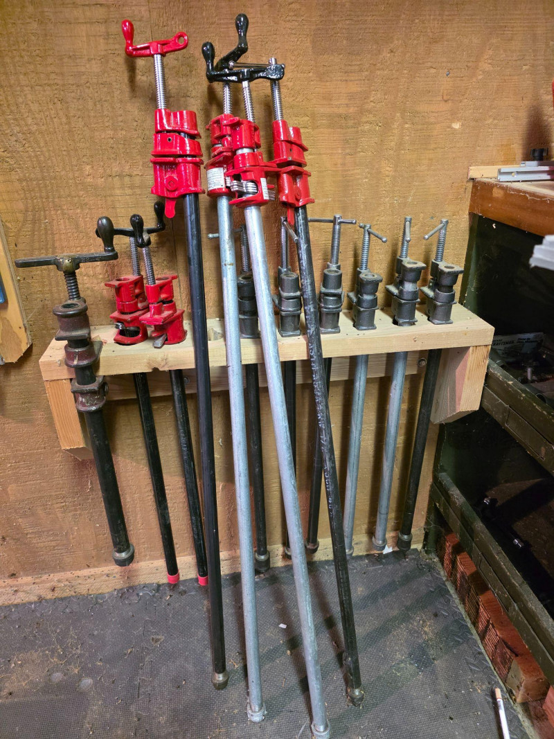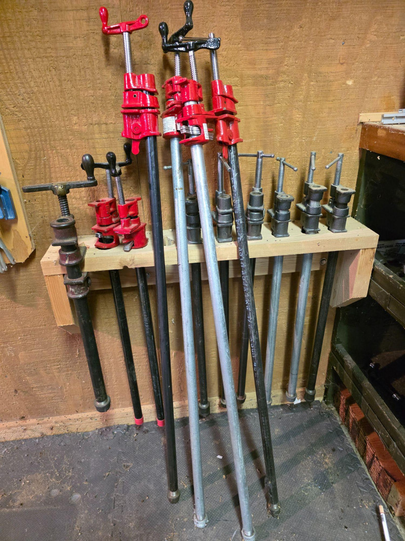(13) Pipe Clamps With Wall Storage Rack (8) 24" pipe clamps (4) 36" pipe clamps (1) 18" pipe clamp Hand-made wall rack for storage is pretty neat! Wall Rack is 9.5"T x 27"W x 5"D