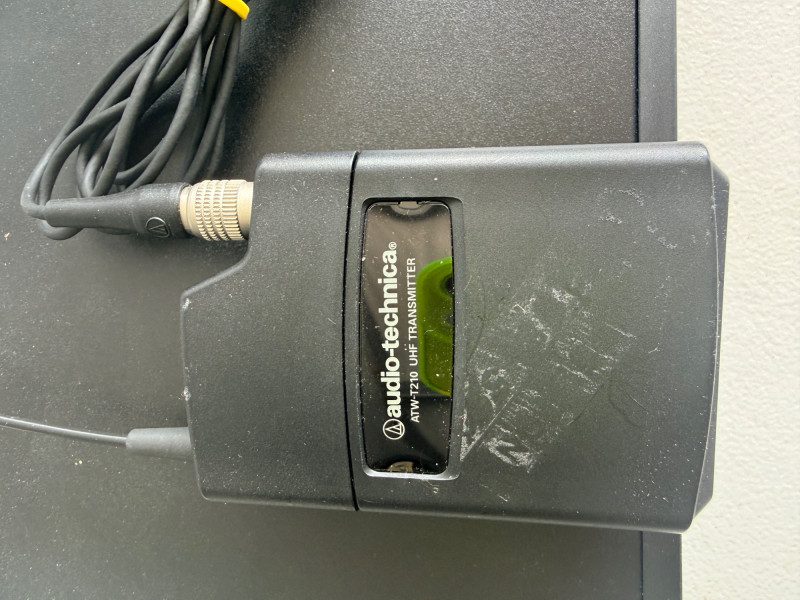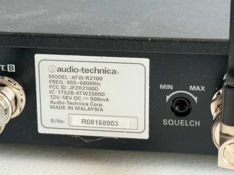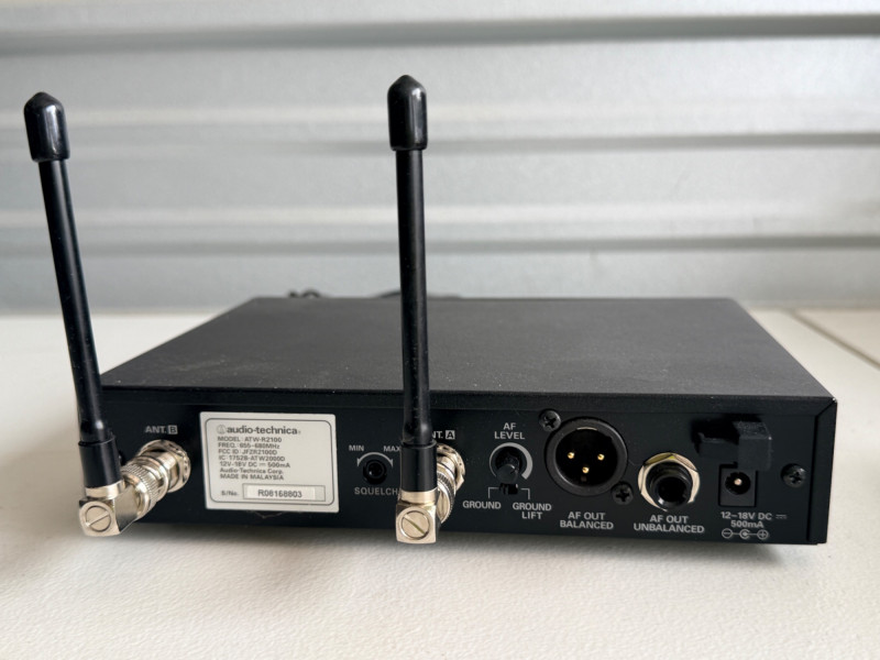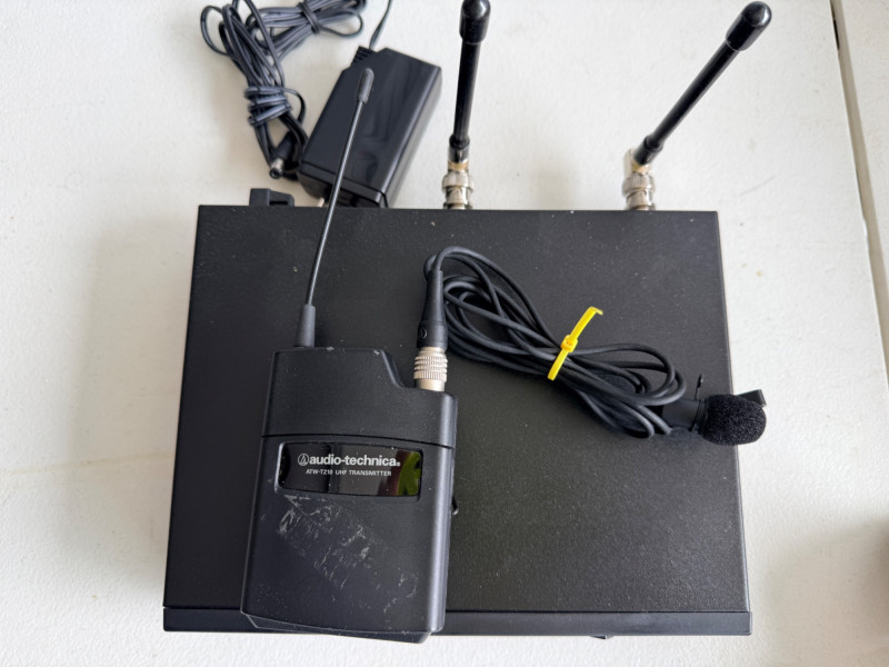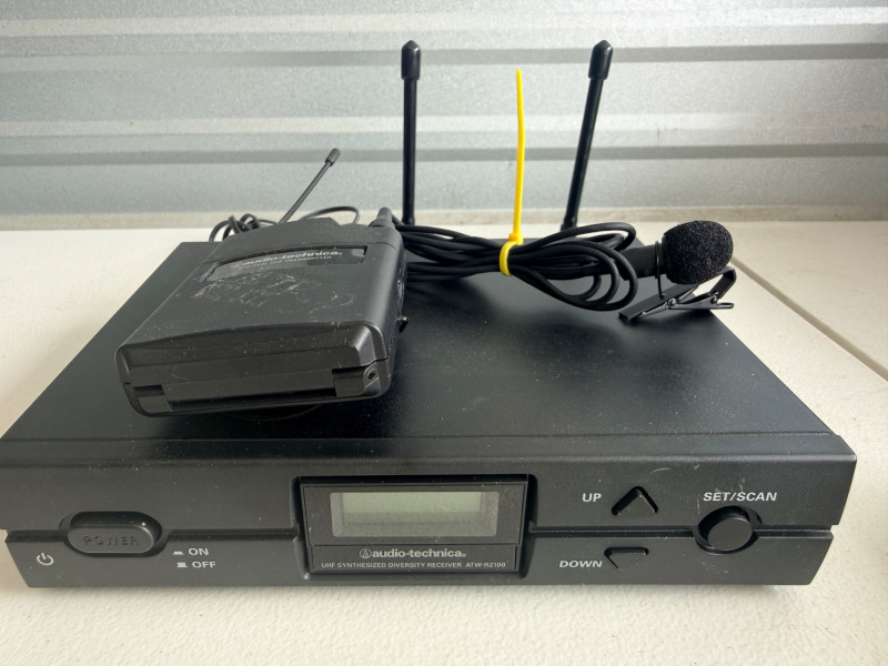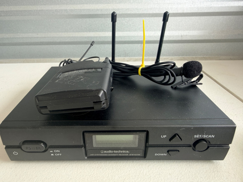 Audio-Technica ATW-R2100 UHF Synthesized Diversity Receiver along with an ATW-T210 UHF Body-pack Transmitter. Channels: Offers 10 compatible user-switchable channels within a specific UHF frequency range. Components: The system includes a rack-mountable receiver and a body-pack transmitter designed for live performances and various audio applications. Not tested, seller says works.