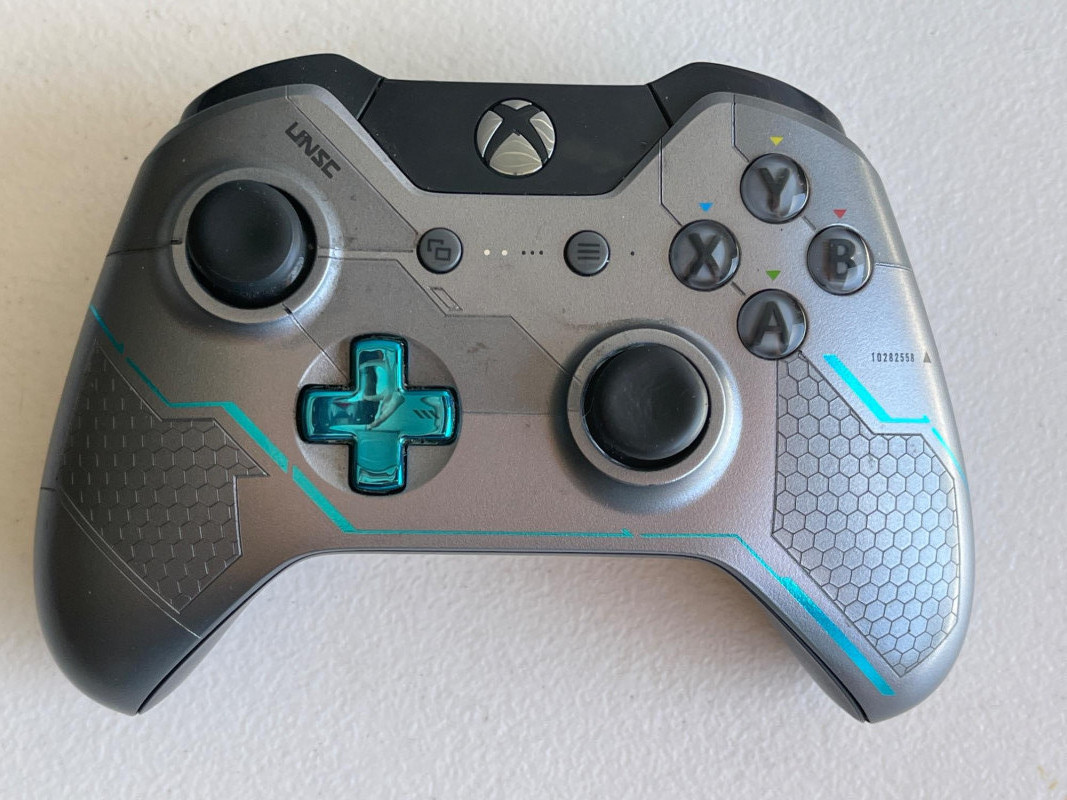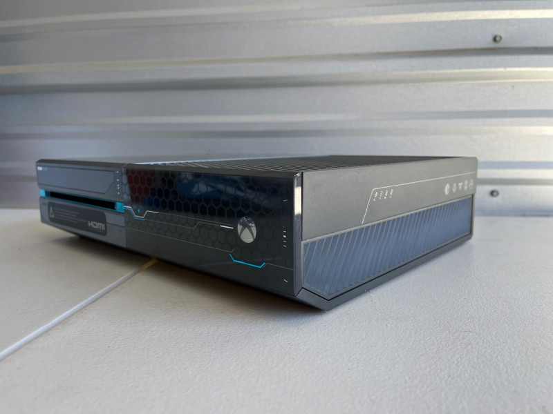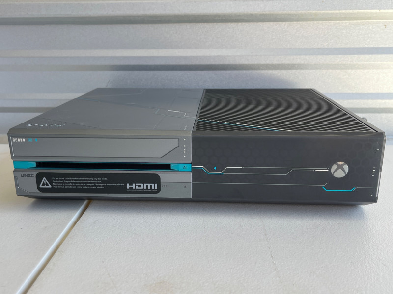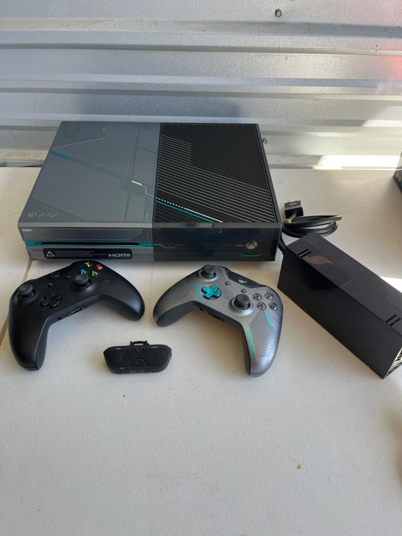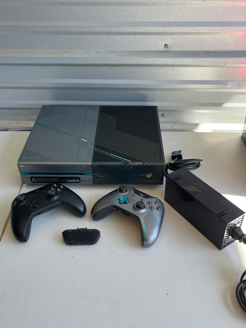 Microsoft Xbox One Halo 5: Guardians Limited Edition 1TB Console 1TB internal hard drive. Custom metallic gray and black finish with laser-etched "futuristic" details and blue/cyan accents inspired by Spartan Locke and UNSC technology. Unique custom sound effects for powering on, powering off, and ejecting discs. Standard Xbox One ports like HDMI, USB, and Wi-Fi capability. Limited edition Spartan Locke Wireless controller. Two black wireless controllers. Turtle Beach wired headphones with audio controller plus. Includes power cord. Not tested.