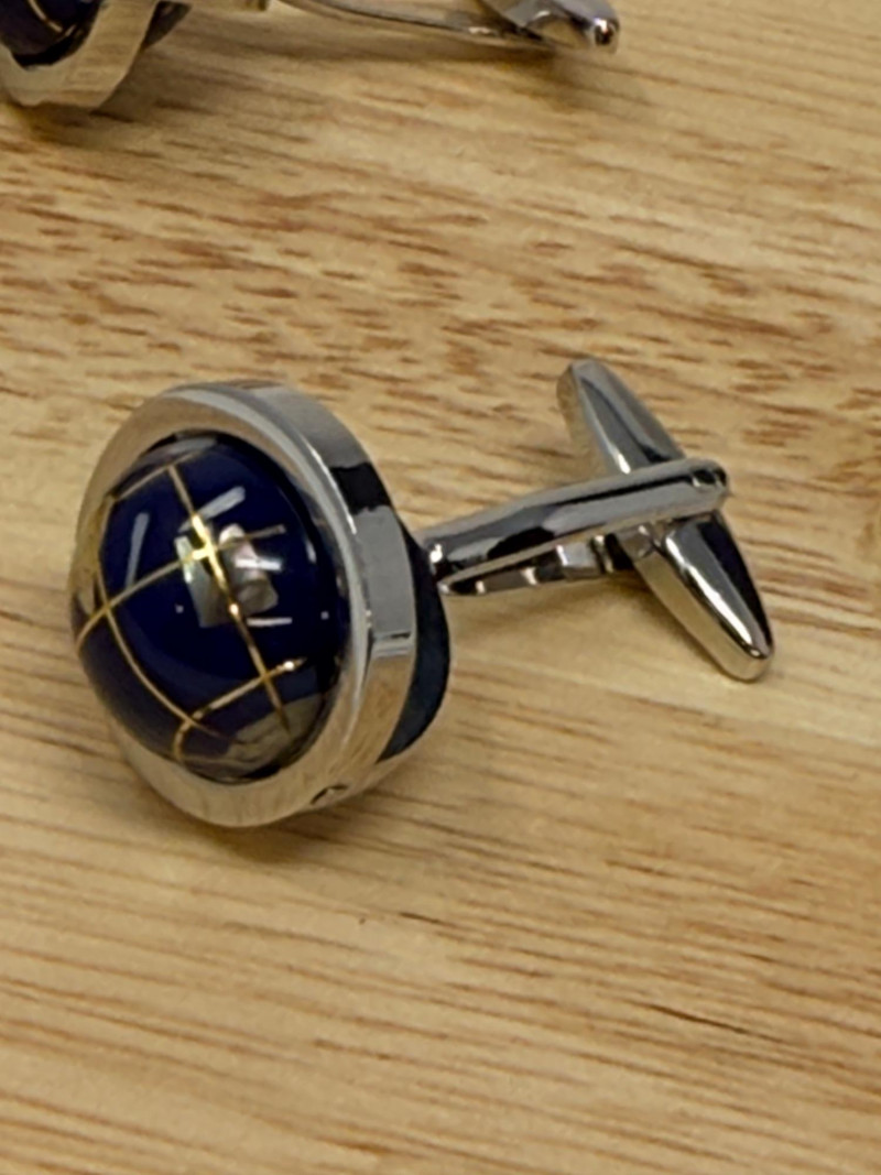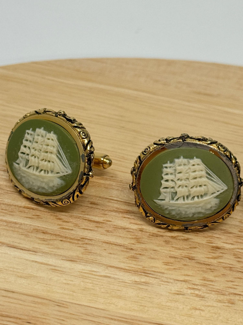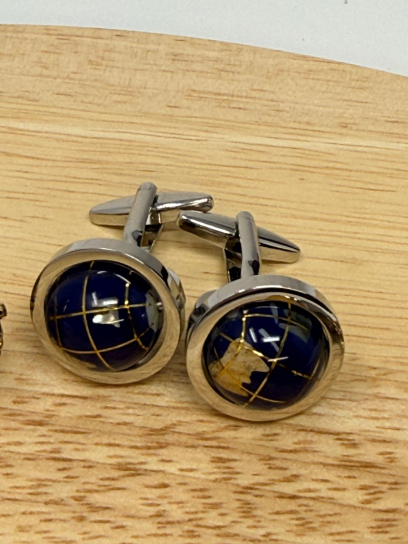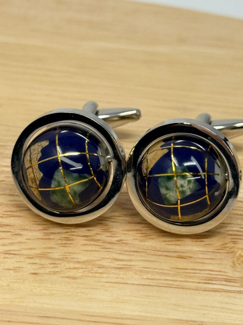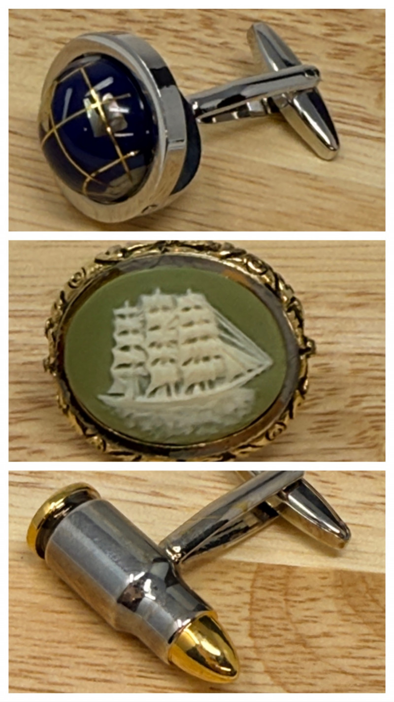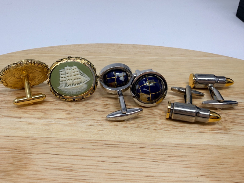 (3) Unique Pair of Cufflinks The cufflinks feature a white relief of a sailing ship set against a green background, often identified as Incolay stone or a resin material. They are typically dated to the 1960s (2) Blue and gold spinning globes in the pair on chrome frame.