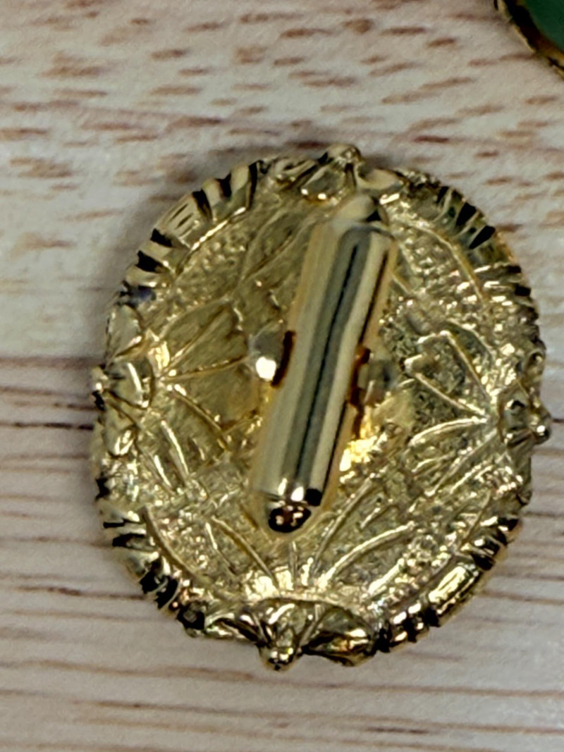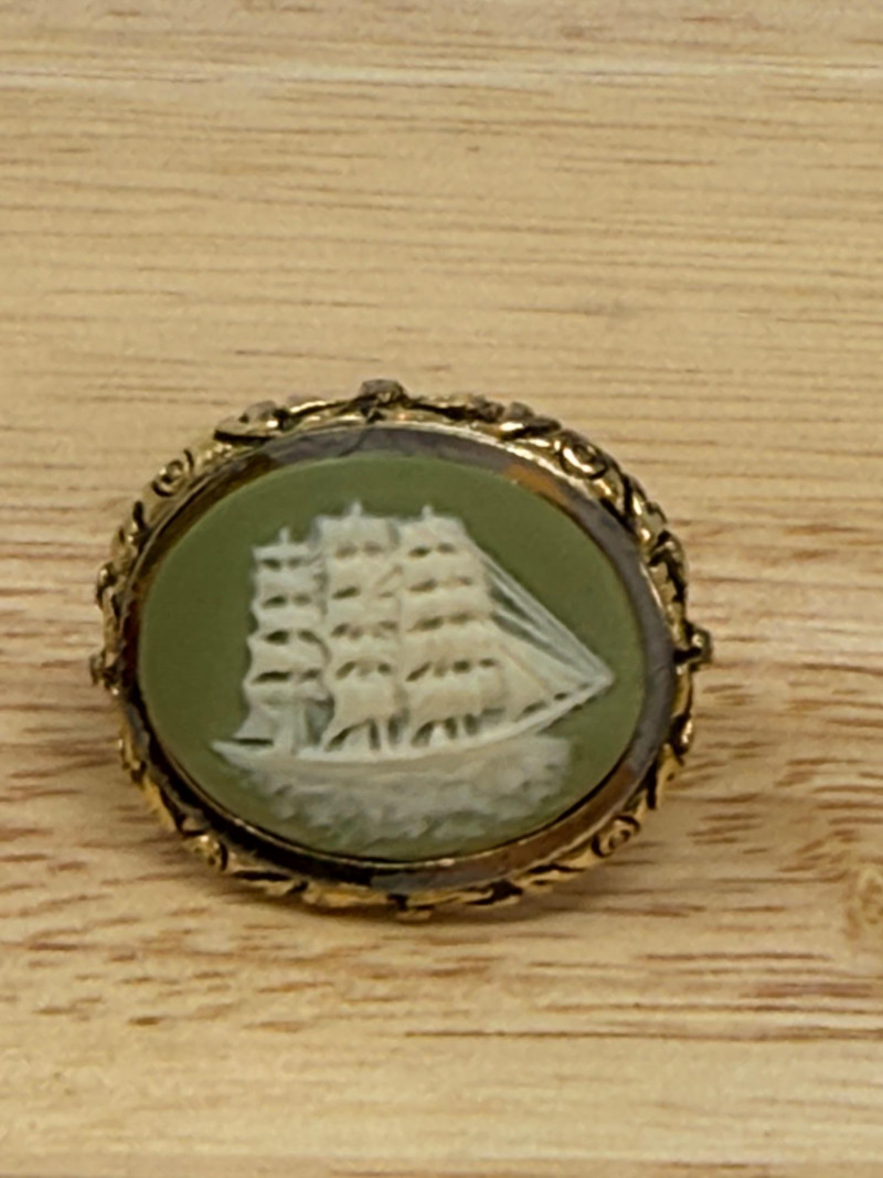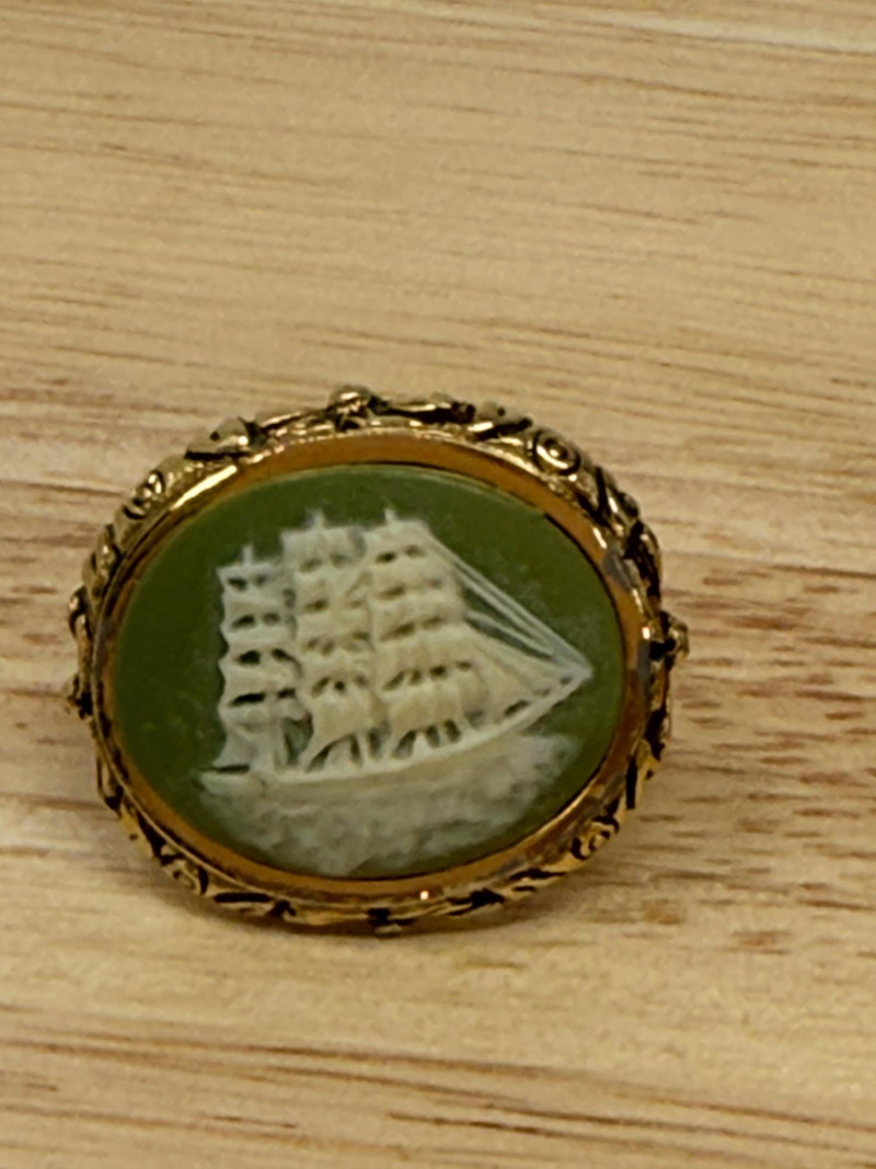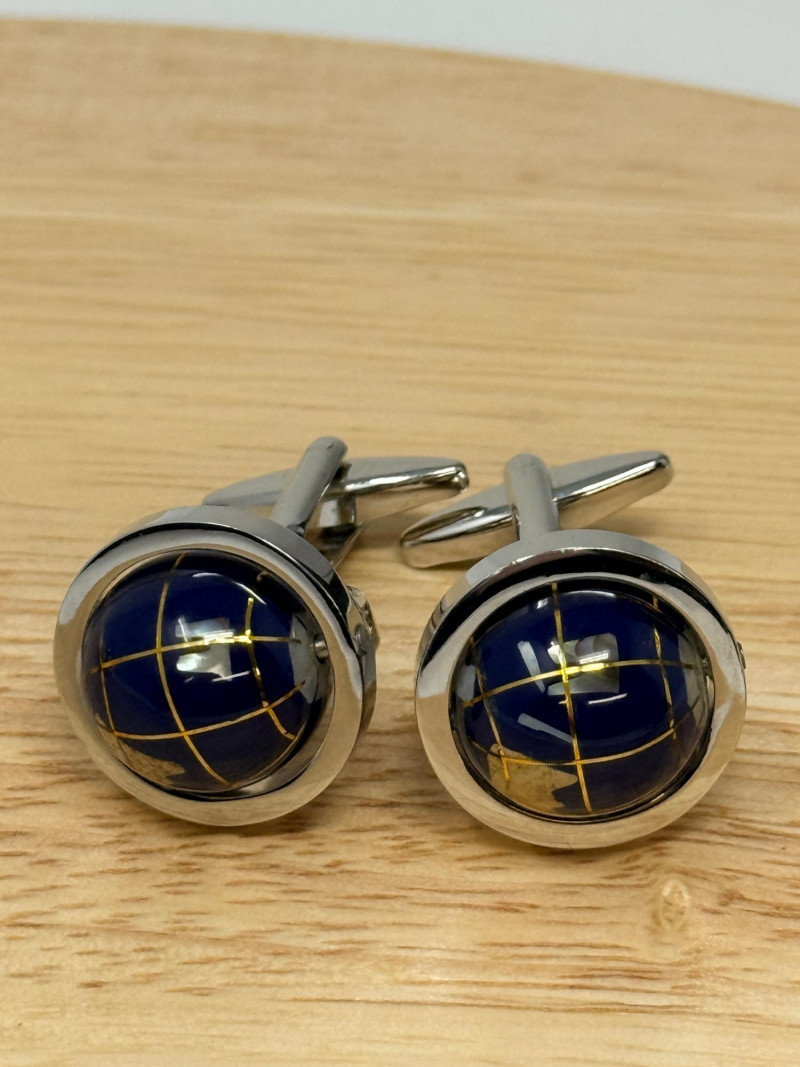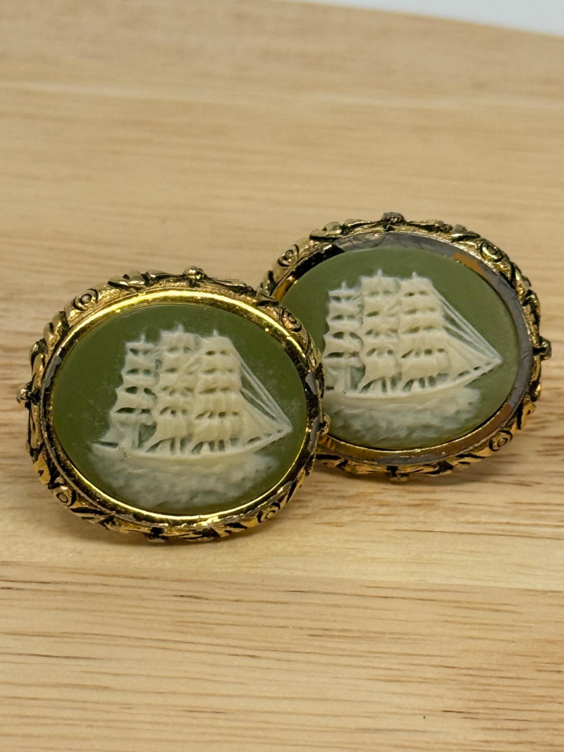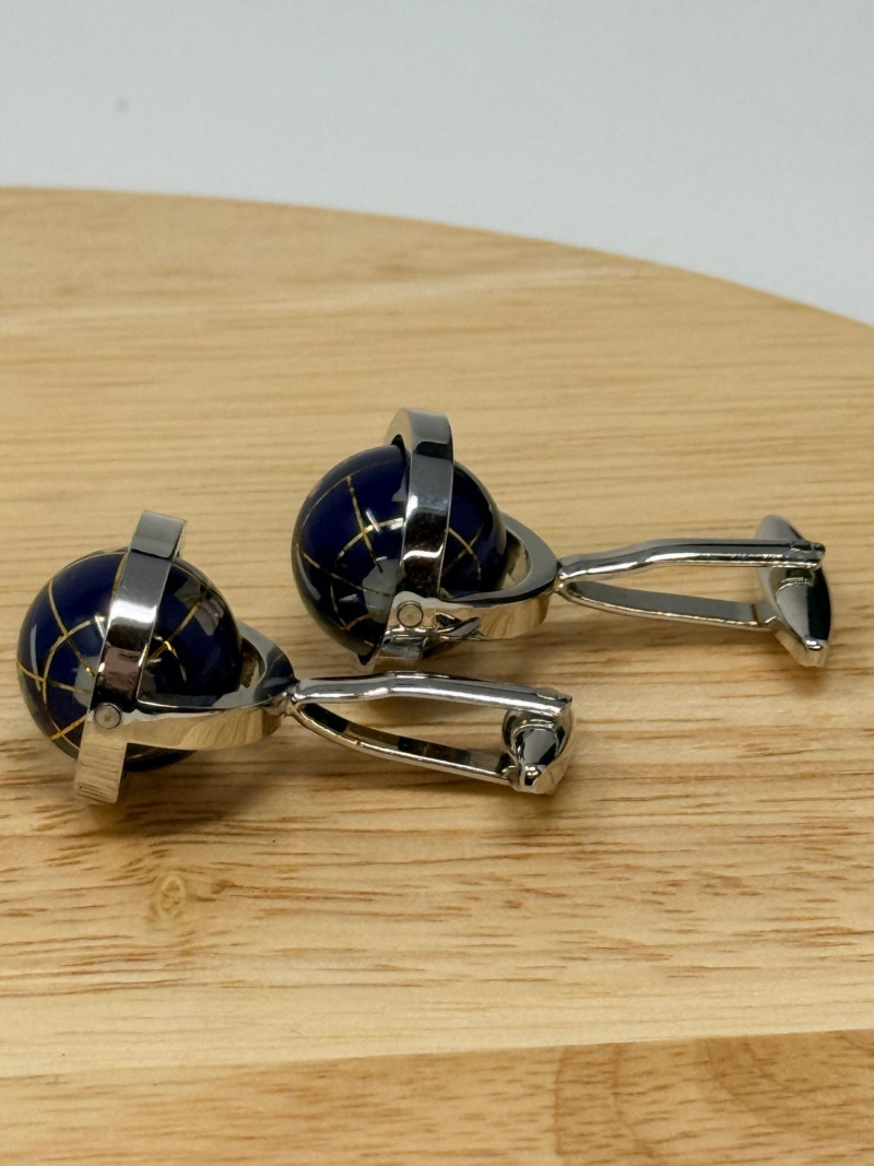 (3) Unique Pair of Cufflinks The cufflinks feature a white relief of a sailing ship set against a green background, often identified as Incolay stone or a resin material. They are typically dated to the 1960s (2) Blue and gold spinning globes in the pair on chrome frame.