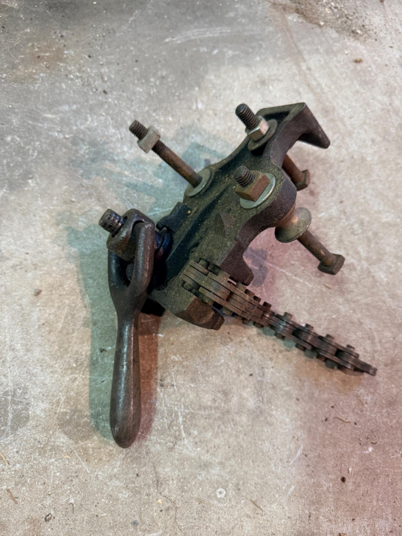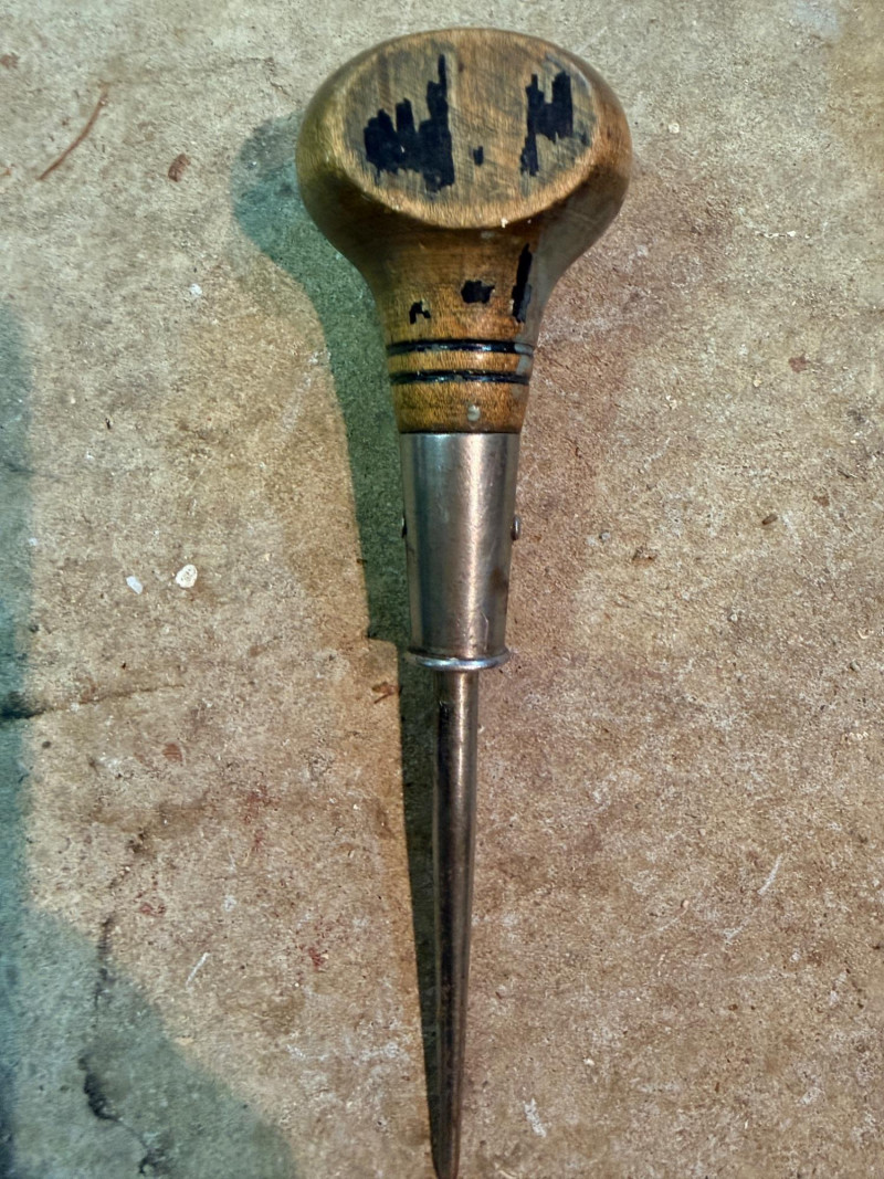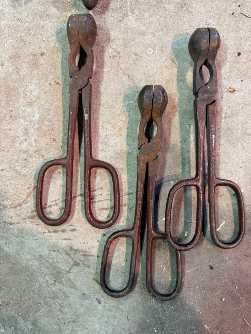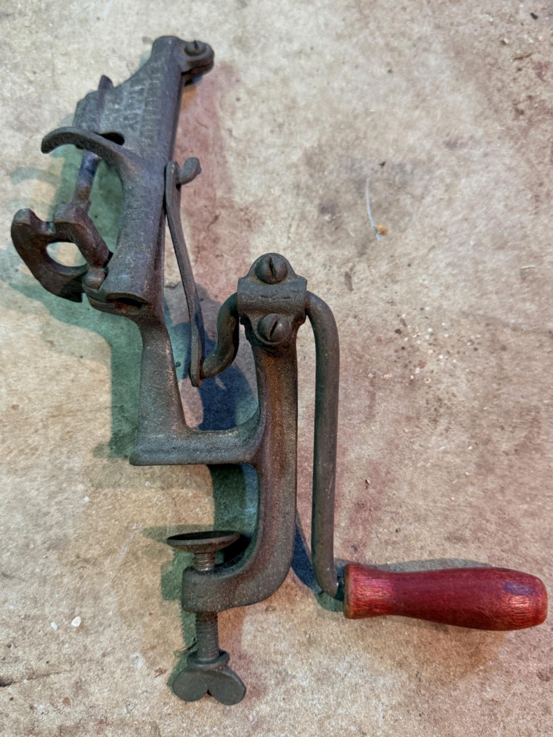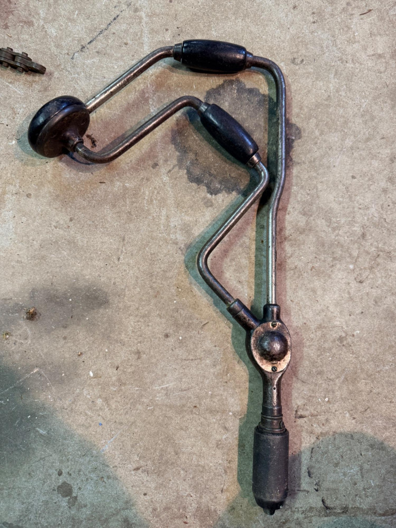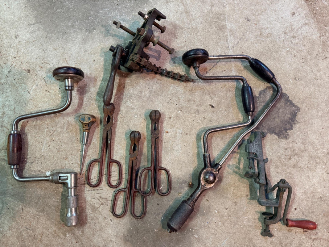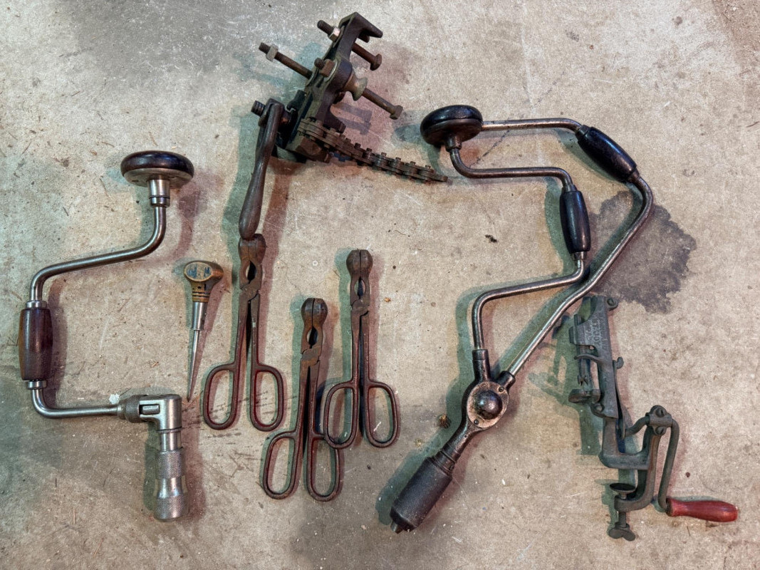 Cast iron cherry stoner pitter Vintage corner bit brace with wood handles Wood Handle Scratch awl 3 antique and rusty seaming pliers for tin seams Ratcheting bit brace hand drill with wood handle