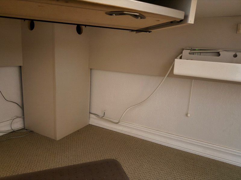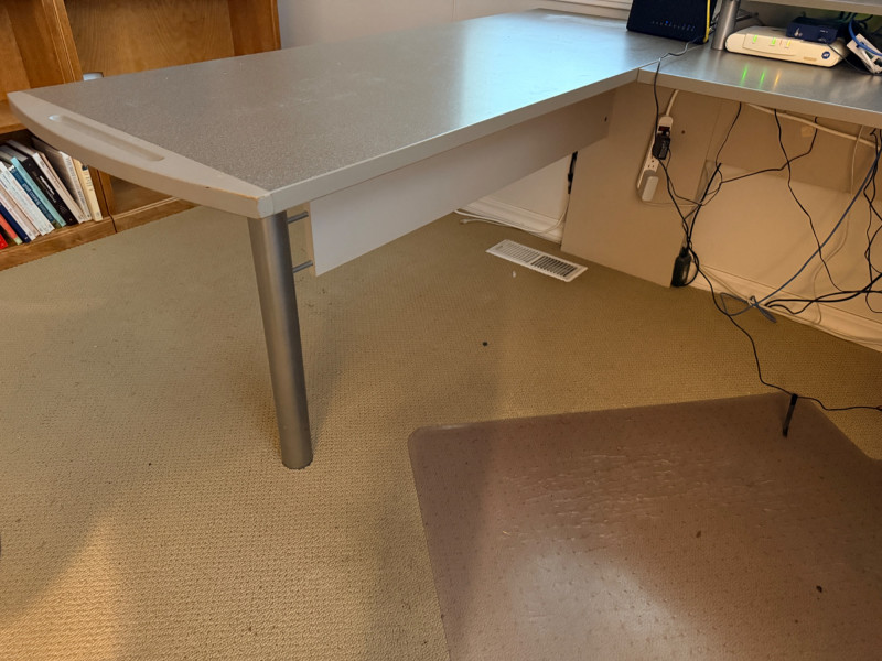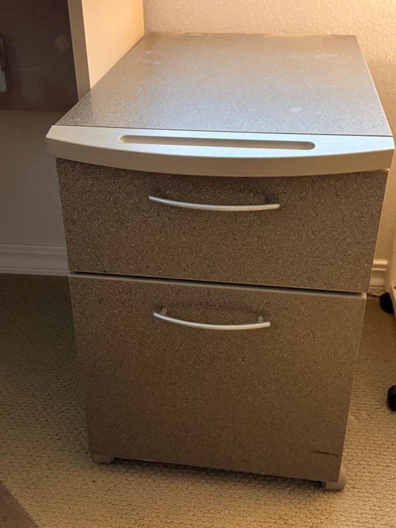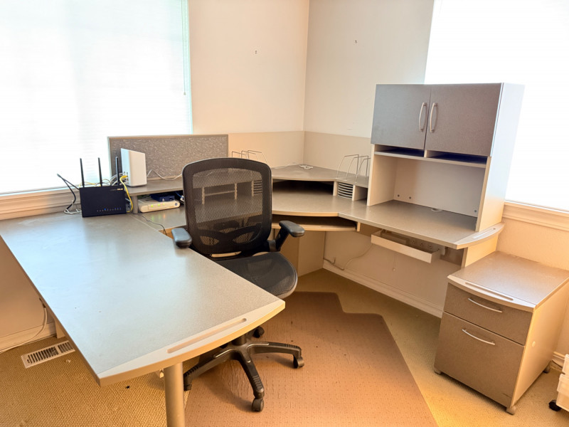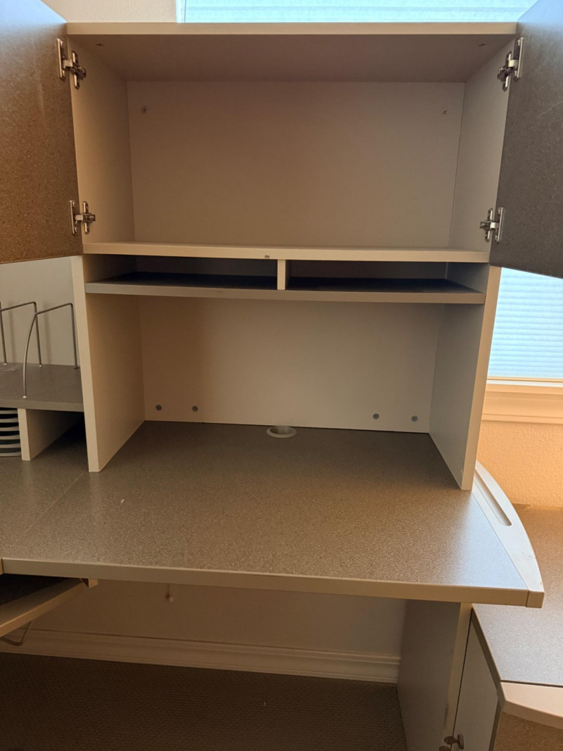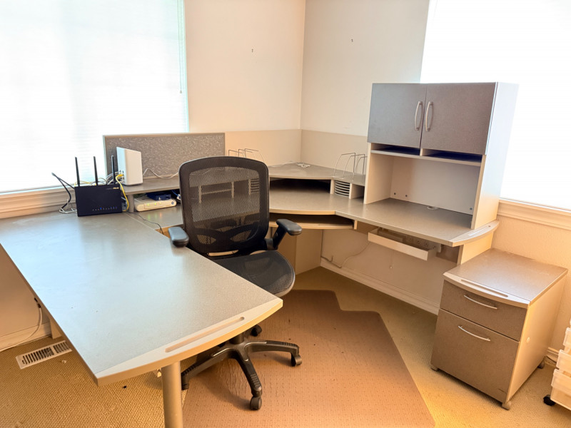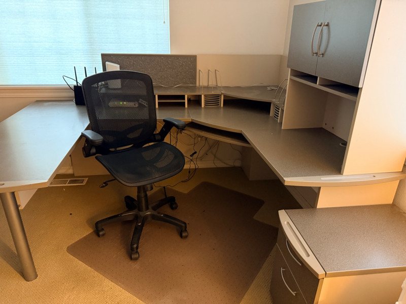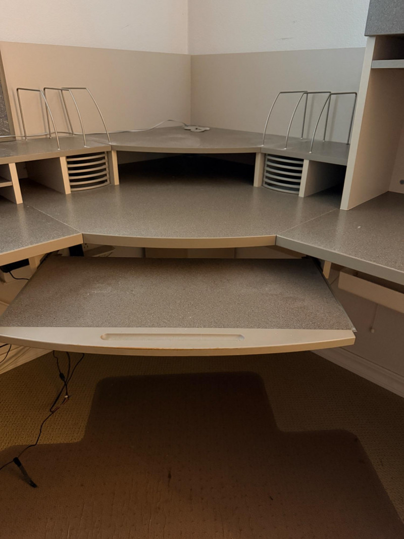 66”x89” U shaped workstation. Speckled gray laminate top 28”x29” unattached hutch cabinet Sliding keyboard tray Rolling 2 drawer file cabinet (pencil tray has pulled away and needs glue) 45” back and 29”desk surface height.