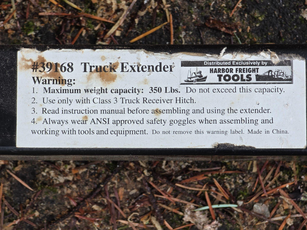 Haul Master Truck Bed Extender Harbor Freight Part #39168 This hitch-mounted accessory is designed to extend the utility of a pickup truck bed for carrying longer loads Hitch-mounted (fits 2 in. receivers) Maximum weight capacity 350lbs Includes 2 hitch pins & 2 cotter pins!