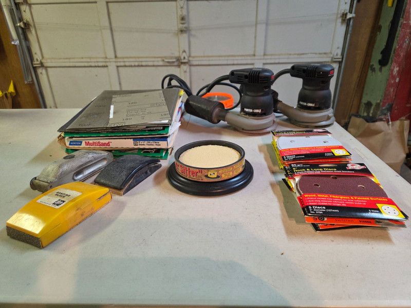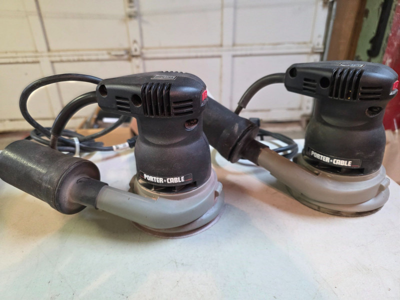 The Ultimate Sanding Lot For Machine Or Hand Sanding! (2) Porter Cable 5" Random Orbit Palm Sanders - Model #333VS (11) Packs of 5" Ssanding Discs (60-220grit) (1) Sander Sitter: Orbital Landing Pad (3) Hand Sanding Blocks & tons of sandpaper Sanders Tested - Both Work!