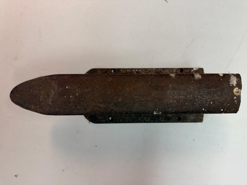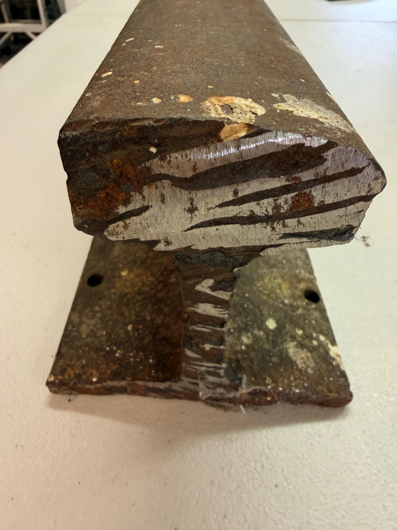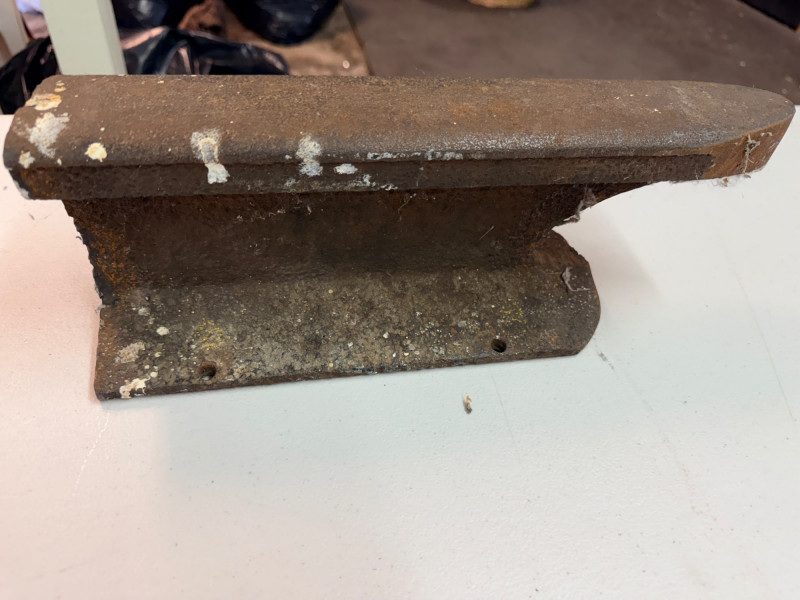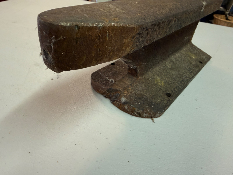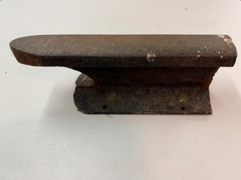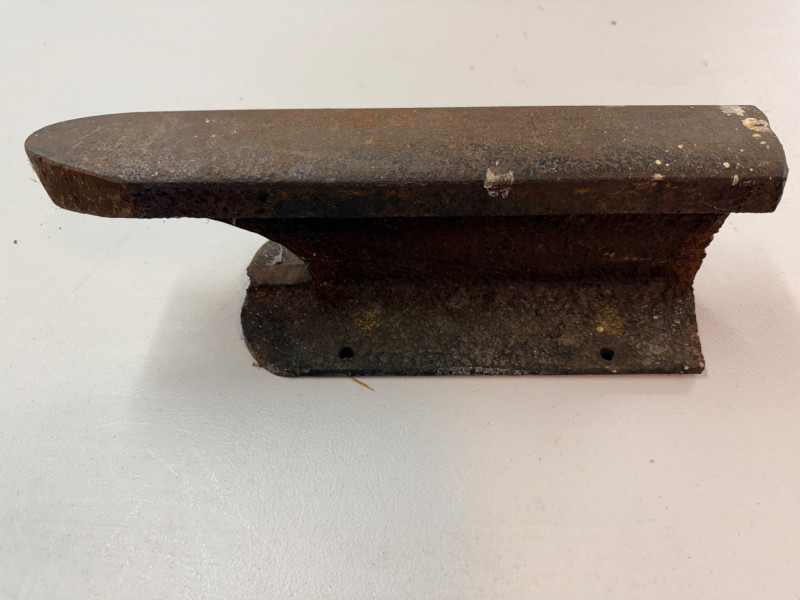 Rustic railroad track anvil, a tool handcrafted from a section of salvaged train track steel. Suitable for light blacksmithing, metalworking, or as a decorative item/paperweight. Features a flattened working surface and one end cut into a horn shape for shaping metal 14.5”x5”x5”