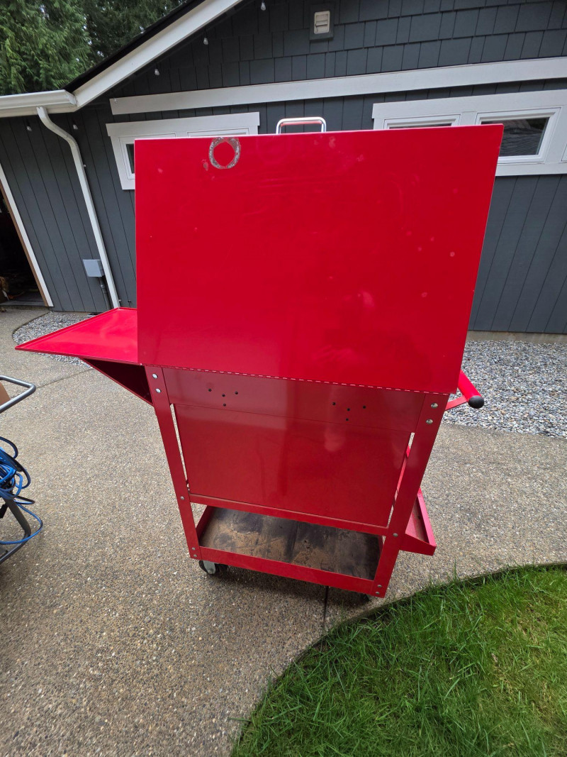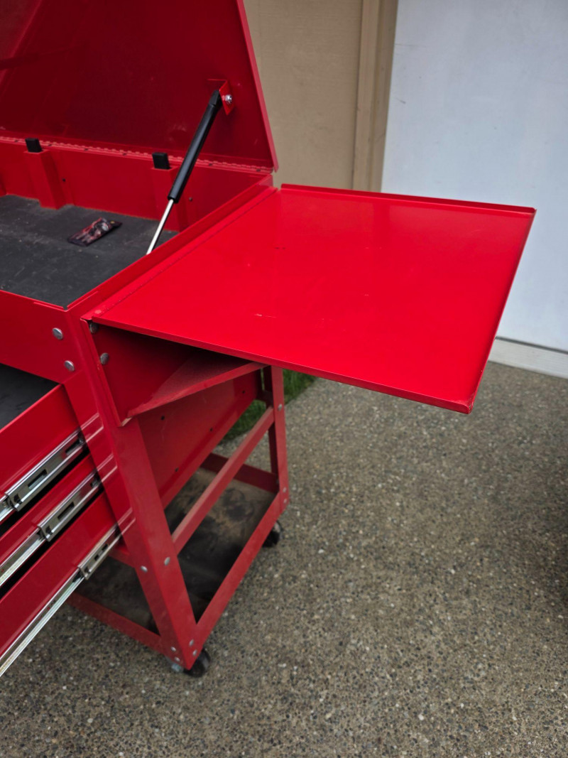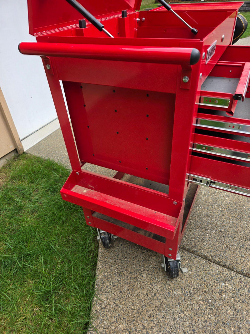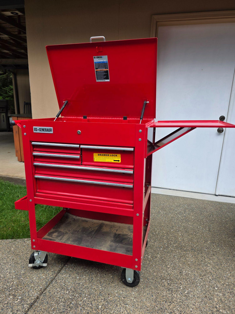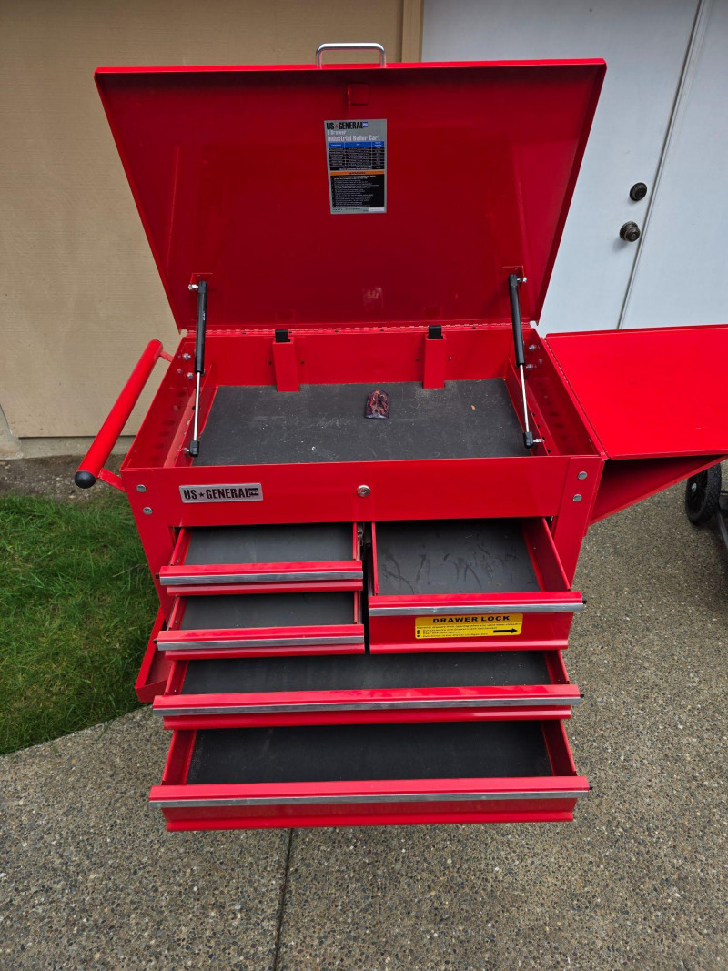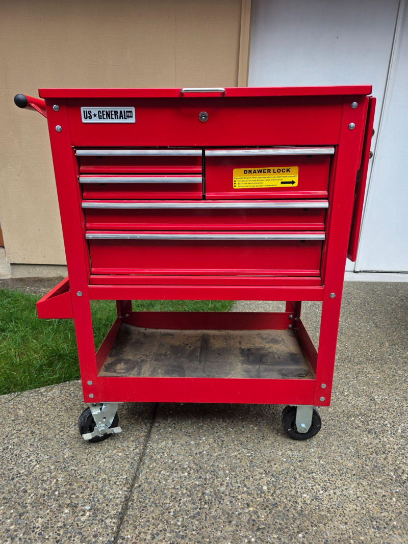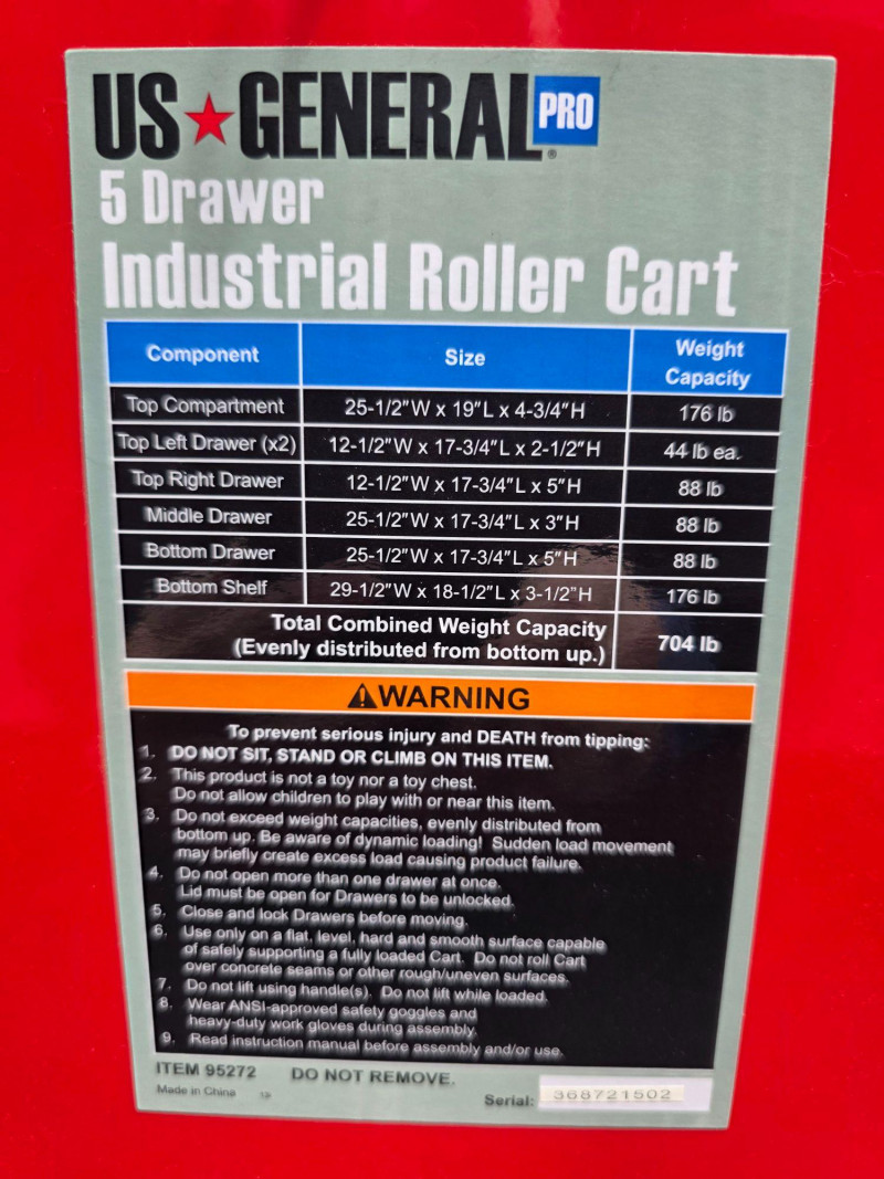 US General 5-Drawer Industrial Roller Cart Model #95272 Offers 15,000 cubic inches of total storage, a 704 lb capacity, and features full-extension ball-bearing slides, a top compartment, and a security lock, making it ideal for professional or home garage organization Capacity: 700-704 lb load capacity. Storage: 5 drawers with full-extension ball-bearing slides and a deep top compartment. Dimensions: Approximately 30-inch width, often featuring a 38-1/4 in. height Build: All-steel construction with a powder coat finish Mobility: Four casters (2 fixed, 2 locking swivel) Security: Barrel lock included for locking drawers Extra Features: Includes drawer liners, and many models feature an integrated side storage tray Includes 4 keys & drawer liners Dusty and paint is damaged on the top (see pics) 42"T x 35"W x 21"D