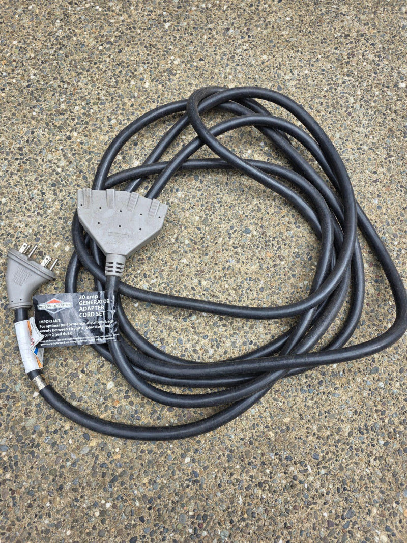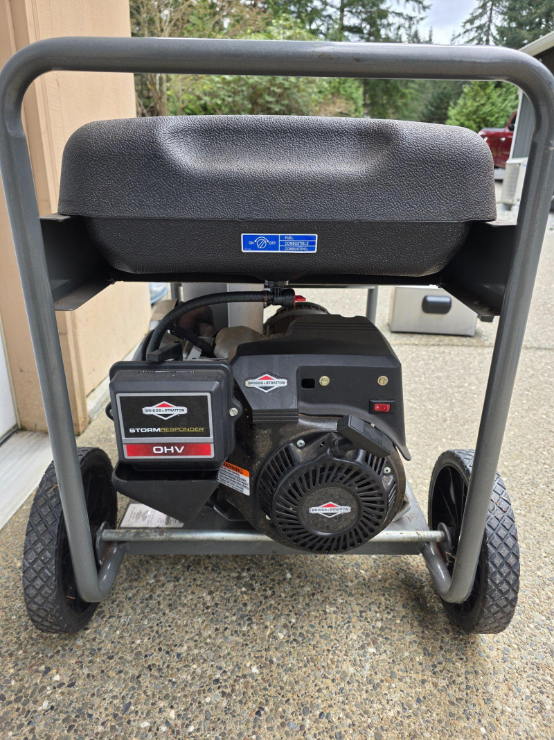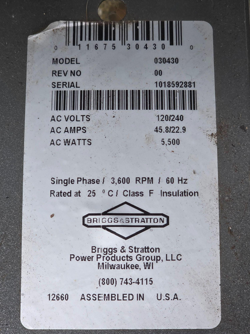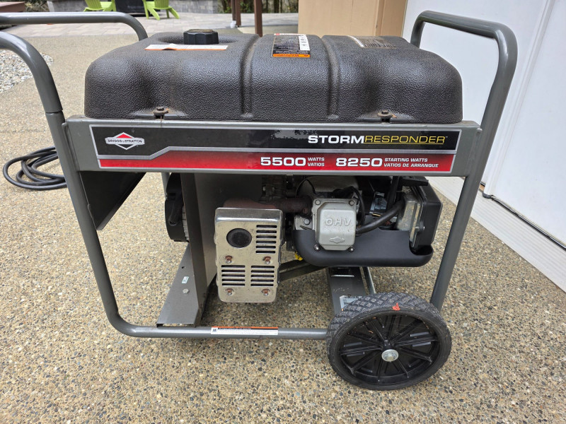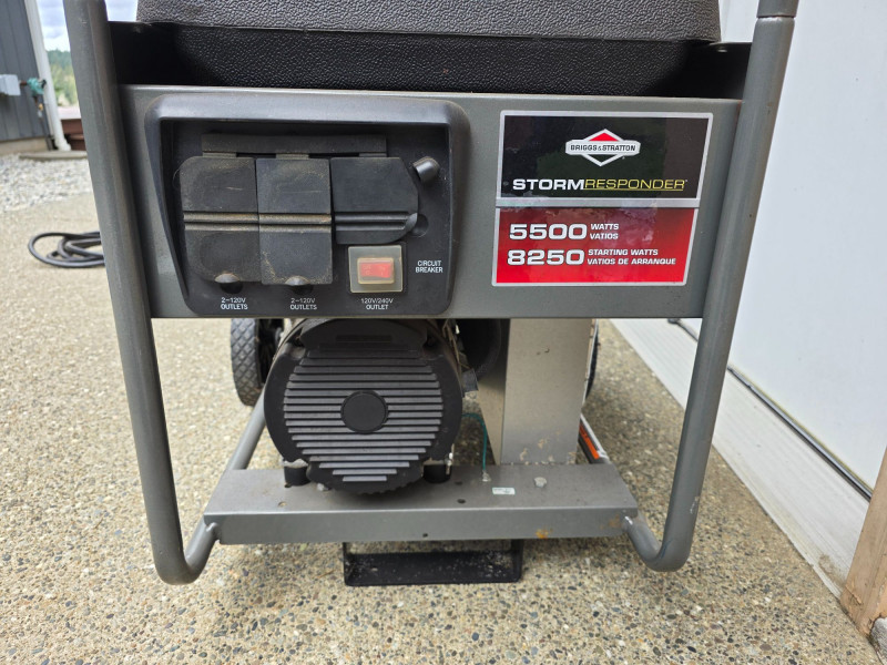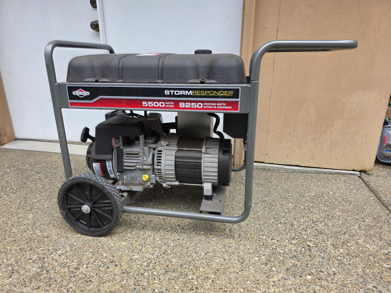 Briggs & Stratton Storm Responder 5500W Portable Generator Model #30430 Power Output: Delivers 5,500 running watts and 8,250 starting watts. Powered by a Briggs & Stratton OHV engine. Features a 7-gallon fuel tank that provides approximately 11 to 13 hours of runtime at 50% load. Includes 4 120V household outlets and 1 120V/240V 30A locking outlet Includes a long outdoor extension cable & 20 Amp generator adapter cord set Tested - Works! 28.5"T x 41"L x 24"W