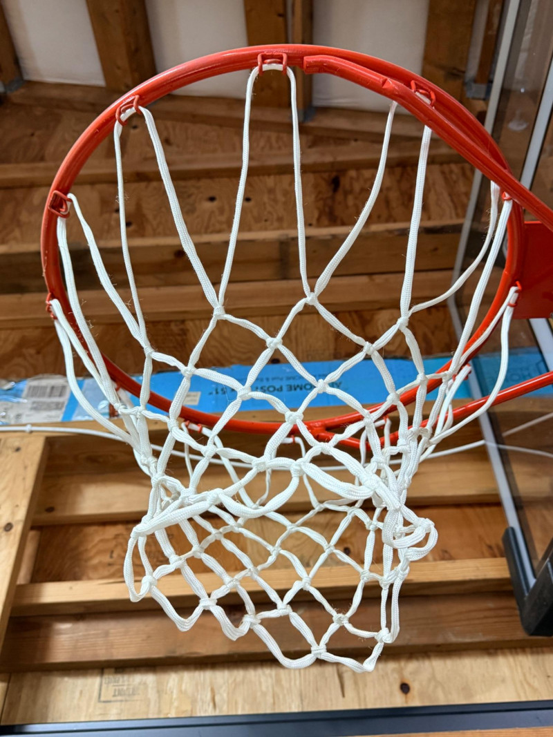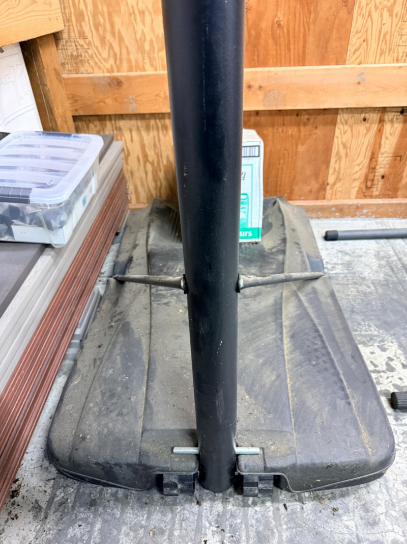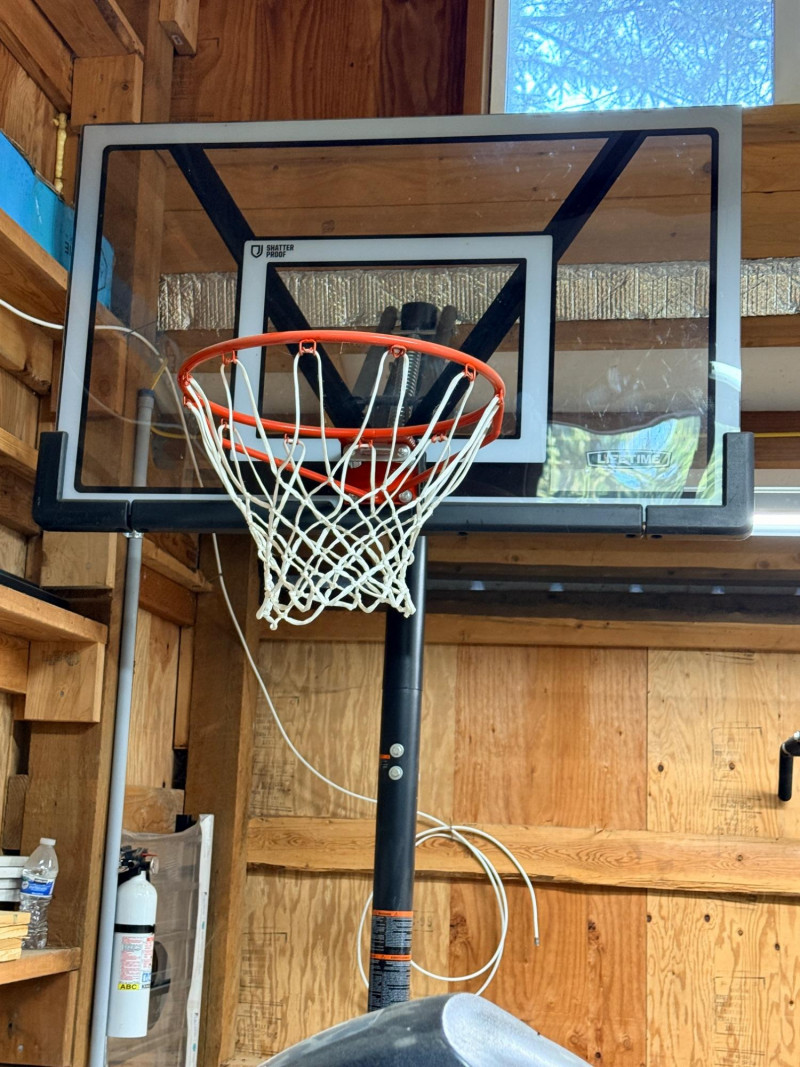 Lifetime Basketball Hoop Stored inside and in good condition! Front wheels for moving and fill with water or sand for stability.