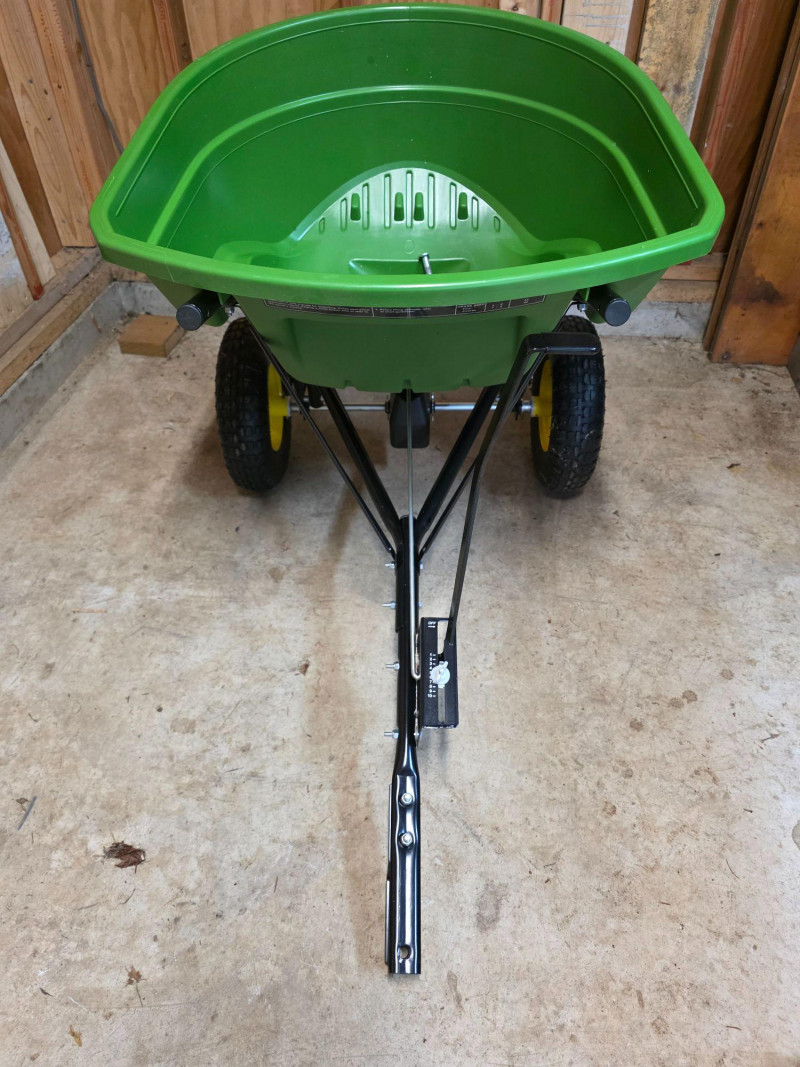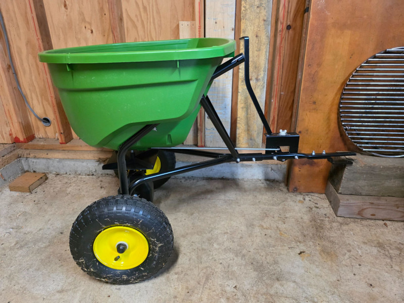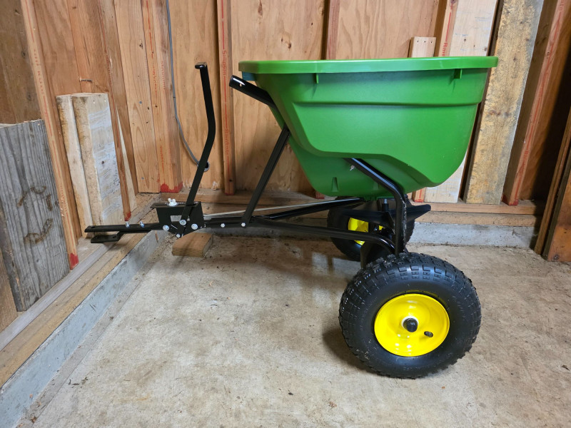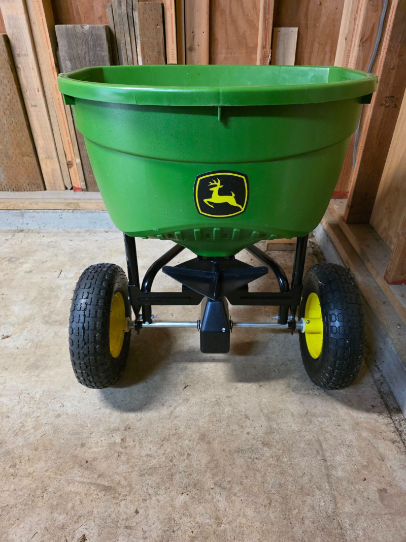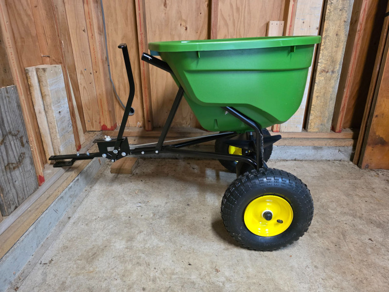 John Deere 130lb Broadcast Tow Spreader Model #45-0463-JD 130 lb capacity polyethylene hopper covers approximately 1/2 acre (25,000 sq. ft.) per fill Capable of a broad coverage of up to 12 feet wide Designed for broadcasting fertilizer, grass seed, and ice melt Features a rustproof polyethylene hopper and an enclosed commercial-grade gearbox with heat-treated steel gears Equipped with 13" x 4" pneumatic tires to navigate various lawn conditions In nearly new condition! 22"T x 45.5"L x 26.5"W