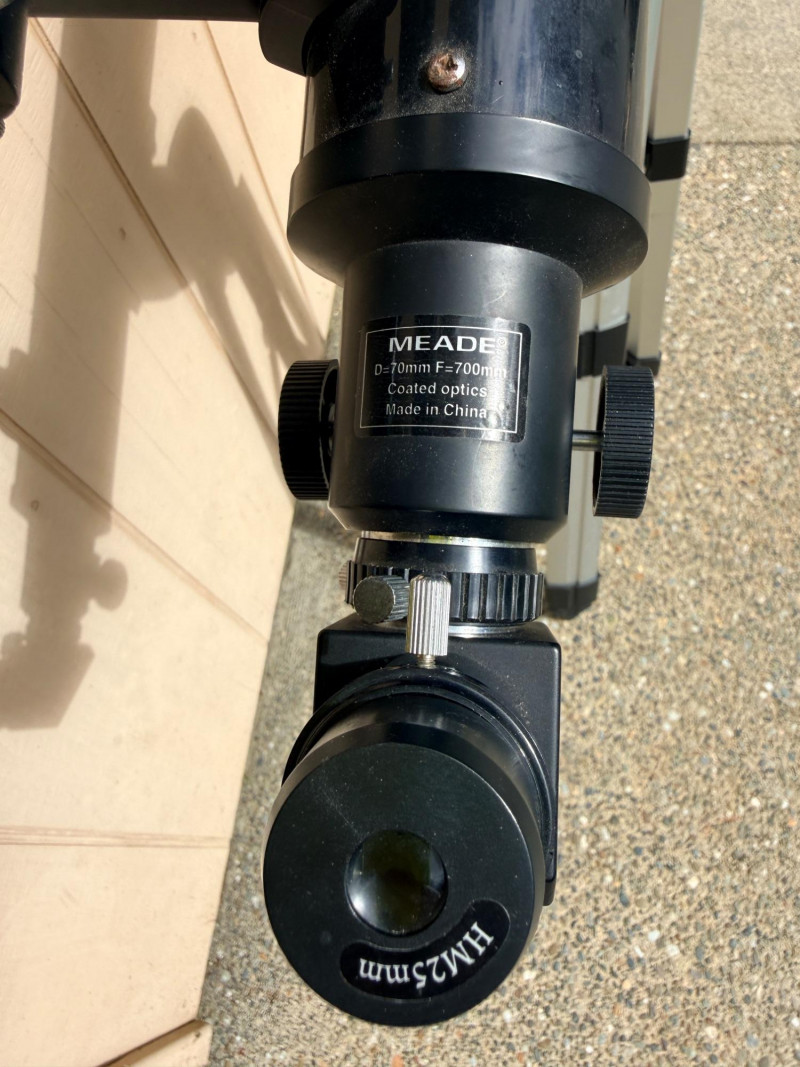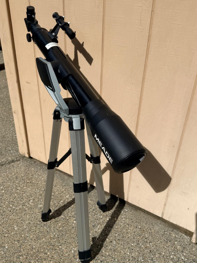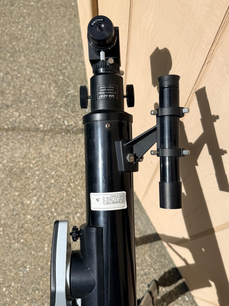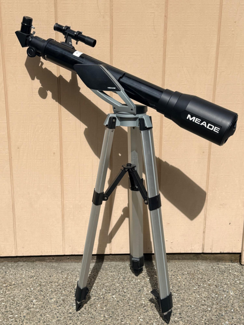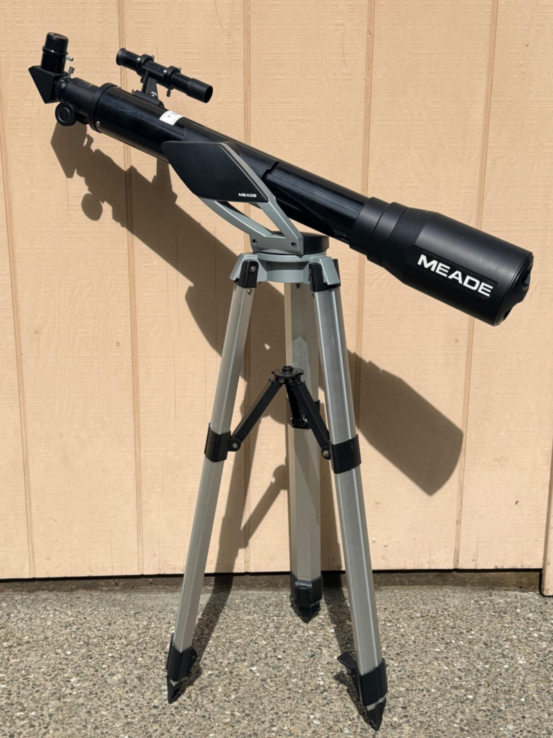 Meade refractor telescope, likely the Meade Infinity 70mm model or a similar NG70-SM variant, no identifying information in the telescope. Designed for stargazing and terrestrial viewing. Aperture: 70mm (2.75 inches). Mount Type: Altazimuth mount for easy manual tracking of objects HM 25mm Lightweight and sits on an adjustable tripod Telescope length is 32”