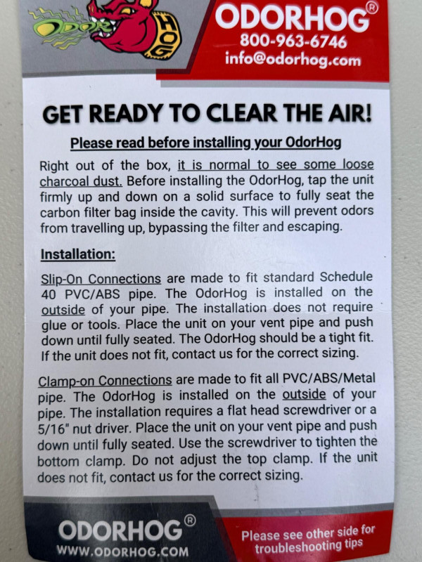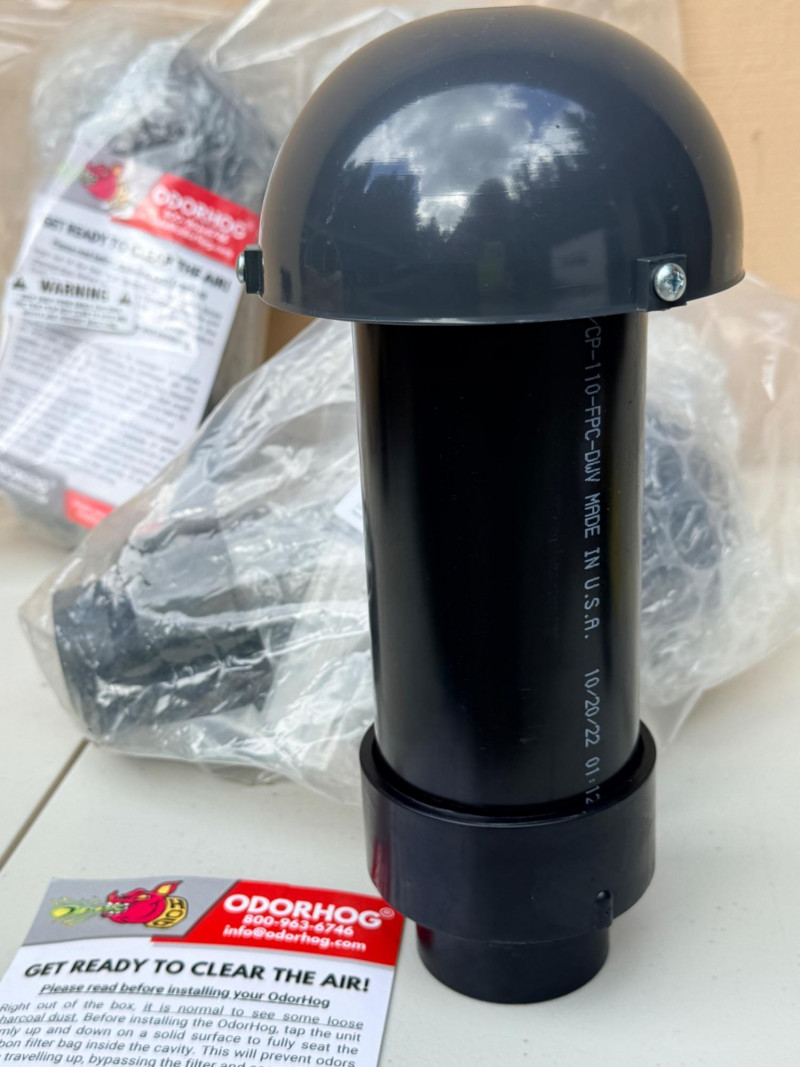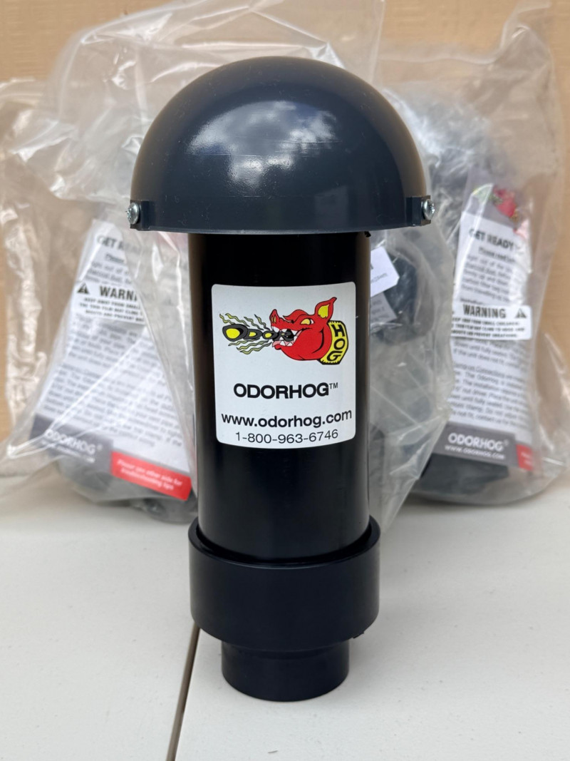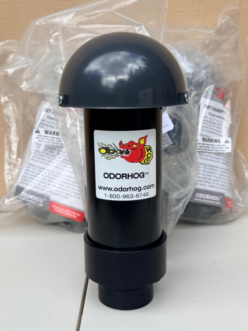 OdorHog Vent Stack Pipe Filter used to eliminate outdoor septic and sewer odors from plumbing roof vents. Technology: Uses replaceable activated charcoal bags to neutralize odors. Installation: Simple slip-on installation for 2” PVC or ABS pipes, often requiring no tools or glue. Design: Features a heavy-duty ABS "mushroom cap" to protect the filter from weather elements like UV rays, hail, and snow.