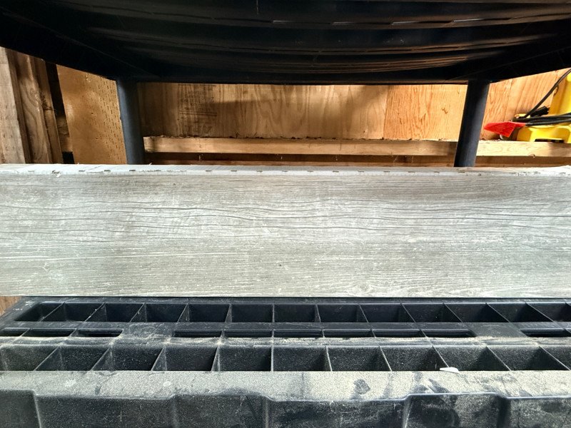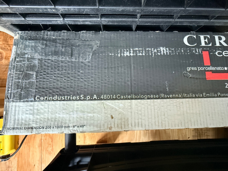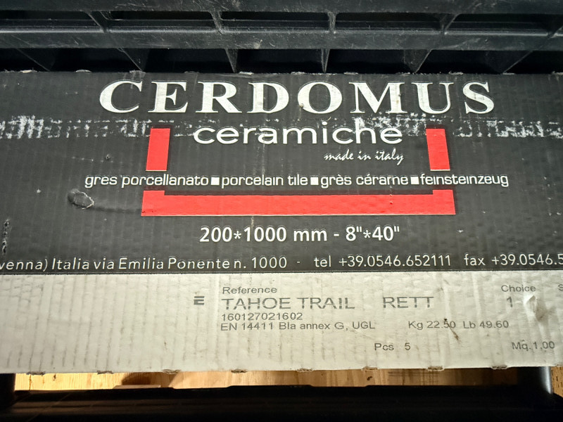 (16) Cerdomus Wood Look Italian Tile in light gray. 8"x40" each 3 Full boxes plus 1 tile. Tahoe Trail with wood grain texture.