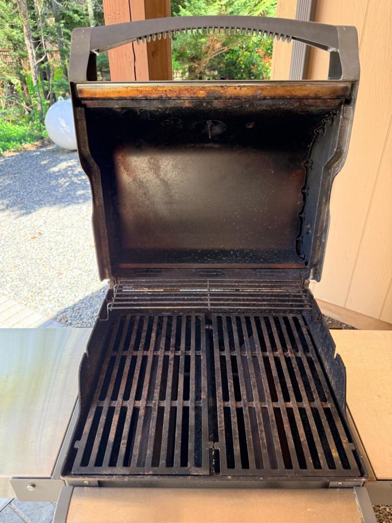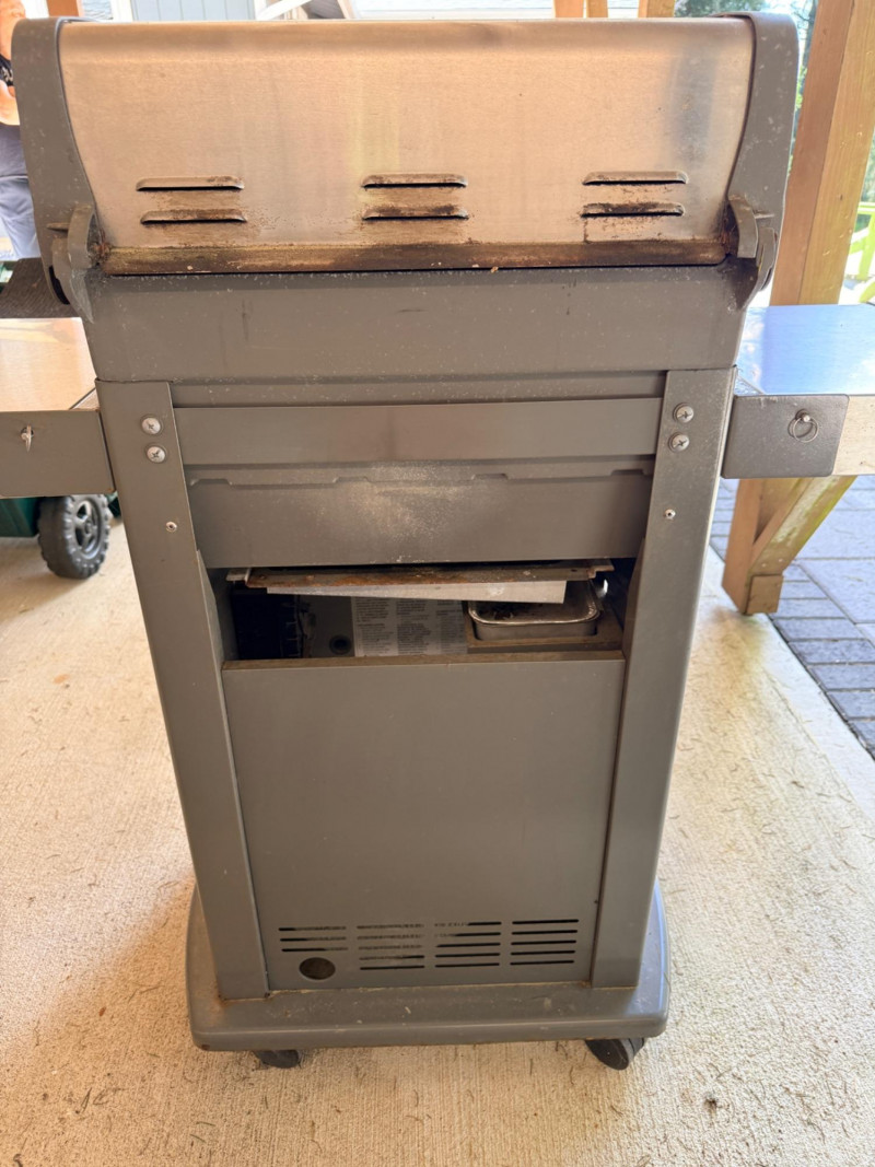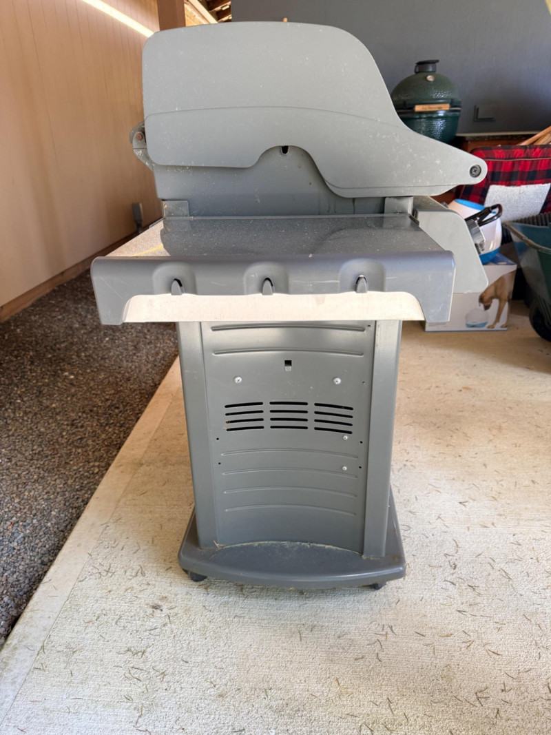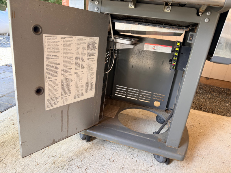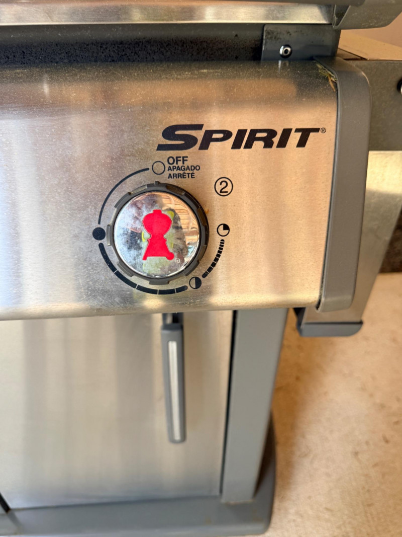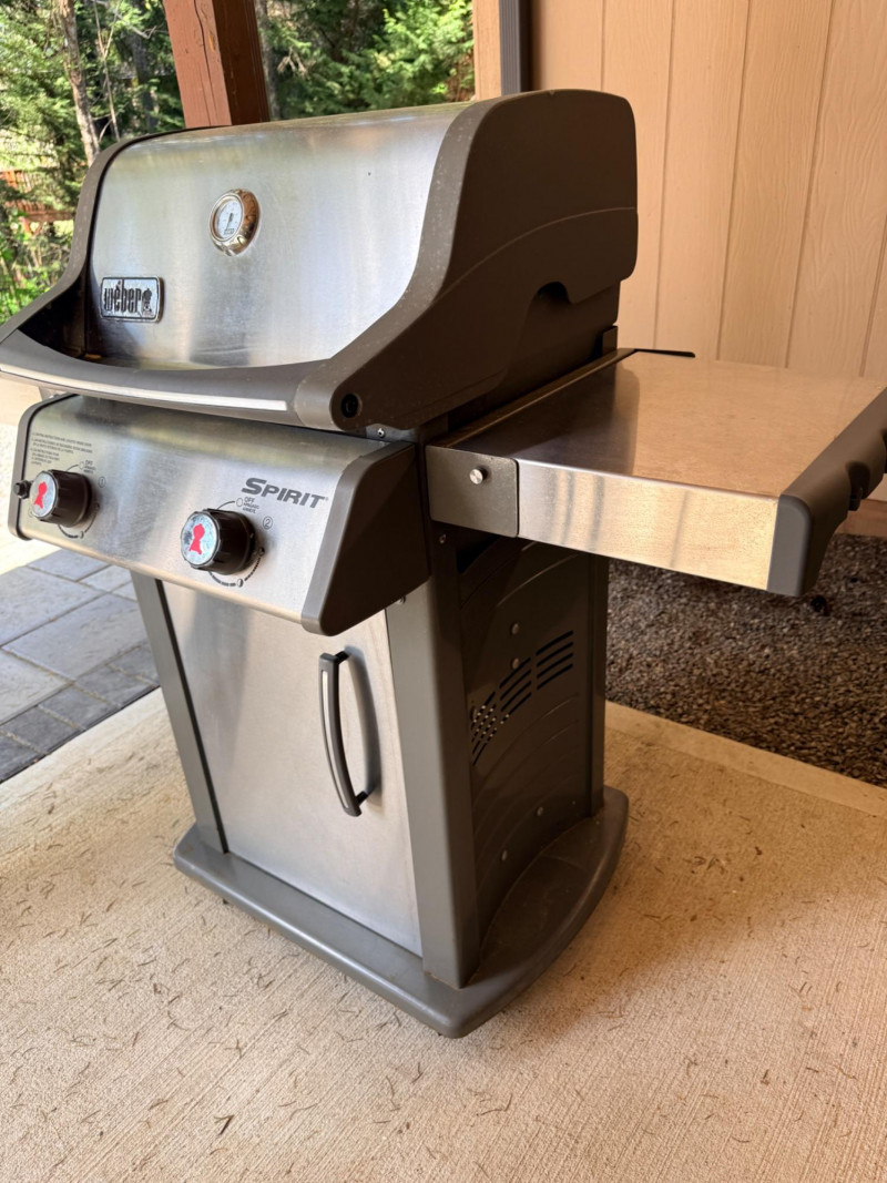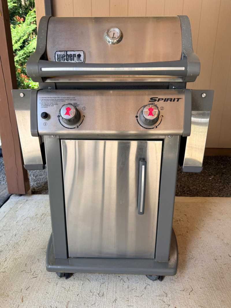 Weber Spirit S-210 2 Burner Propane Grill. Burners: Two stainless steel burners providing 26,500 BTUs per hour. Cooking Area: 360 square inches of primary cooking space, plus a 90 square inch warming rack. Grates: Porcelain-enameled, cast-iron cooking grates designed to retain heat. Features: Includes a built-in thermometer, fold-down side tables, and an electronic igniter. No tank. Not tested.