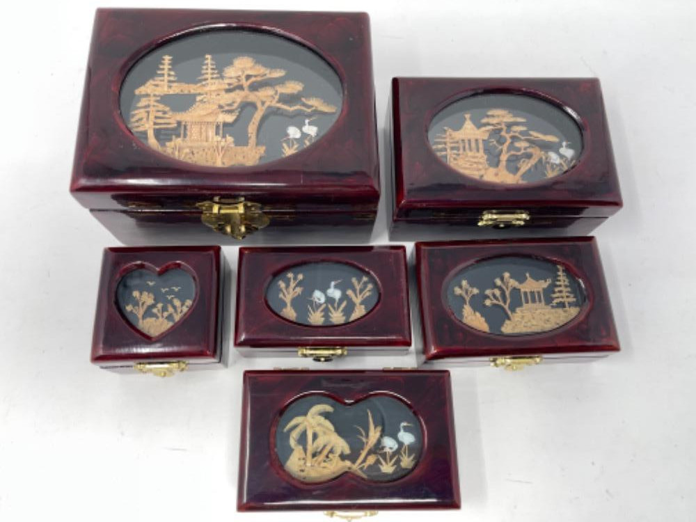 Lot # 134 - 6 Chinese Lacquer Boxes with Satin Lining Starting Bid: $ 5.00 Bids: This sale will end in: |