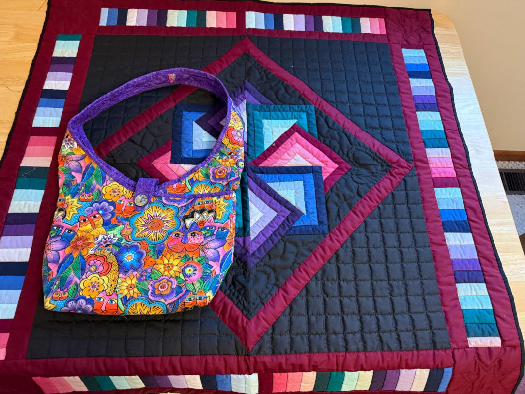 Lot # 174 - Pinwheel Wallhanging & Cat Quilted Shoulder Bag Starting Bid: $ 5.00 Bids: This sale will end in: |