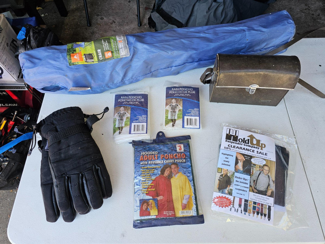 Lot # 257 - Camp Chair, Binoculars, Ponchos, Gloves & Suspenders Starting Bid: $ 5.00 Bids: This sale will end in: |