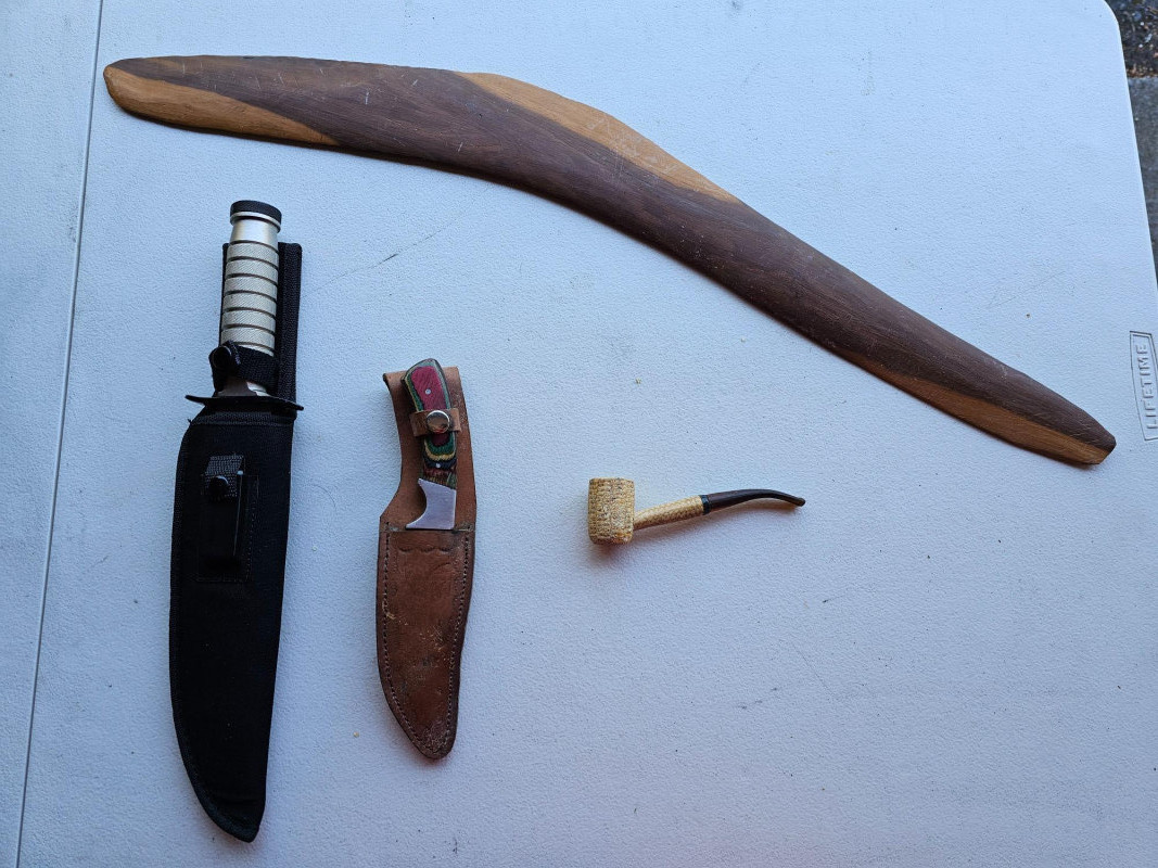 Lot # 214 - Knives, Boomerang & Corn Cob Pipe Starting Bid: $ 5.00 Bids: This sale will end in: |